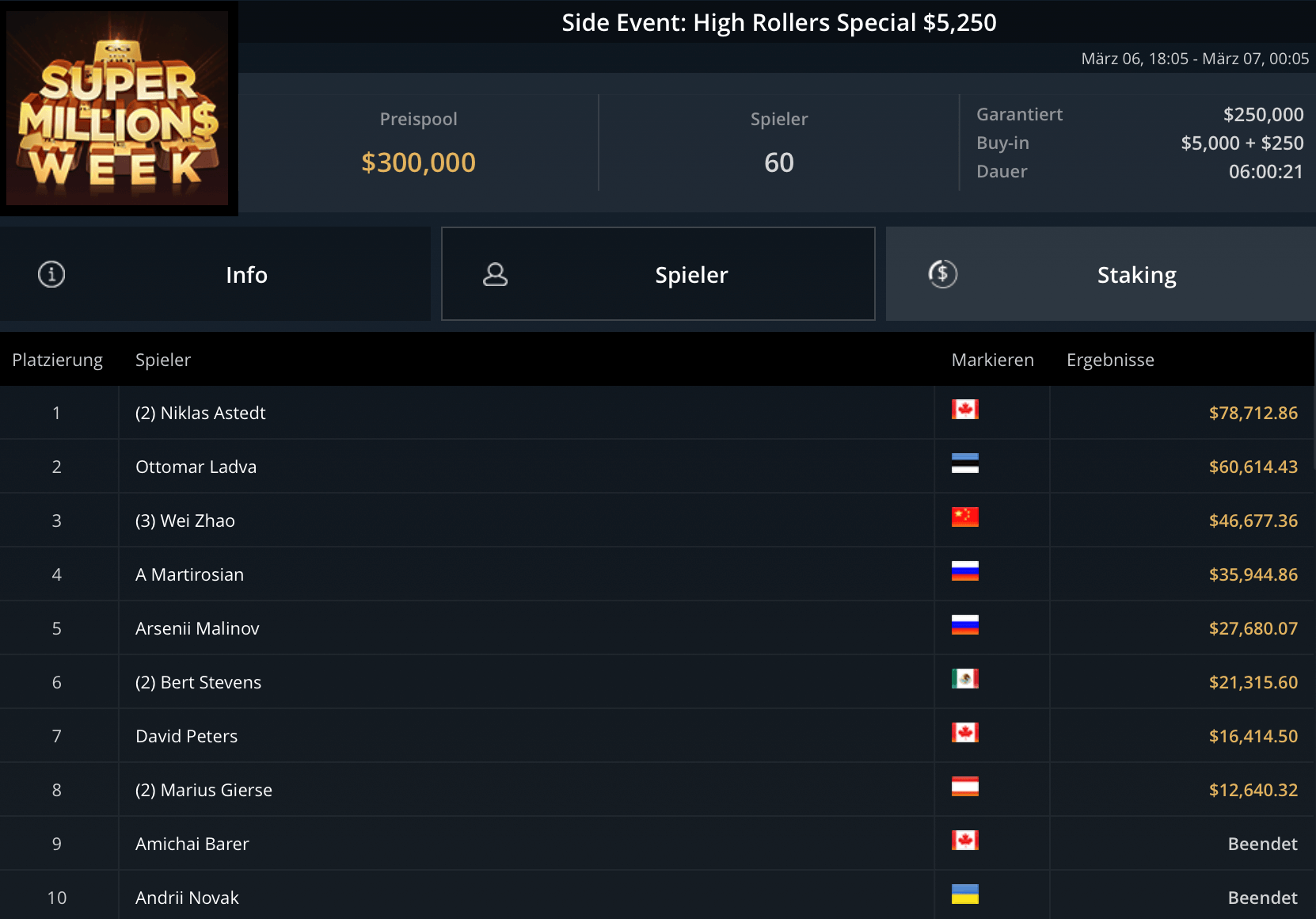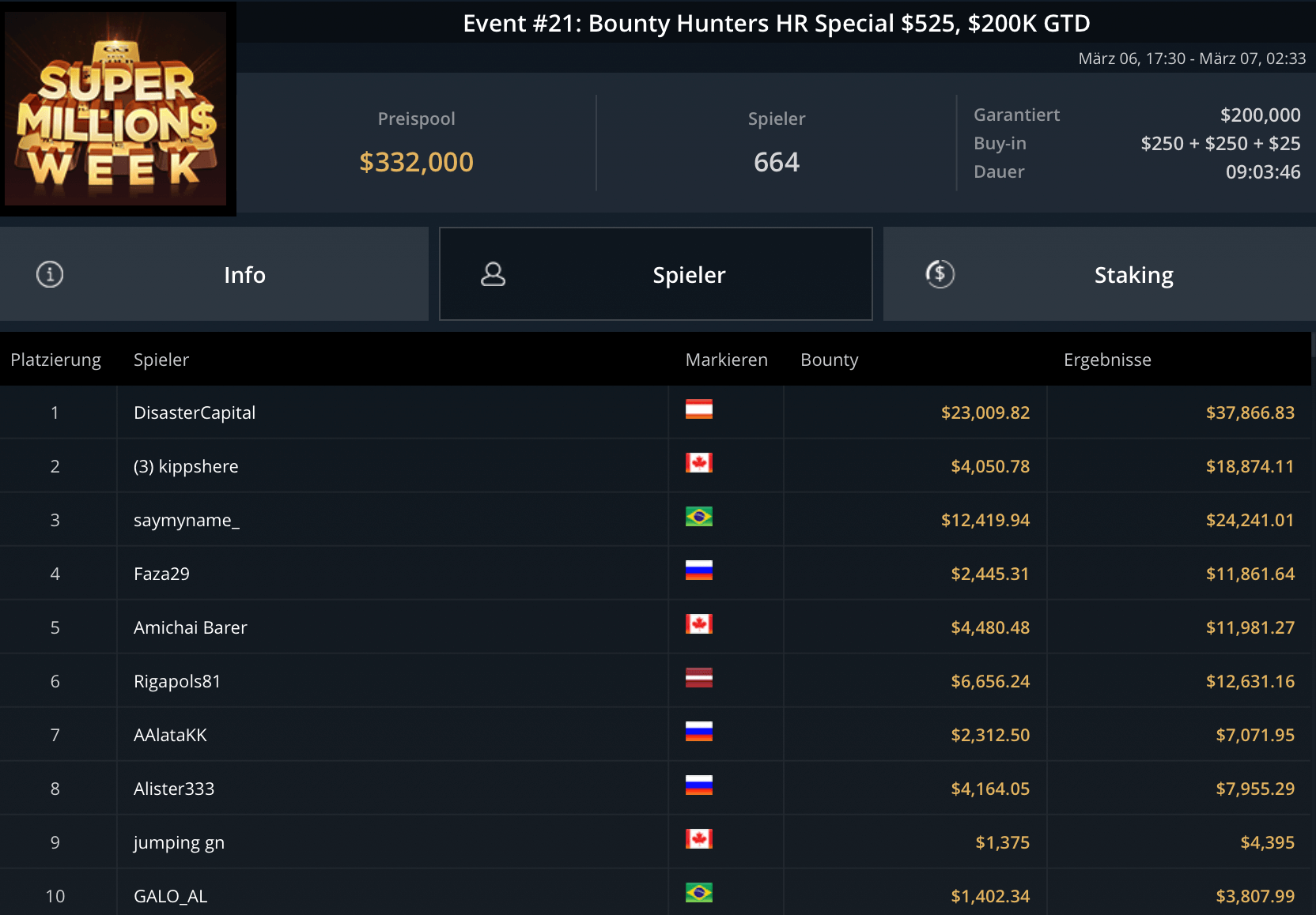 „DisasterCapital“ gewann Event #21, das Bounty Hunters HR Special $525 mit $200.000 Garantie. Der Österreicher setzte sich nach neun Stunden im Heads-Up durch und durfte $37.866 aus dem Turnier mitnehmen.