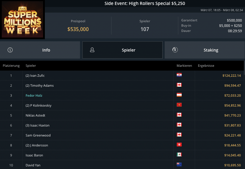 Beim High Rollers Special konnte Fedor Holz einen vorderen Platz belegen. Er gewann $72.033 beim Special $5.250 mit 107 Spielern. Nur Timothy Adams — Platz 2 für $94.594 — und Ivan Zufic waren besser. Zufics Sieg brachte $124.222.