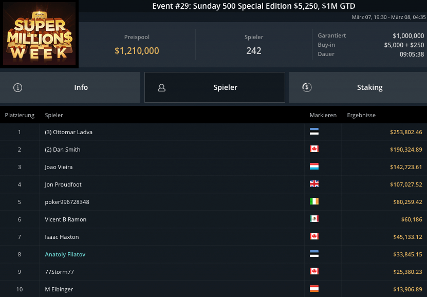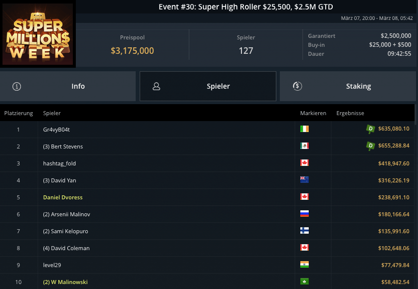 Absurde Preise wurden bei Event #30 Super High Roller $25.500 verteilt. $3.175.000 gab es im Preispool. „Gr4vyb04t“ dealte mit Bert Stevens im Heads-Up, im Deal ging es bereits um mehr als $1 Mio. „Gr4vyb04t“ gewann das Turnier für $635.080, Stevens musste auf den Sieg verzichten, freute sich mit $655.288 um nochmal mehr Geld. Wiktor Malinowski wurde Zehnter für $58.482.