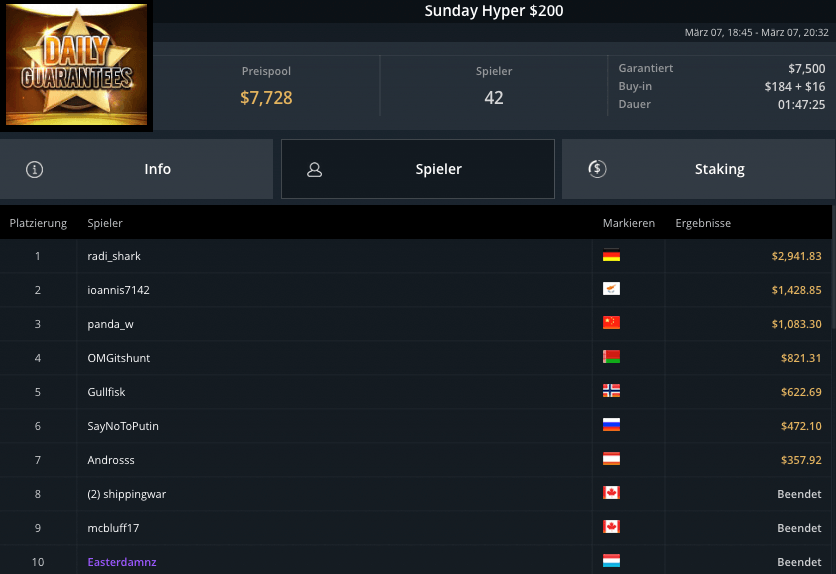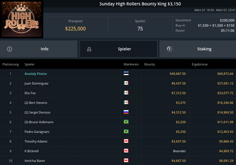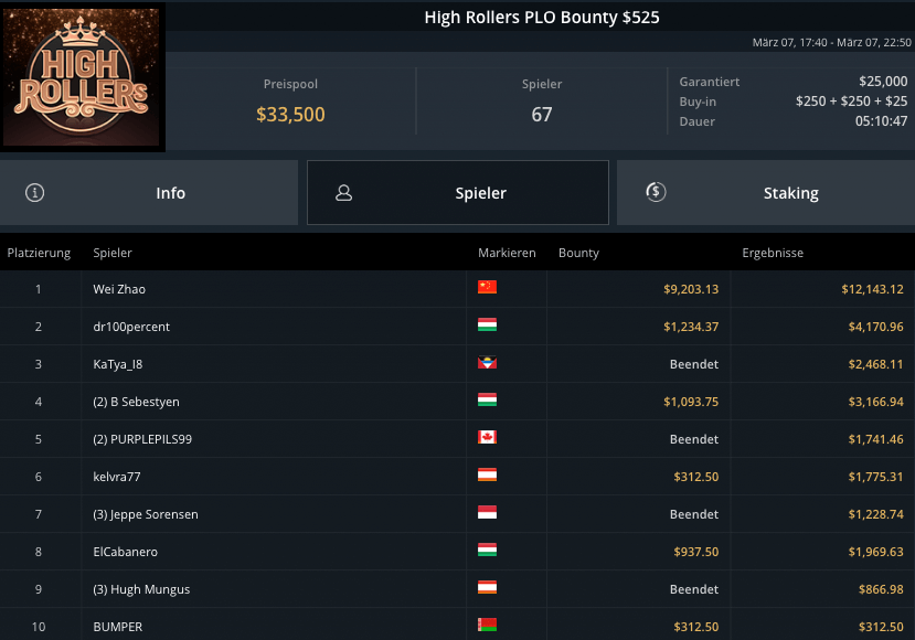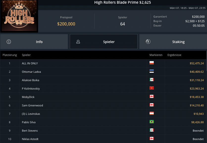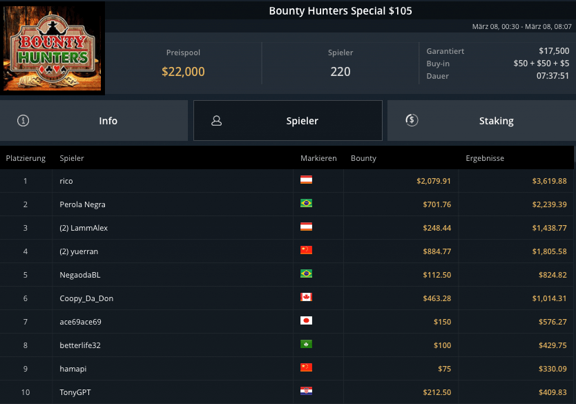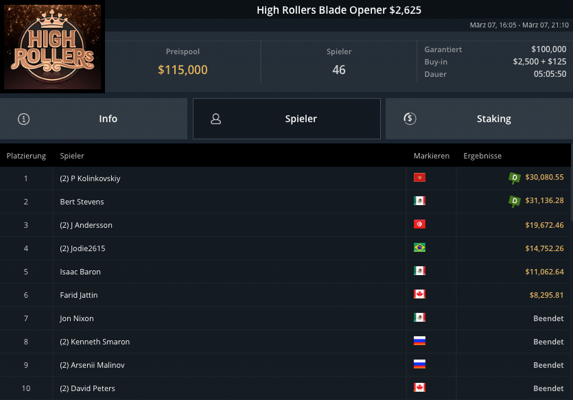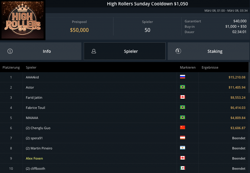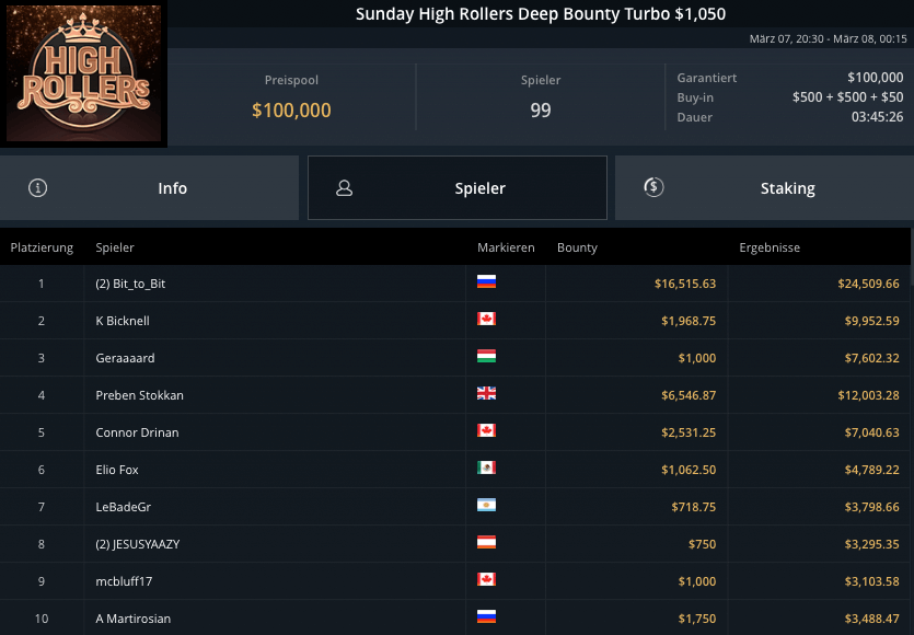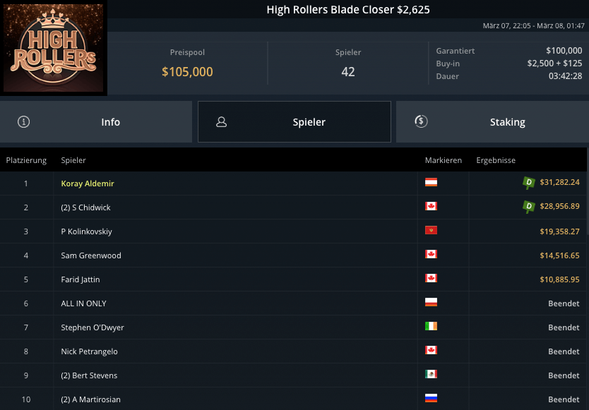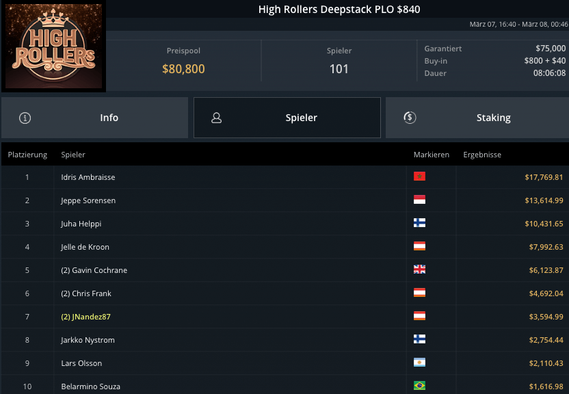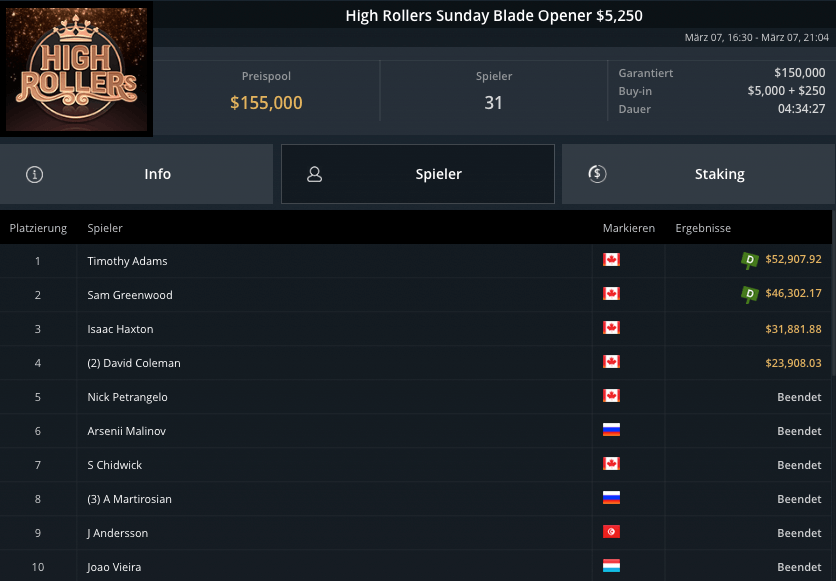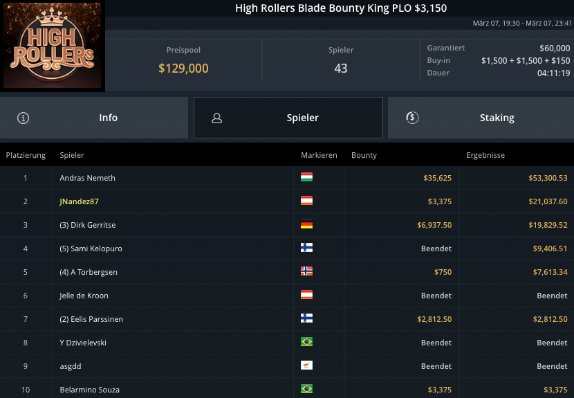 Auch die PLO-Spieler waren am Sonntag unterwegs, beim Blade Bounty King PLO $3.150 kamen 43 Spieler zusammen. $129.000 waren vakant, Andras Nemeth schnappte sich den Sieg für krasse $53.300. Fernando „JNandez87“ Habegger wurde Runner-Up, holte wegen wenig Bounties aber nur $21.037. Dirk Gerritse aus Deutschland gewann auf Platz 3 $19.829.