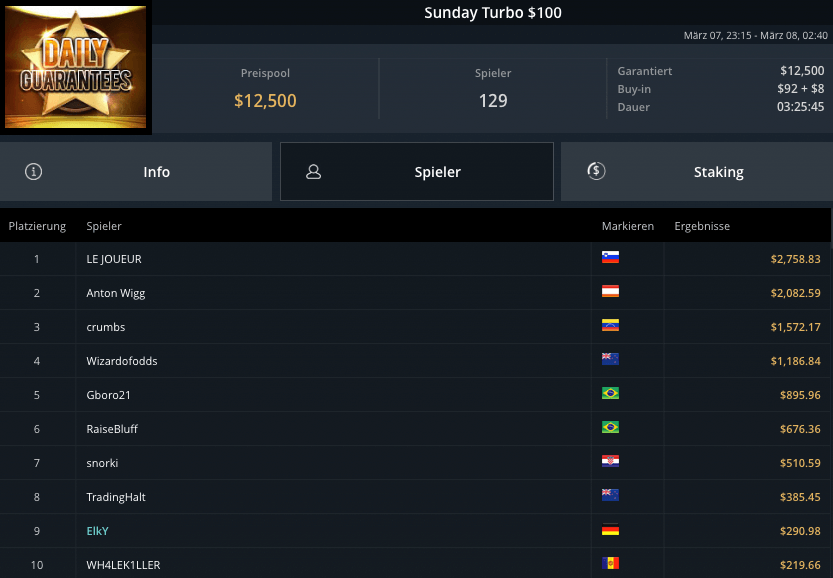 Auch für Anton Wigg reichte es nur für den Runner-Up. Beim Sunday Turbo $100 cashte er für $2.082, Gewinner wurde „LE JOUEUR“ für $2.758.