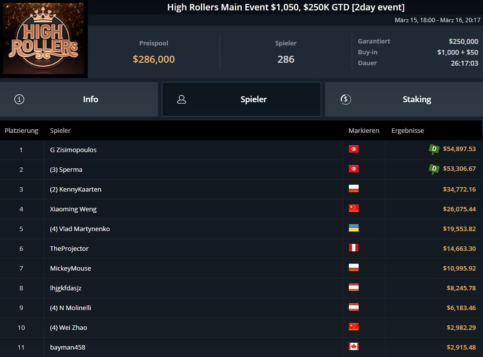 Wie gewohnt wurde der Finaltag des am Montag gestarteten $1.050 High Rollers Main Event gespielt. Dort kämpften 17 der ehemals 286 Teilnehmer um den Löwenanteil des $286.000 großen Preispools. Aus unseren Breitengraden war noch „ihjgfdasjz“ (AUT) mit im Rennen um die Siegprämie von $61.834. Alle Finalisten hatten schon $2.786 sicher. Für „ihjgfdasjz“ (AUT) wurde es schließlich der Platz 8 und ein Preisgeld von $8.245. Den Sieg und $54.897 schnappte sich, nach einem Heads-Up Deal, der Grieche Georgios Zisimopoulos.