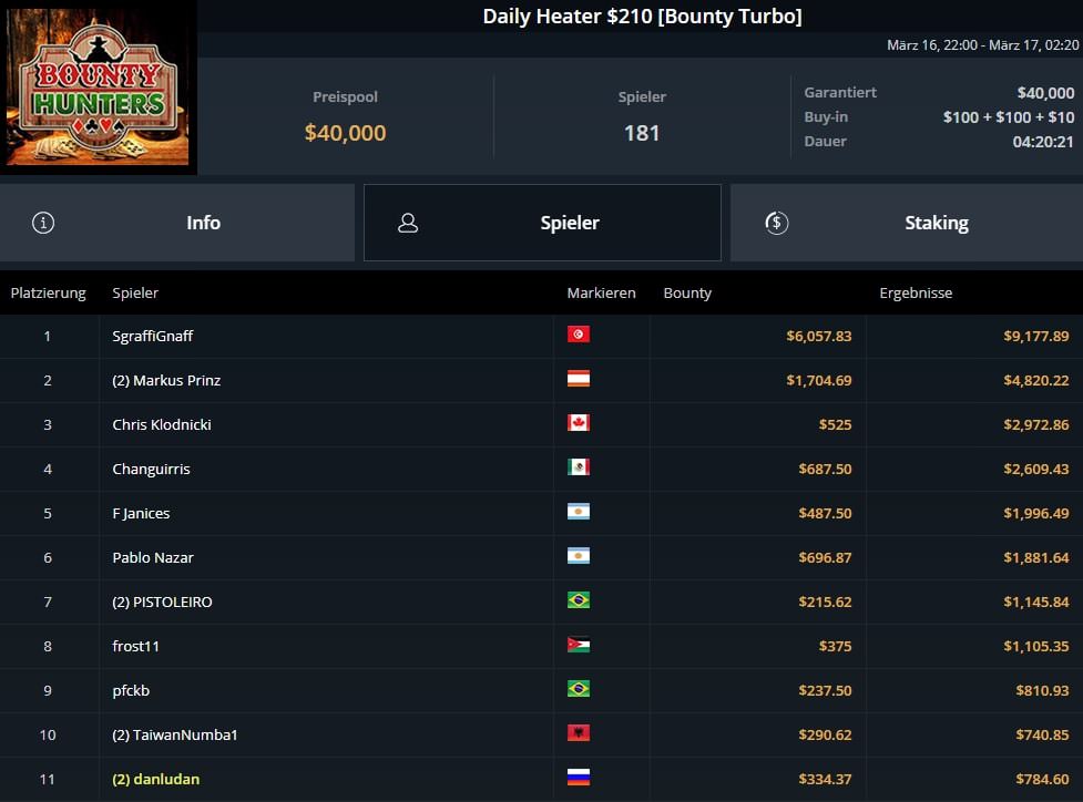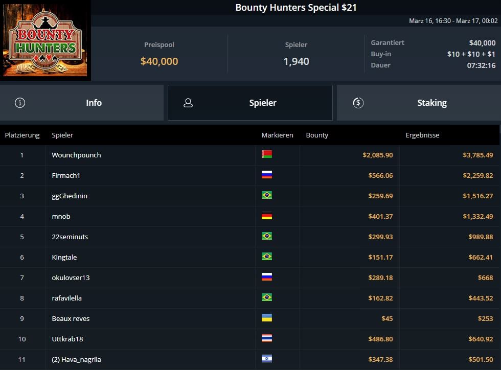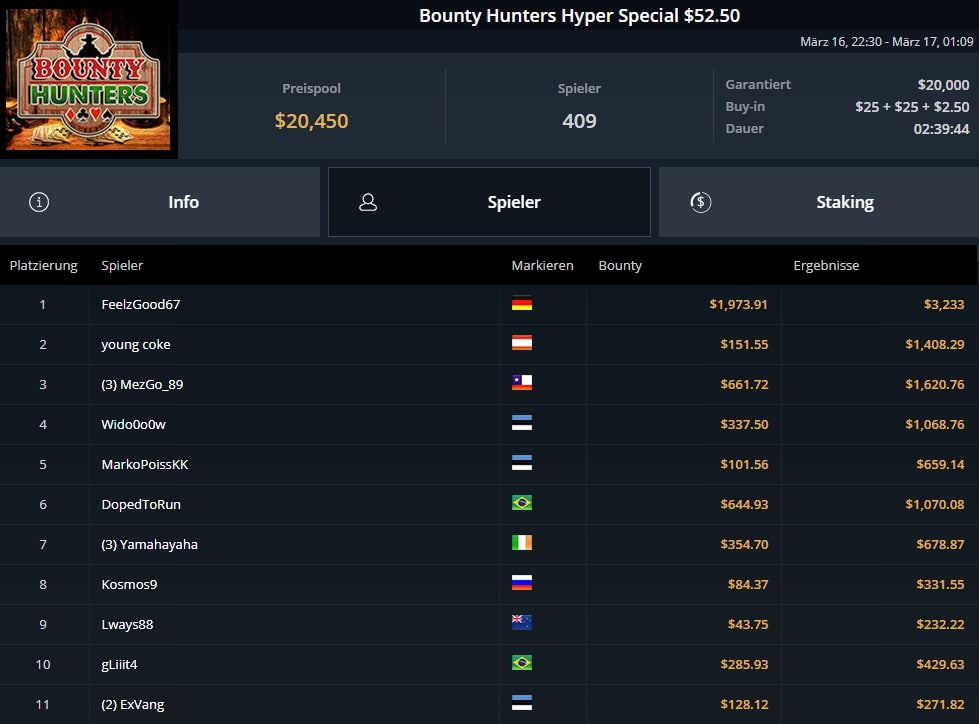 Platz 1 – $52,50 Bounty Hunters Hyper Turbo – „FeelzGood67“ (GER) – $3.233 inkl. $1.973 Bounties