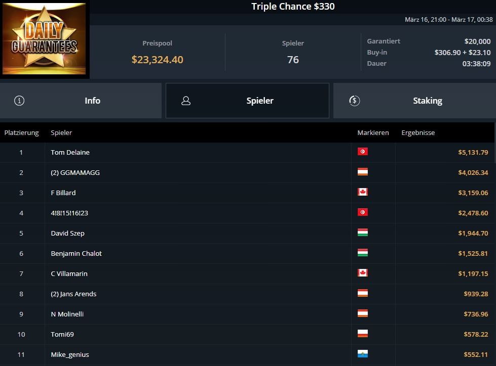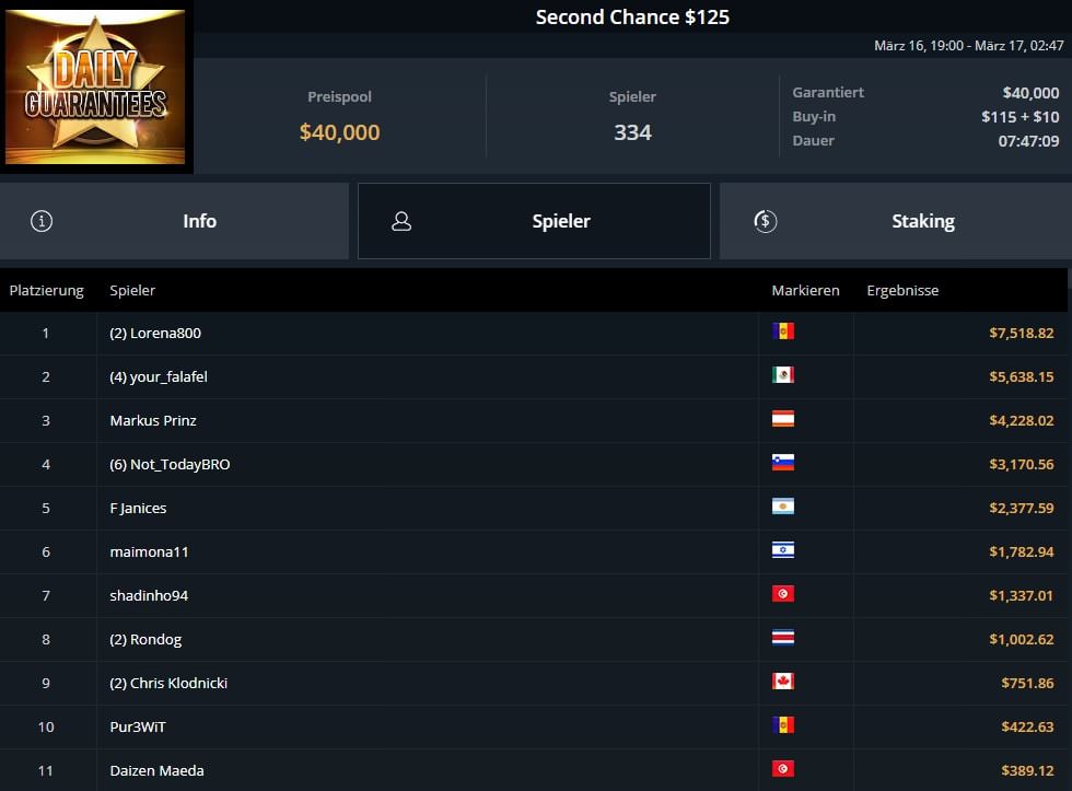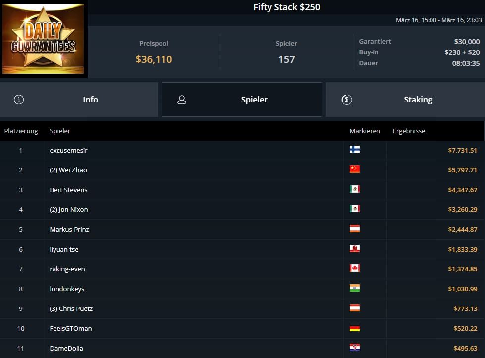 Markus Prinz (GER/AUT) hatte einen sehr guten Lauf am Dienstag. Zwar durfte er keinen Sieg verbuchen aber dafür gab es drei Deep Runs. Beim $210 Daily Heater verpasste er den Sieg nur knapp und wurde Runner-Up für $4.820 inkl. $1.704 Bounties. Das $125 Second Chance beendete er auf Platz 3 und konnte sich über $4.228 freuen. Dann gab es noch einen Platz 5 und $2.444 beim $250 Fifty Stack.