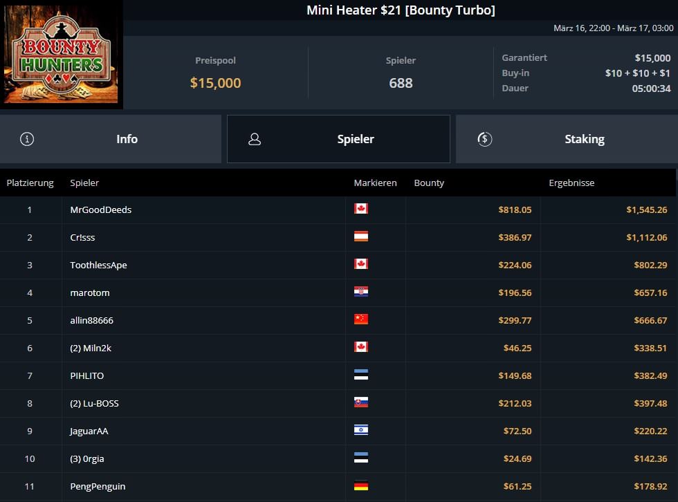 Platz 1 – $52,50 Bounty Hunters Daily Main Event – „EvilMonkey“ (AUT) – $7.329 inkl. $4.123 Bounties