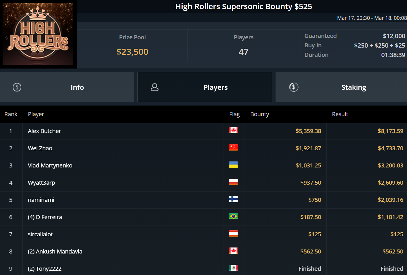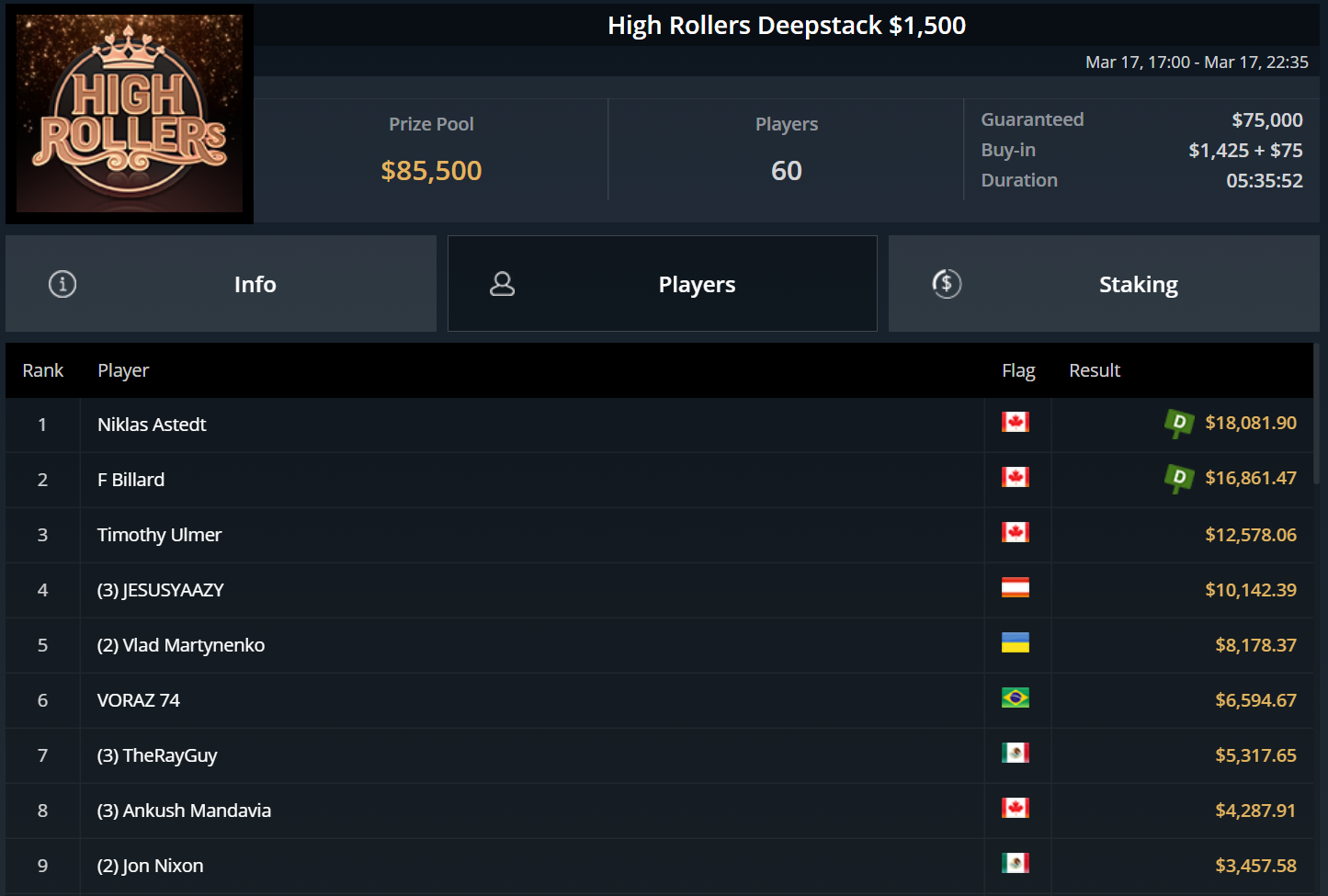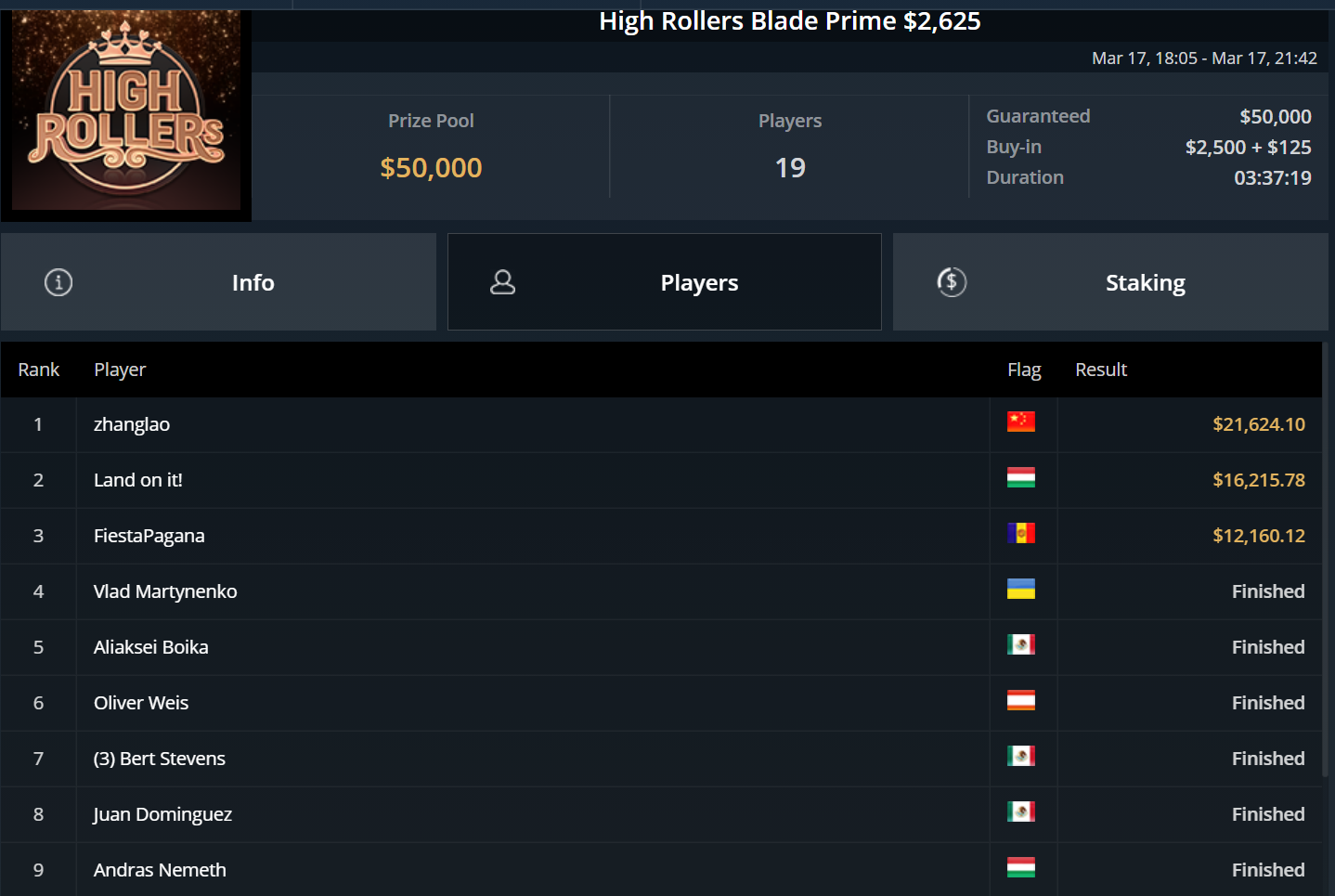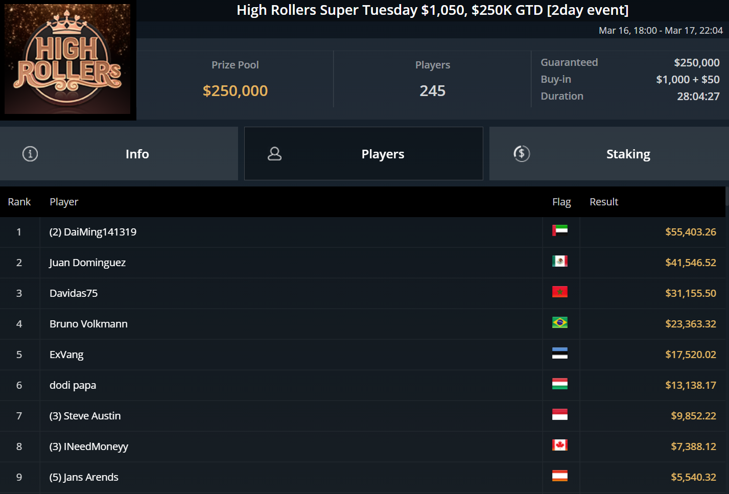 Größter Gewinner des Tages war „DaiMing141319“, der sich den Sieg beim zweitägig angesetzten Super Tuesday sicherte. Er besiegte im Heads-Up Juan Dominguez und kassierte über $55.000.