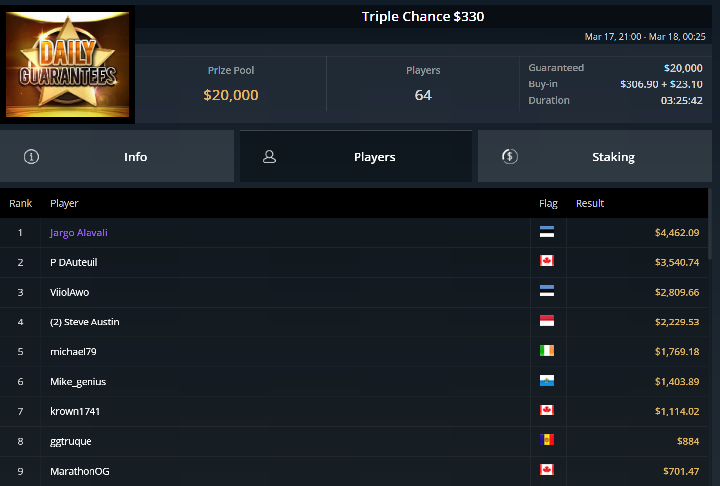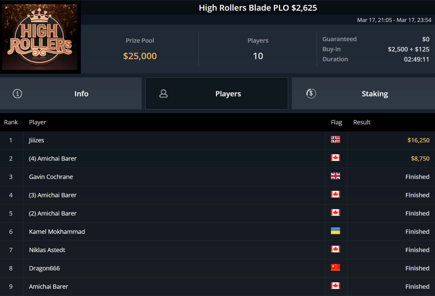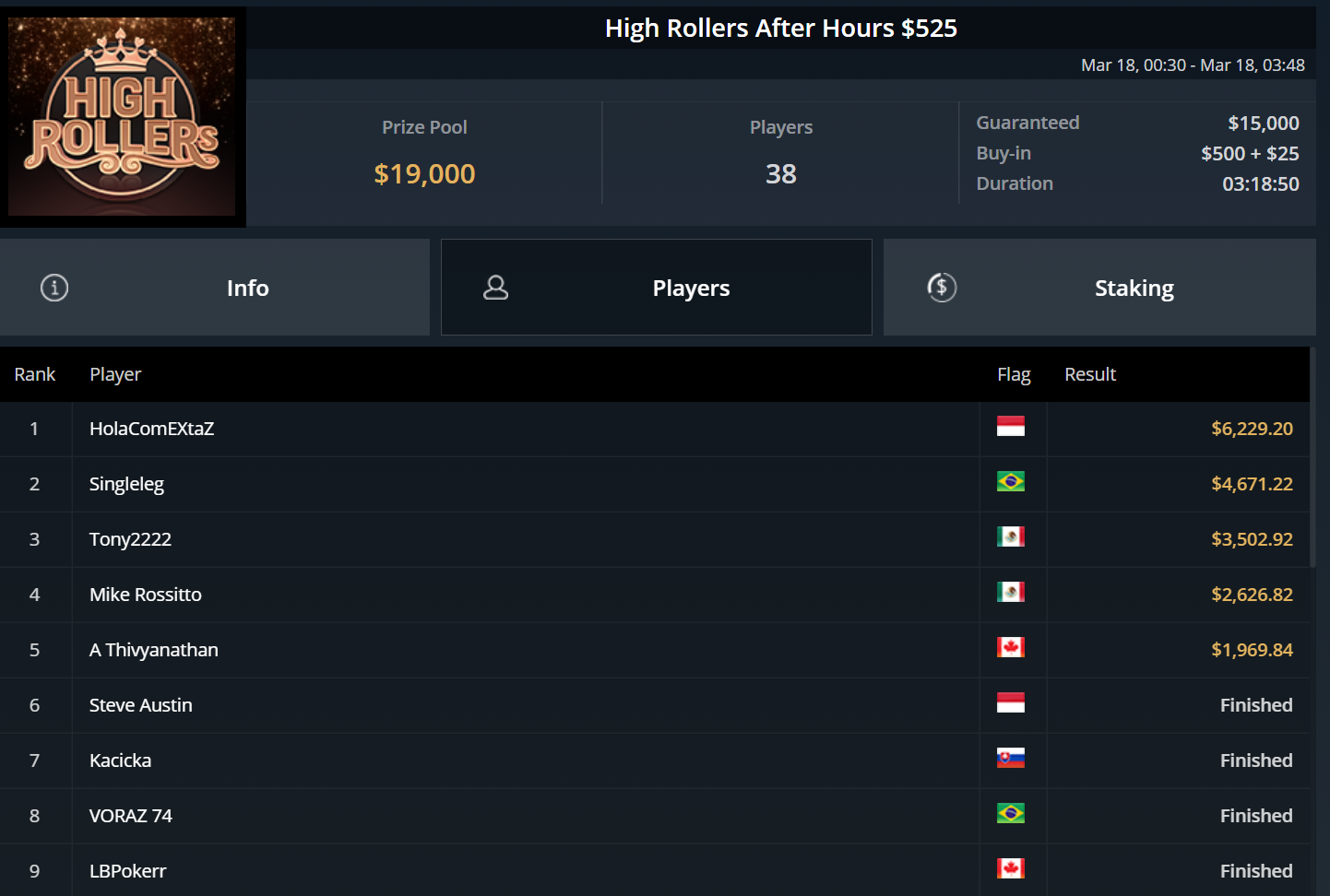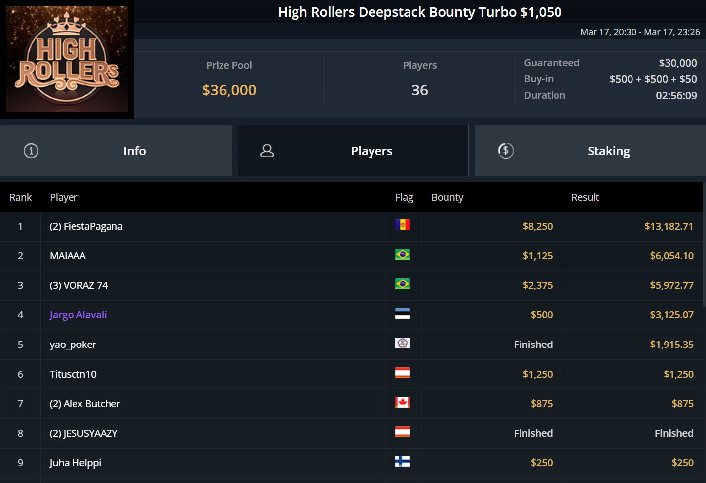 Größter Gewinner des Tages war „DaiMing141319“, der sich den Sieg beim zweitägig angesetzten Super Tuesday sicherte. Er besiegte im Heads-Up Juan Dominguez und kassierte über $55.000.