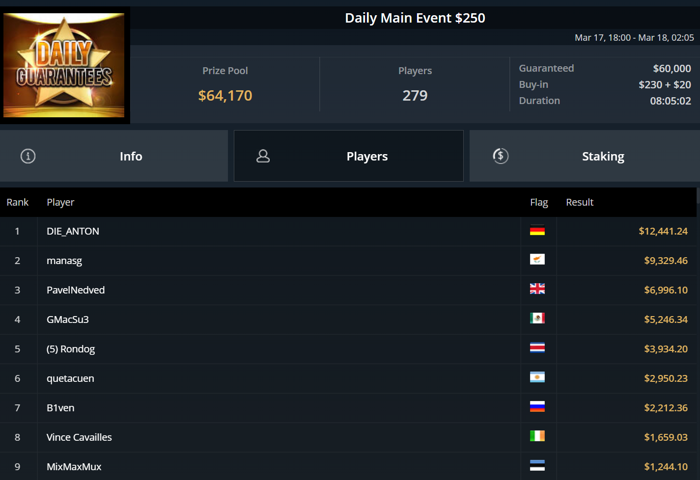 Beim $250 Daily Main Event kauften sich 279 Spieler ein und sorgten so für eine Preisgeldbörse von $64.170.