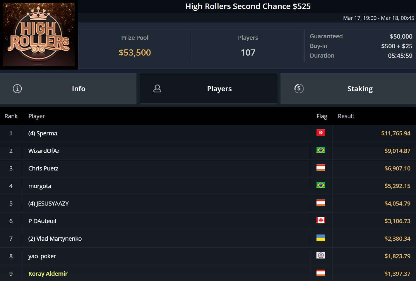 Einen Deep Run legte auch Chris Pütz beim $525 High Rollers Second Chance hin. Während Landsmann Koray Aldemir als Neunter knapp $1.400 gewann, räumte Pütz über $6.900 ab.