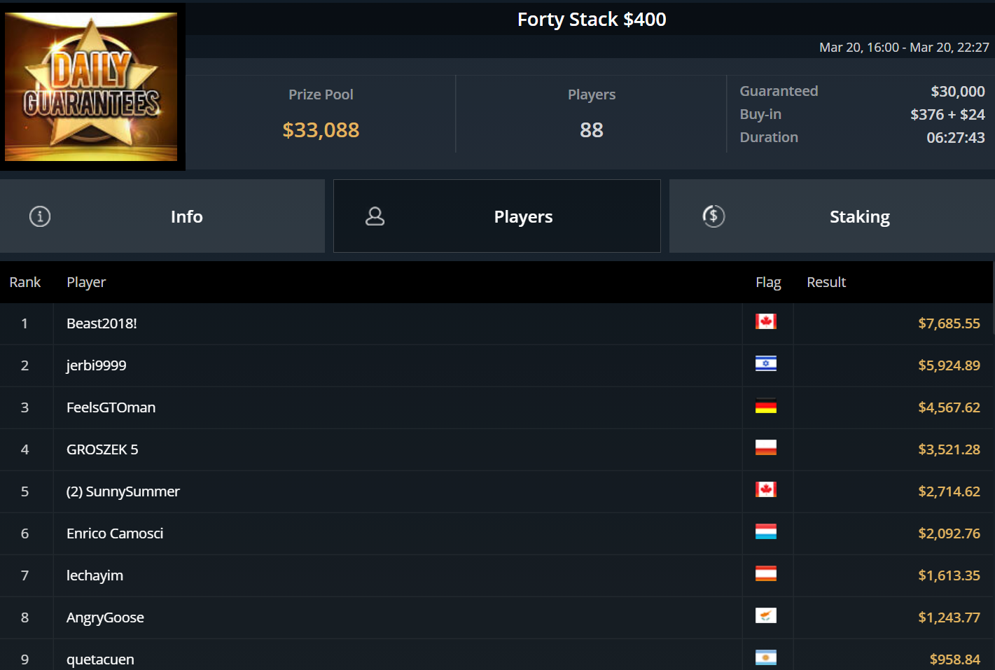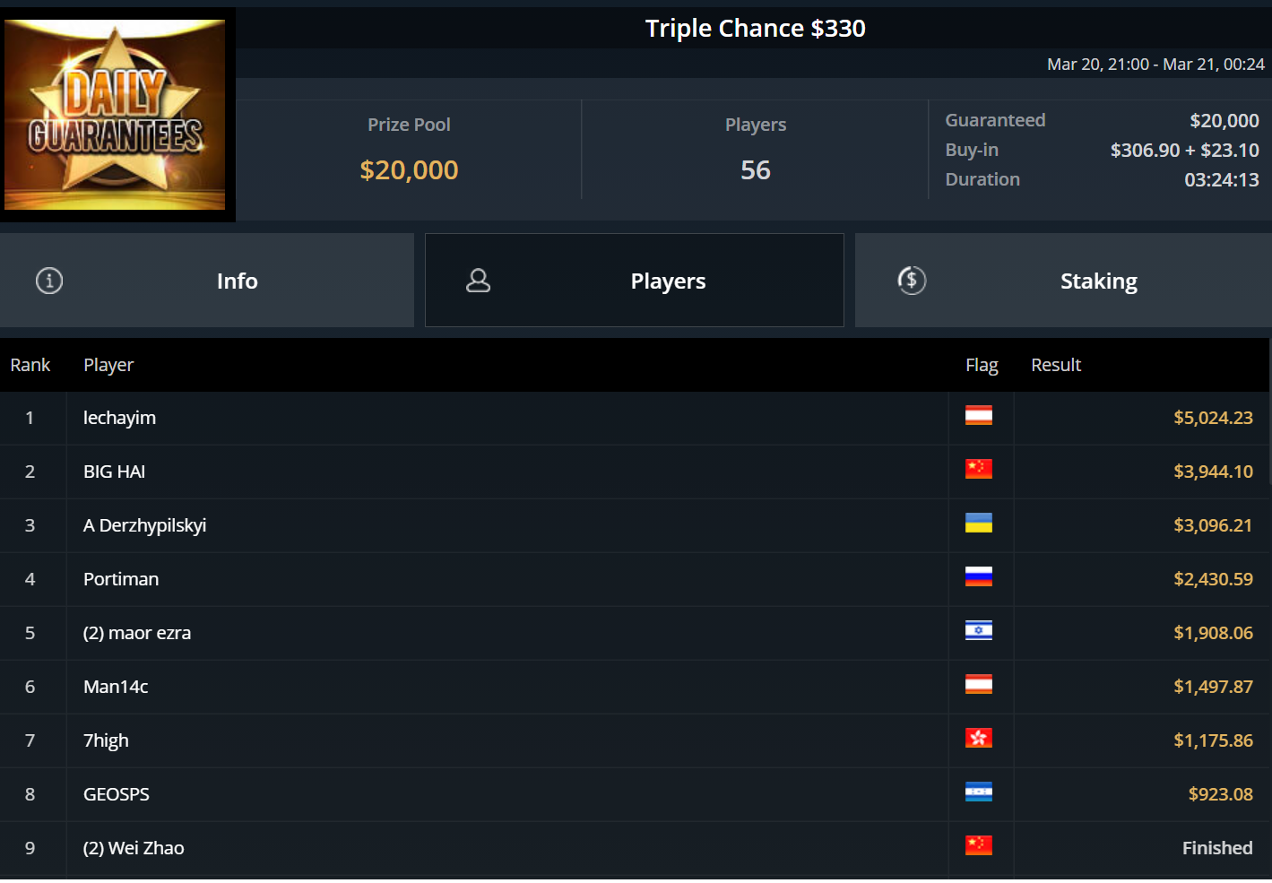 Beim $300 Triple Chance setzte sich Jakob „lechayim“ Miegel gegen 55 Konkurrenten durch und räumte gut $5.000 Preisgeld ab.