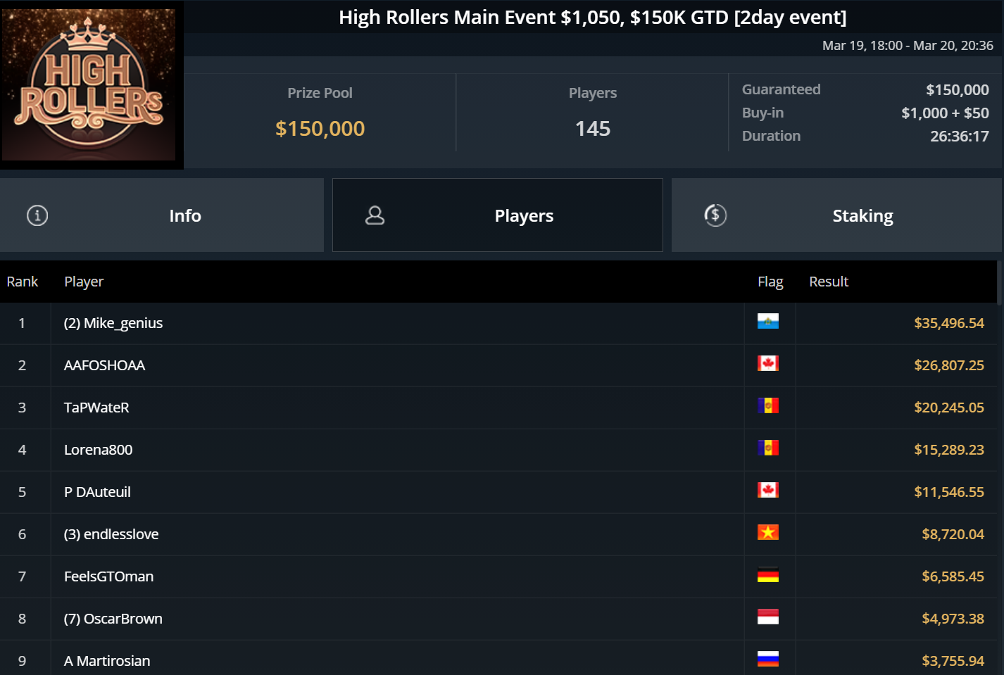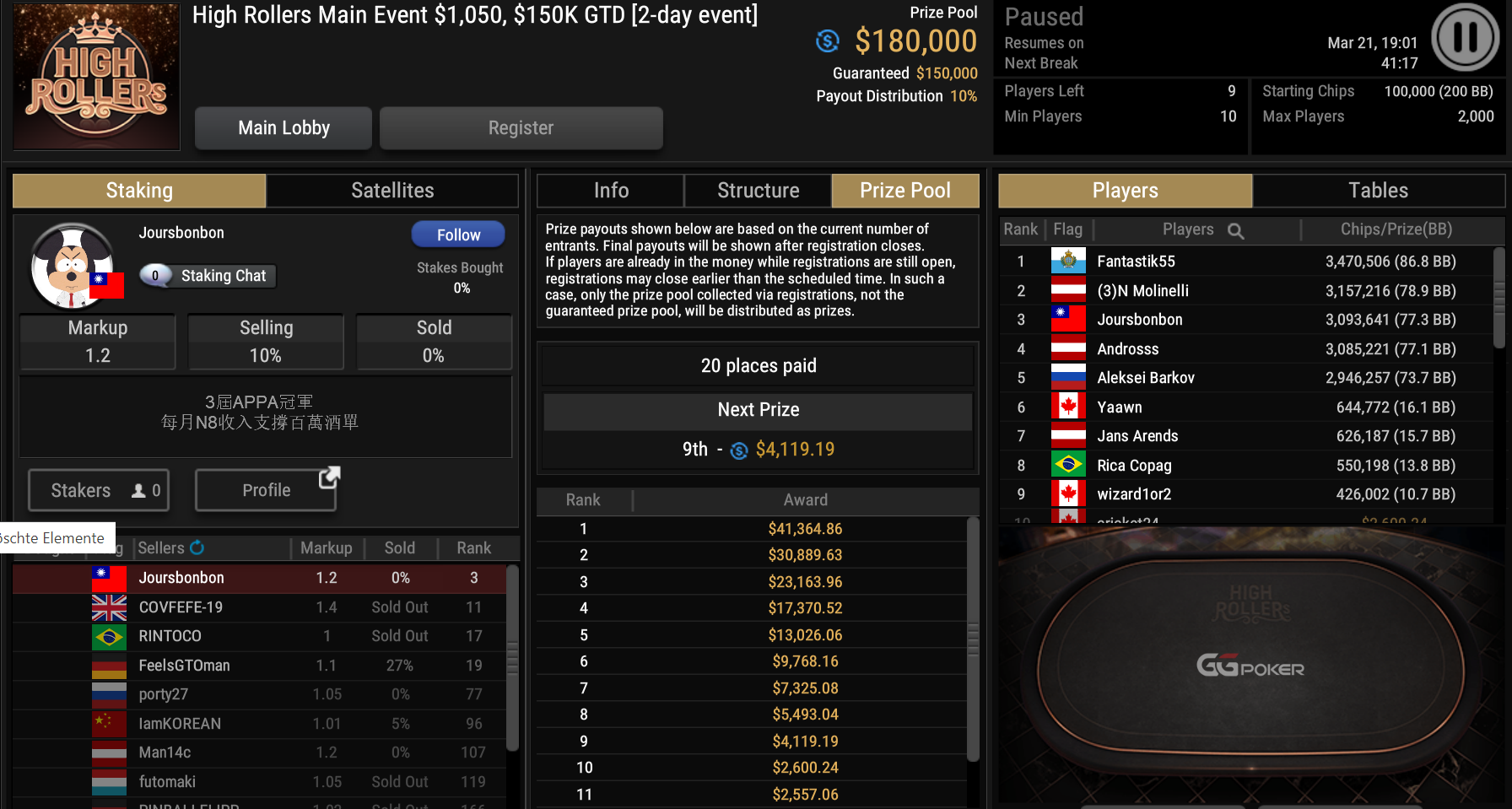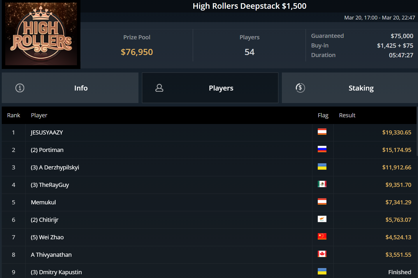 Mann des Tages war aber Jacopo „JESUSYAAZY“ Achile. Der unter österreichischer Flagge spielende Österreicher gewann das $250 Daily Main Event für gut $10.000 und ließ beim beim $1.500 High Rollers Deepstack einen zweiten Sieg folgen, für den es weitere knapp $20.000 Preisgeld gab.