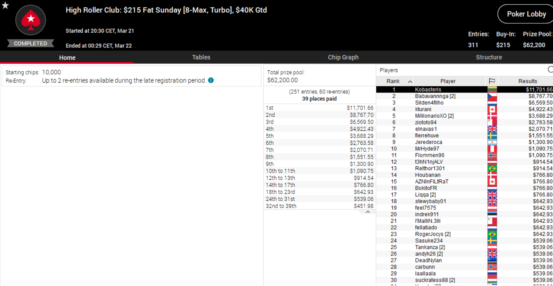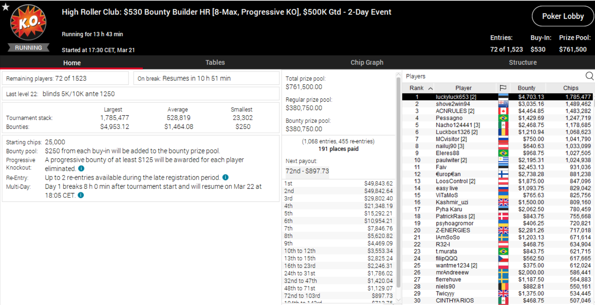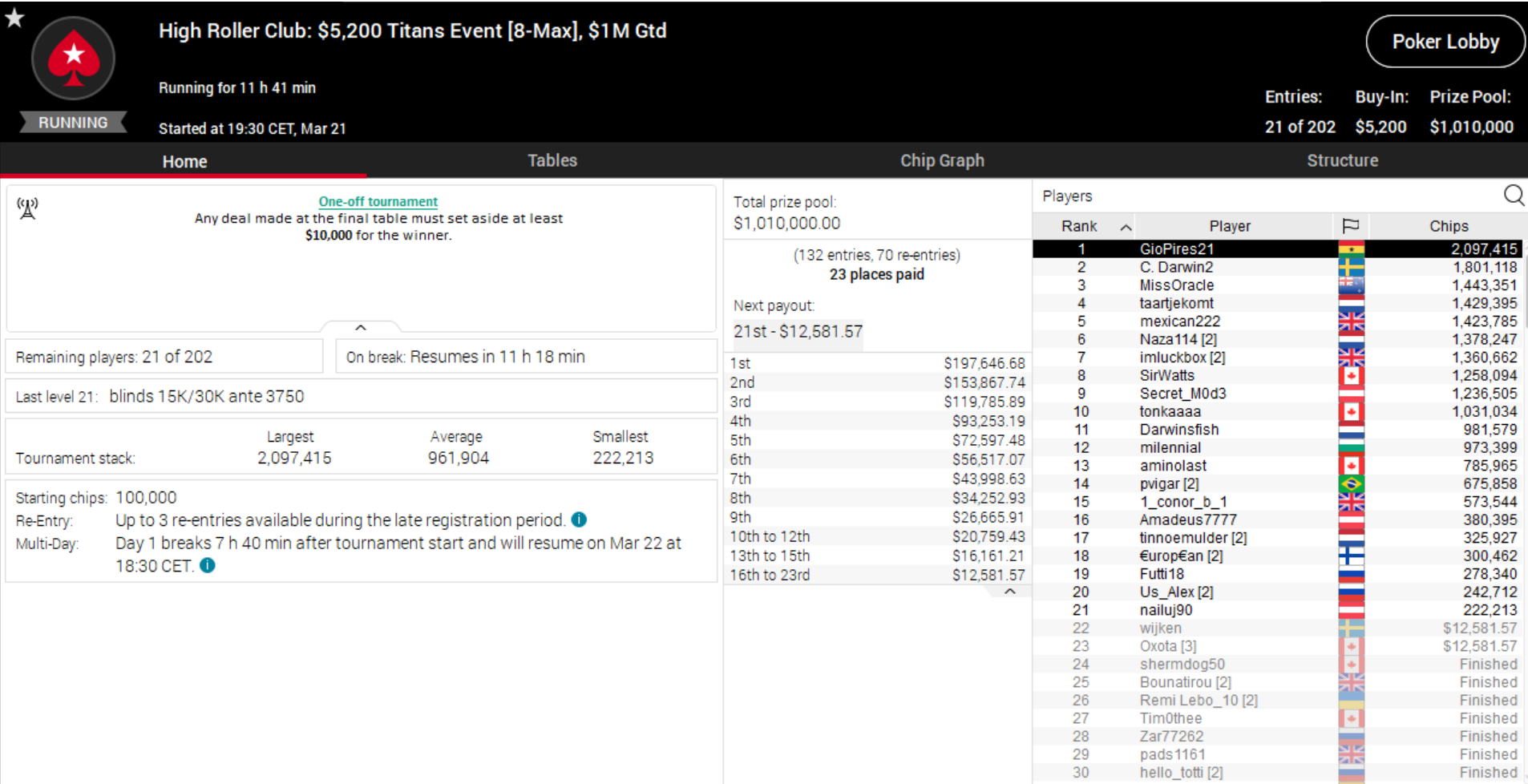 Nicht ganz so gut sieht es beim $5.200 Titans Event aus, wo 21 Spieler den Sprung in Tag 2 schafften. Mit dabei ist auch hier Julian „nailuj90“ Stuer, außerdem „Amadeus7777“, der als Sechzehnter sogar die etwas besseren Chancen hat.