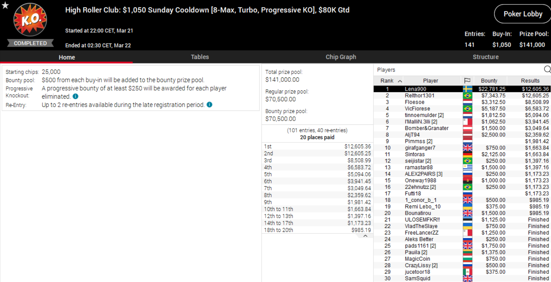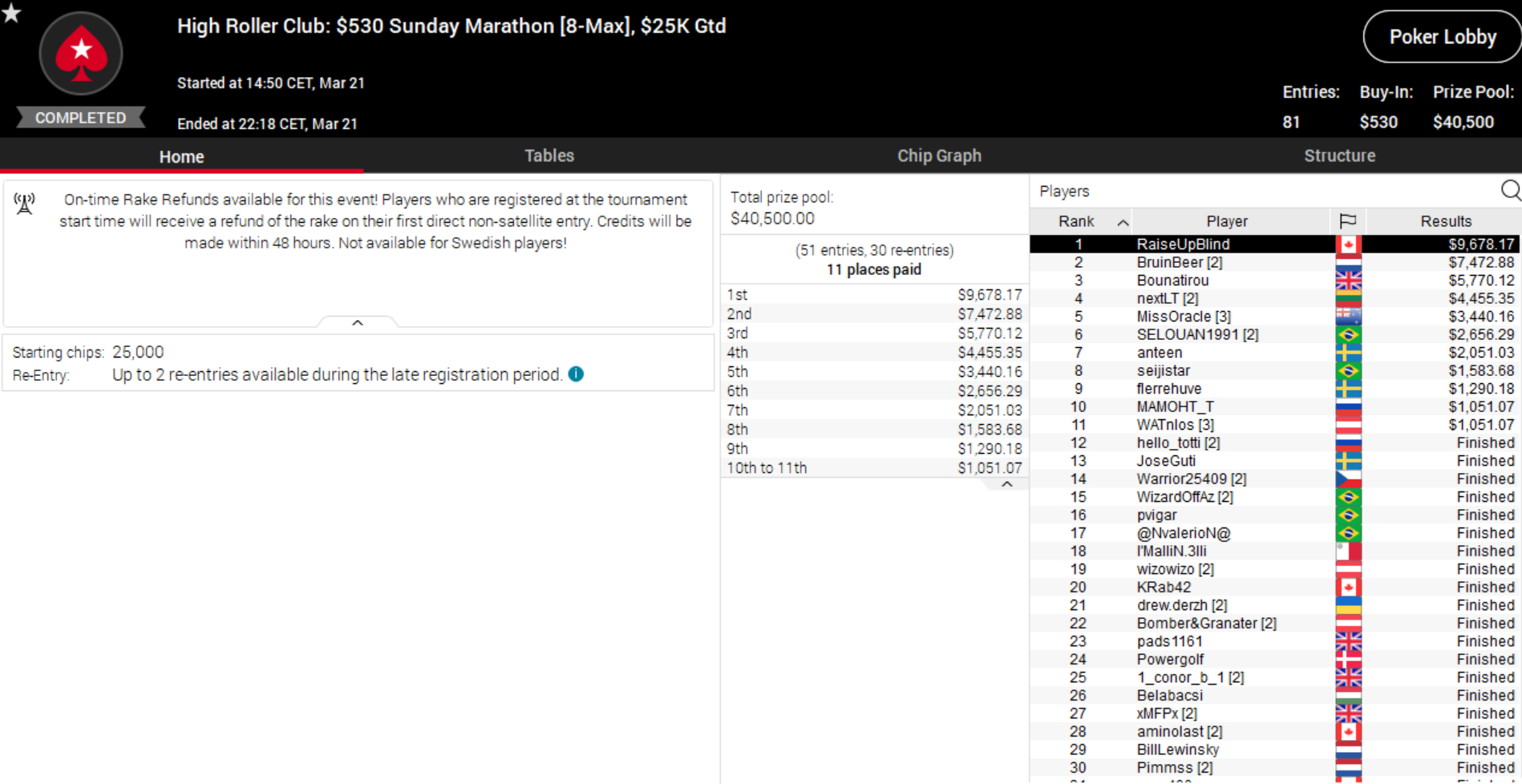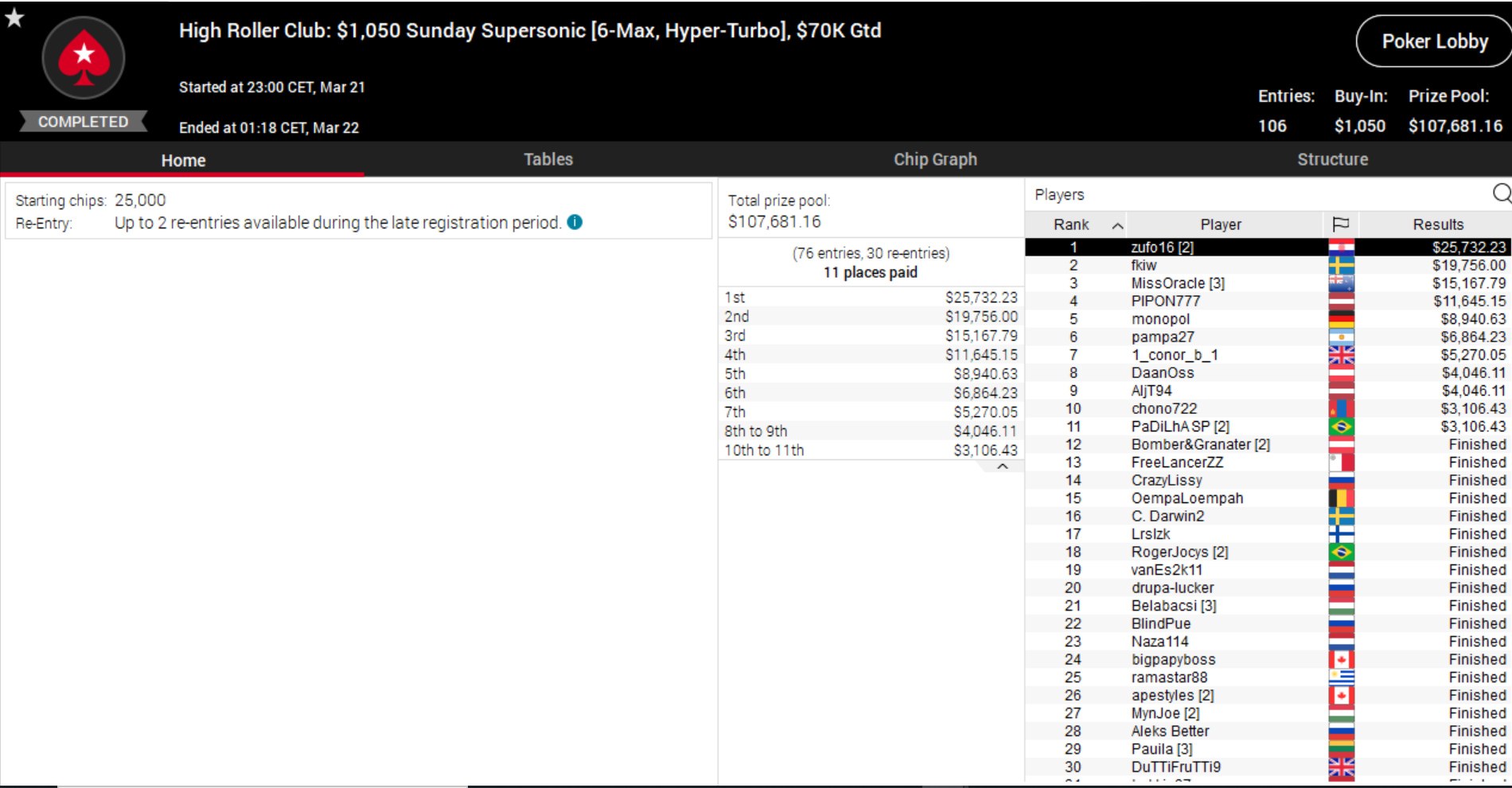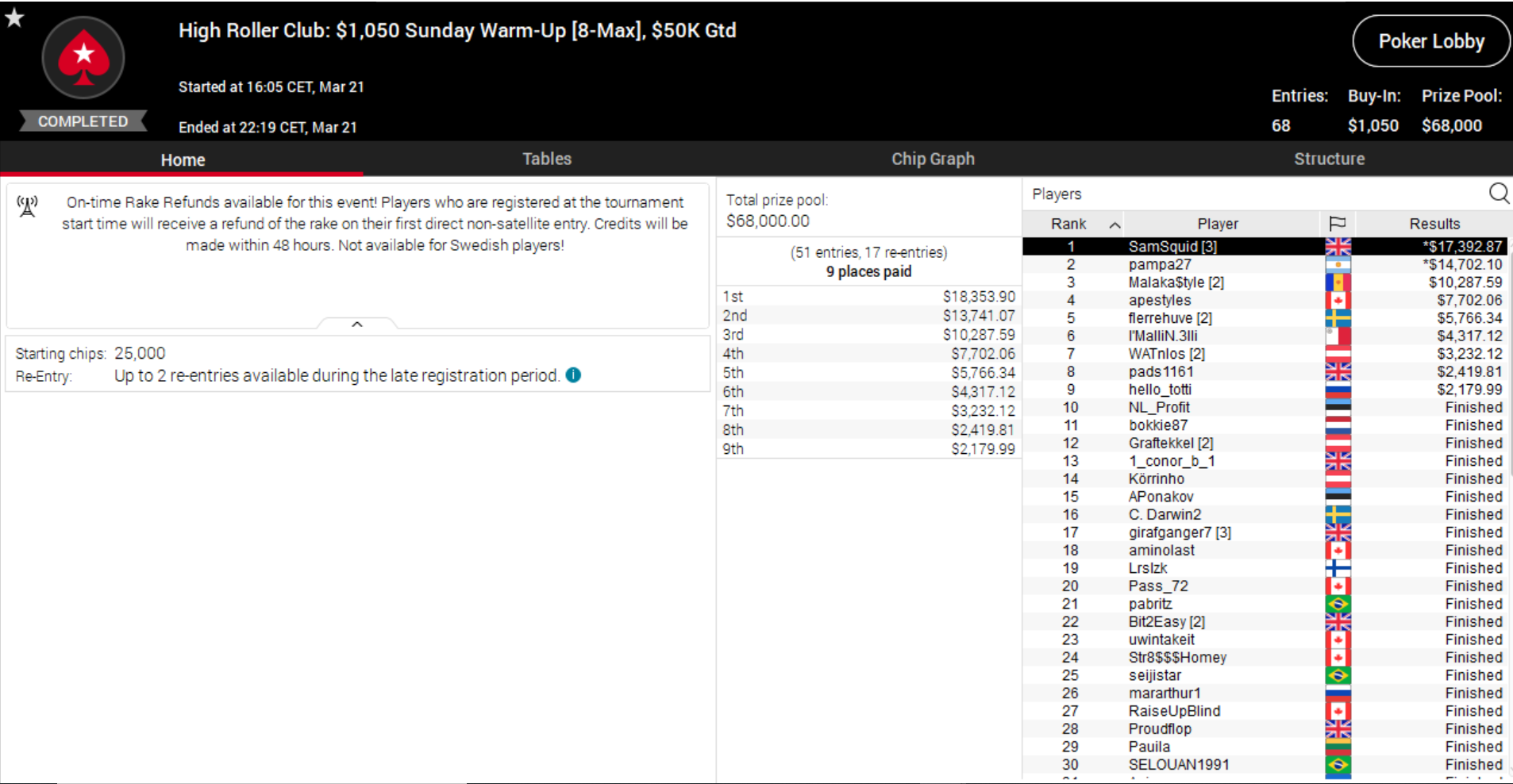 Für die Bronzemedaille beim 530 Sunday Marathon gab es gut $5.700 Preisgeld, und zu später Stunde gab es für Rang 3 beim $1.050 Sunday Highroller noch knapp $33.700 obendrauf.