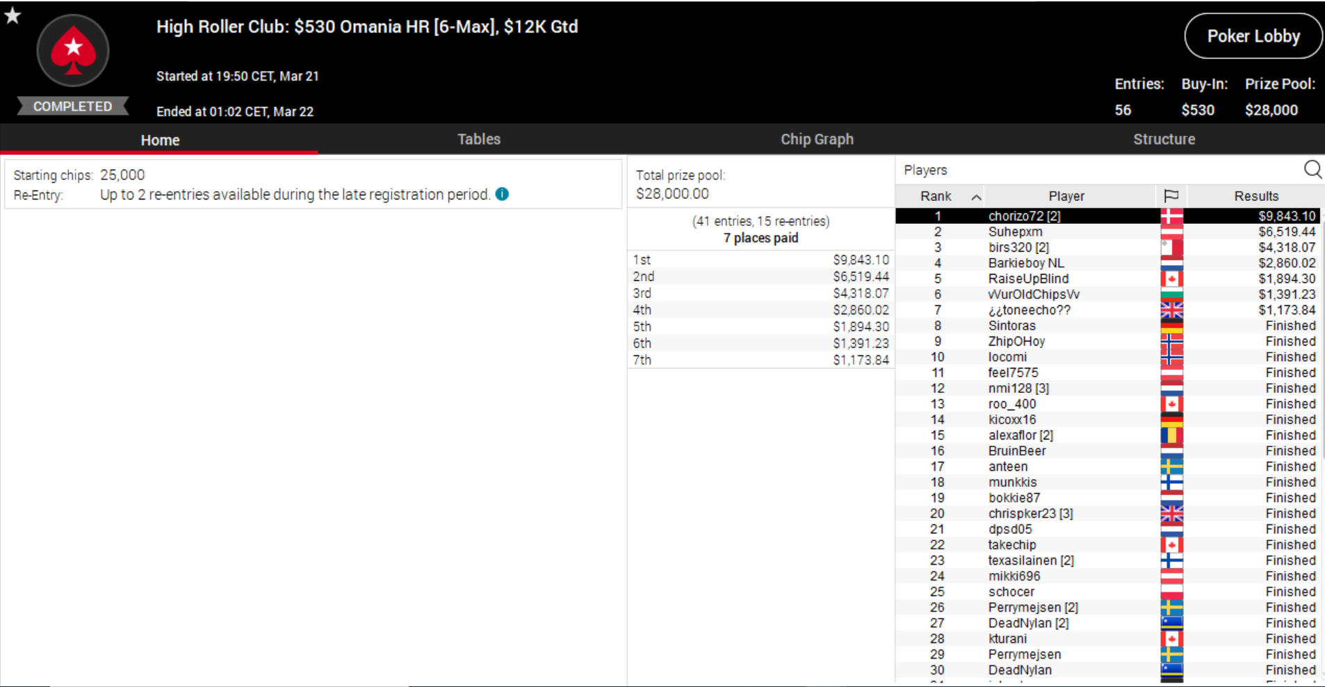 Streamer „Suhepxm“ erreichte das Heads-Up, musste sich dann aber dem Dänen „chorizo72“ geschlagen geben. Als Belohnung gab es gut $6.500 Preisgeld.