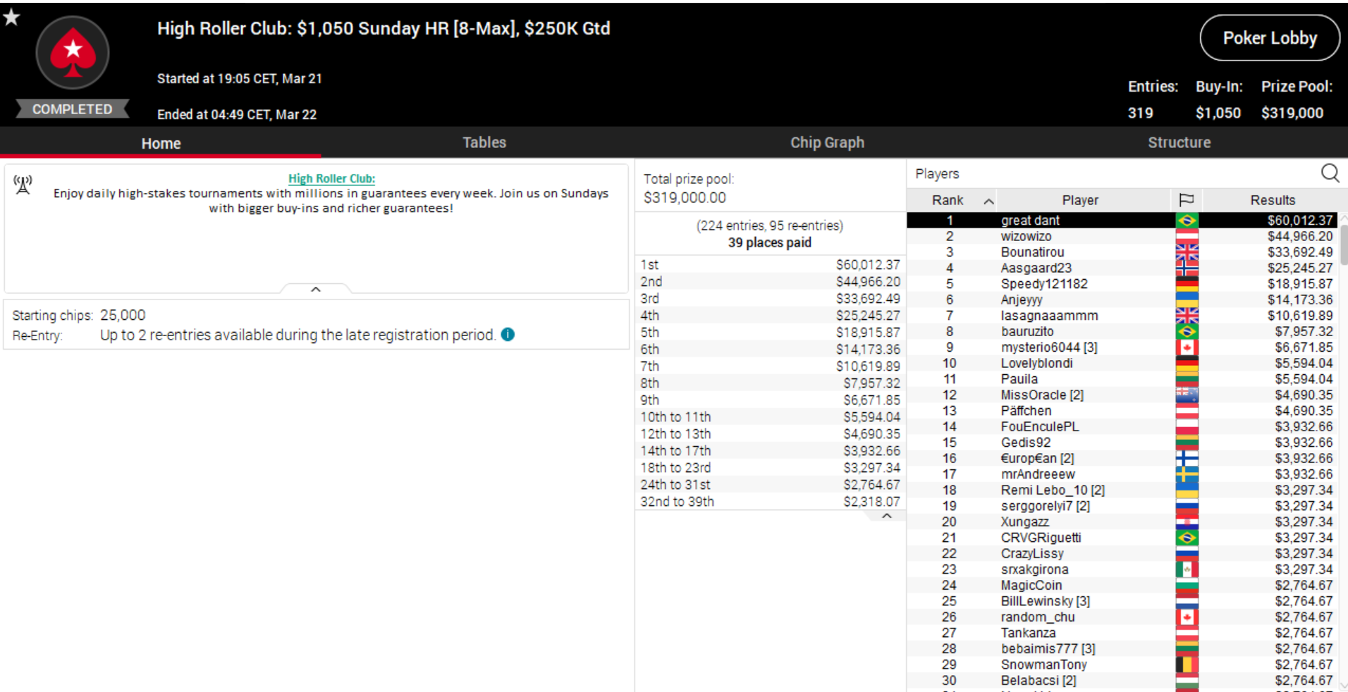Den Sieg beim Highroller und $60.000 holte der Brasilianer „great dant“, Ole „wizowizo“ Schemion landete erfreulicherweise auf Platz 2 und kassierte knapp $45.000 Preisgeld.