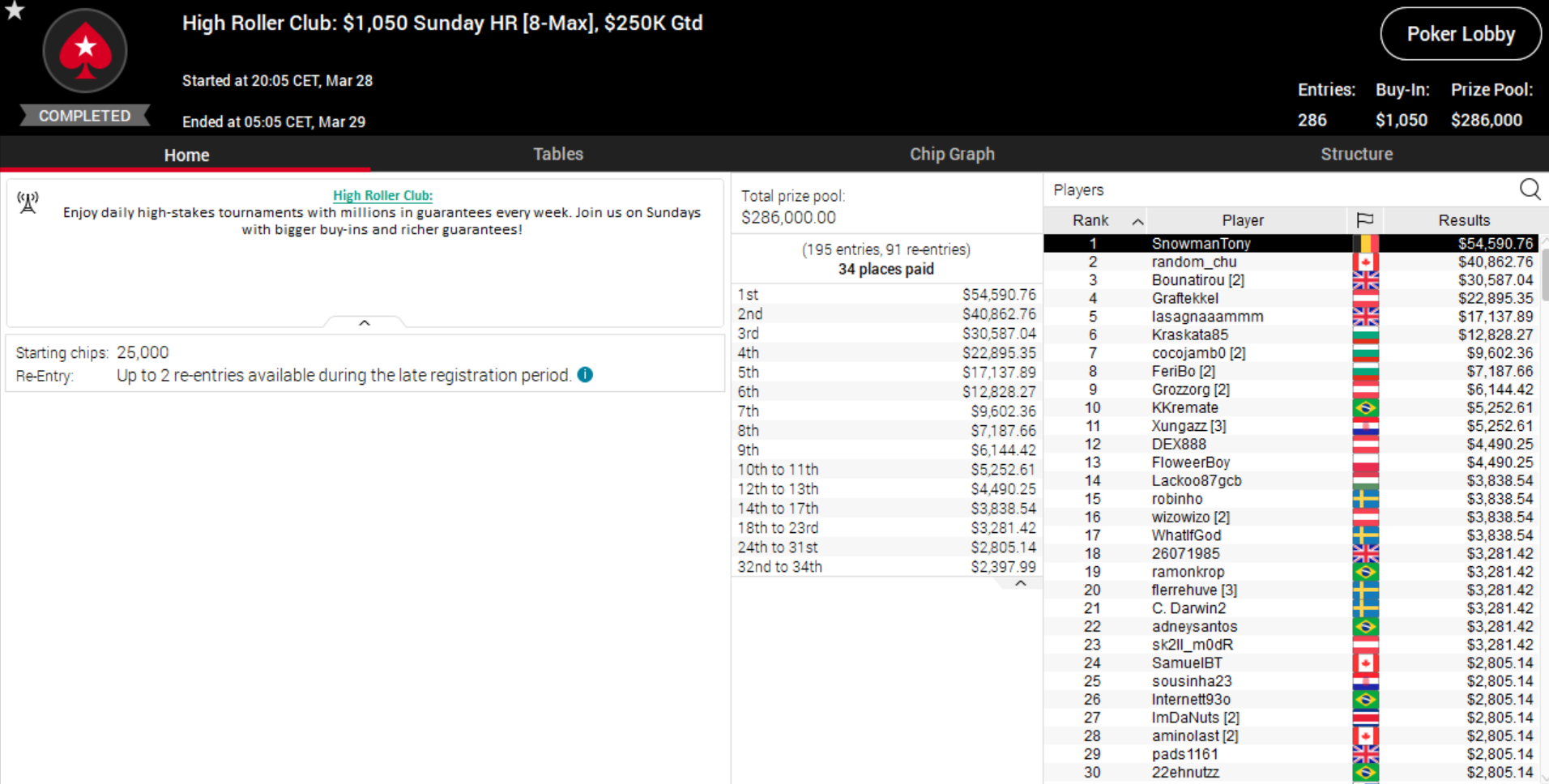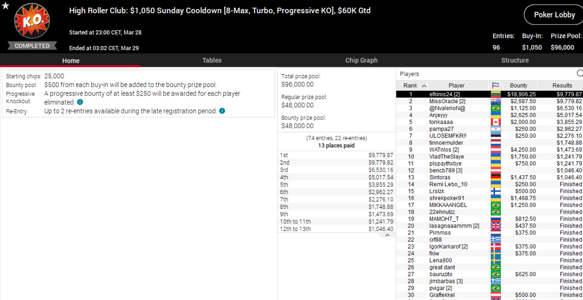 Über $30.000 war dagegen der dritte Platz von Dominik „Bounatirou“ Nitsche beim $1.050 Sunday High Roller wert.