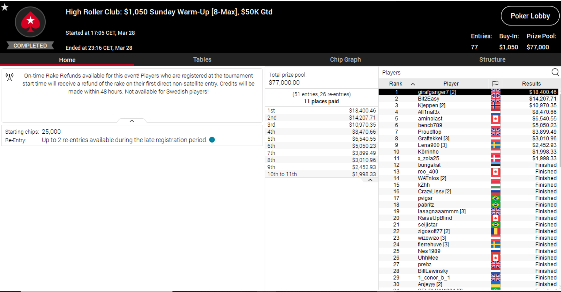 Einen guten sechsten Platz erspielte sich Ben „bencb789“ Rolle beim $1.050 WarmUp. Der Sieg ging an Bert „girafganger7“ Stevens, der Luke „Bit2Easy“ Reeves auf Platz 2 verwies.