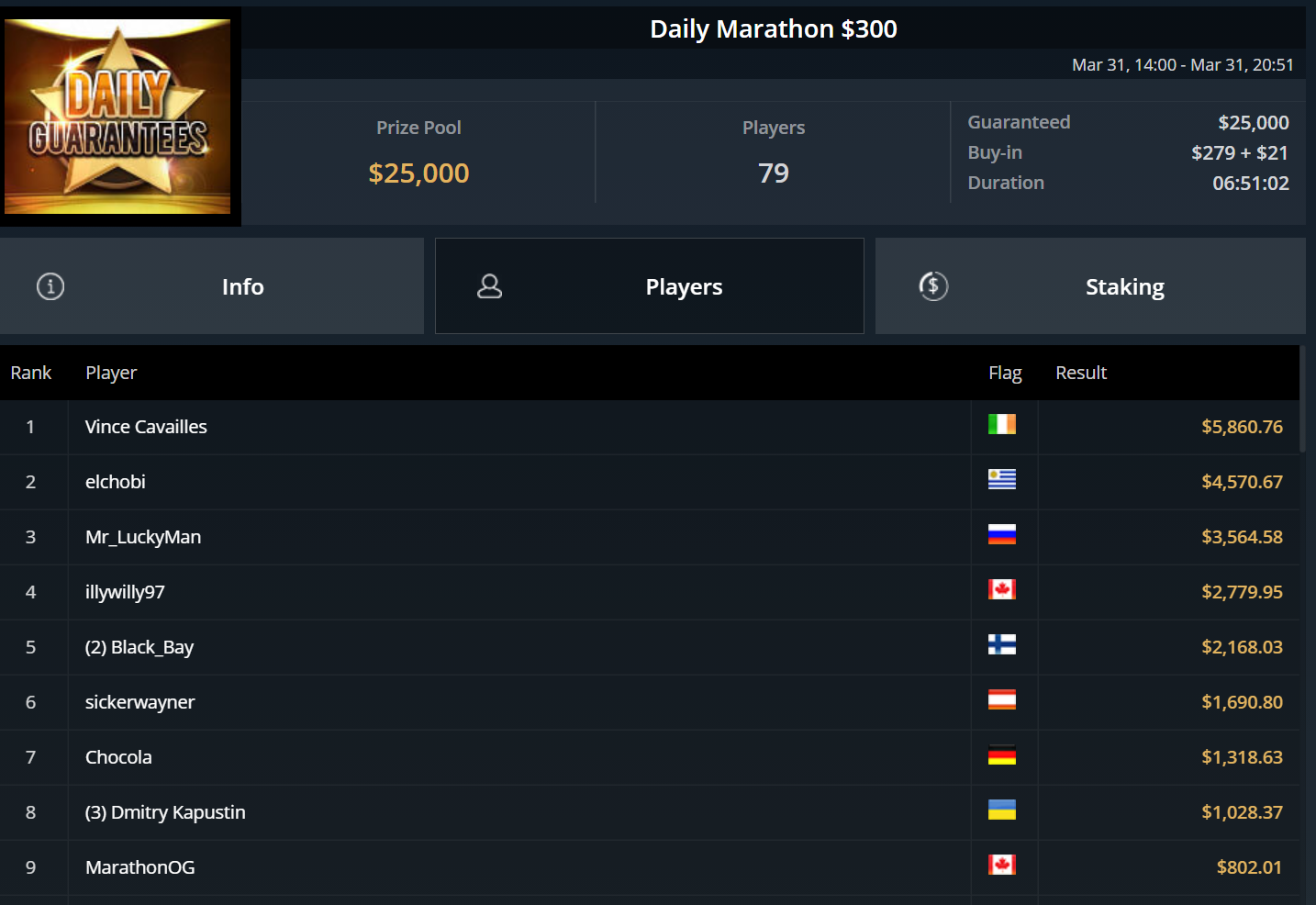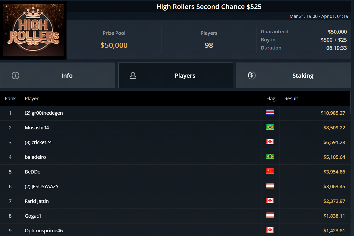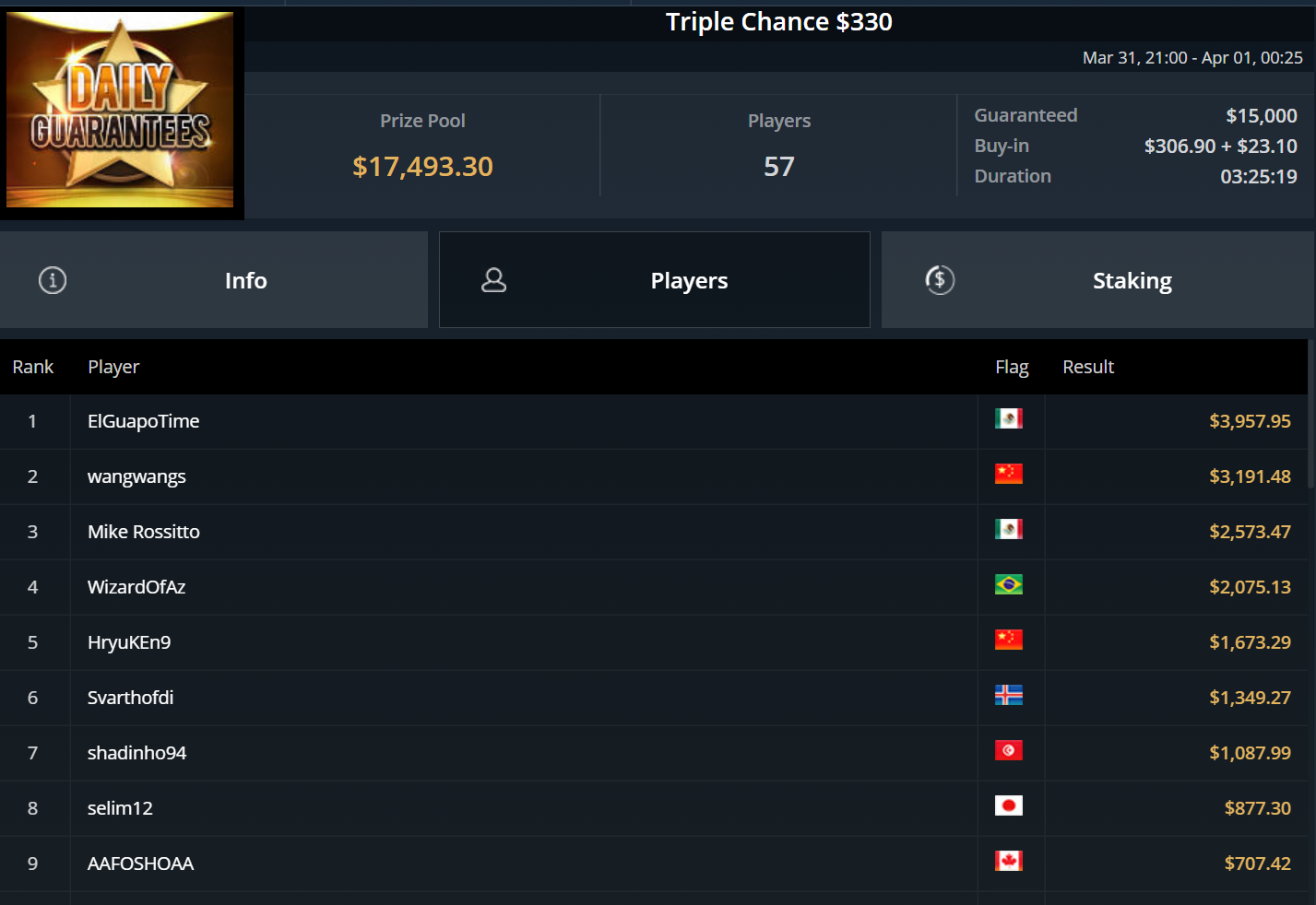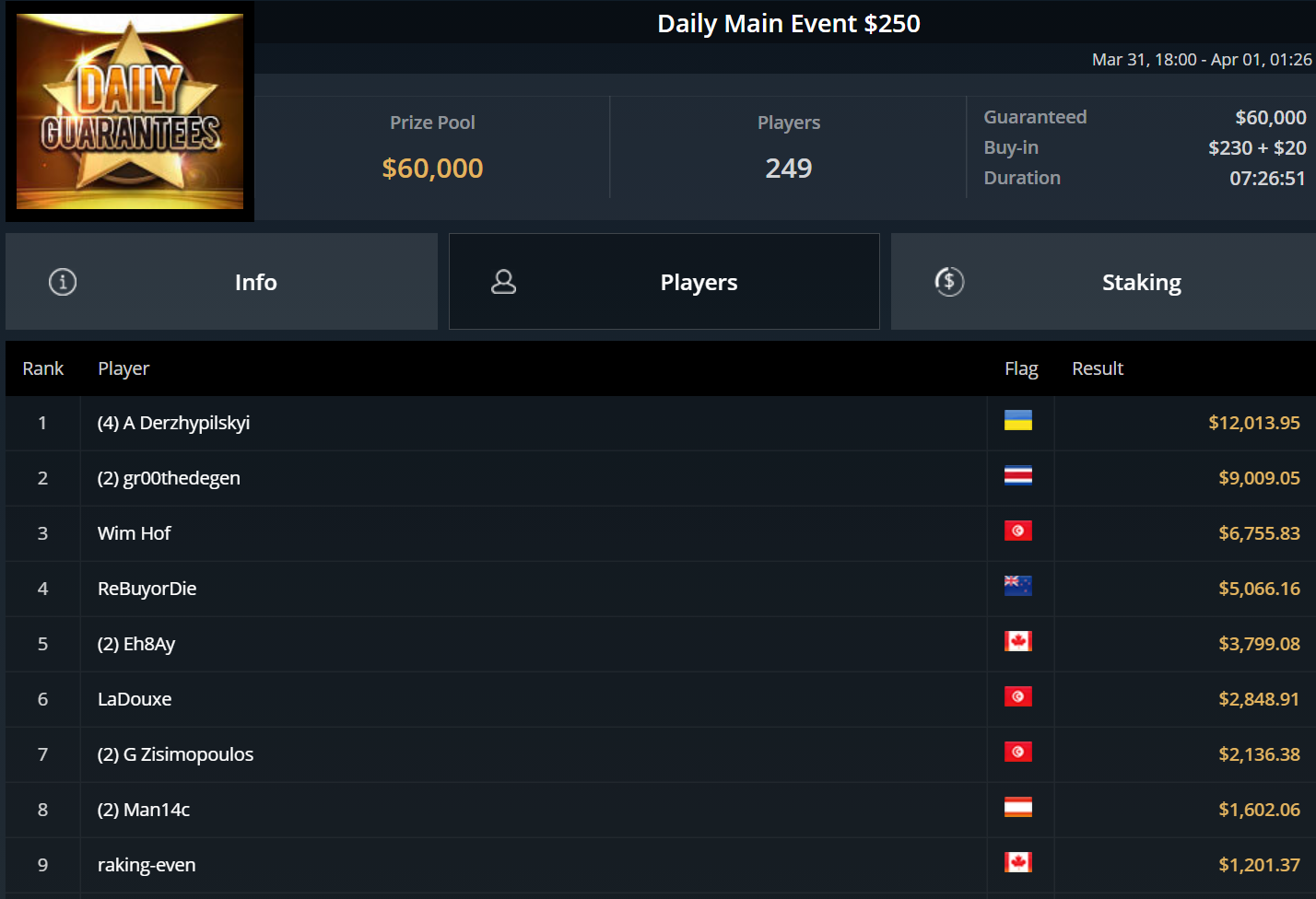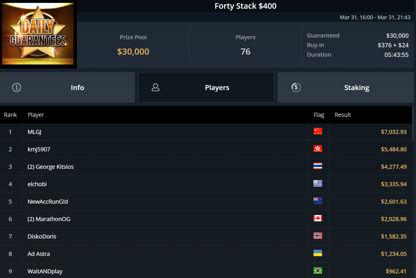 Unglücksrabe des Tages war „Titusctn10“, der mehrfach knapp die bezahlten Ränge verpasste und allein zweimal Bubble Boy wurde.
