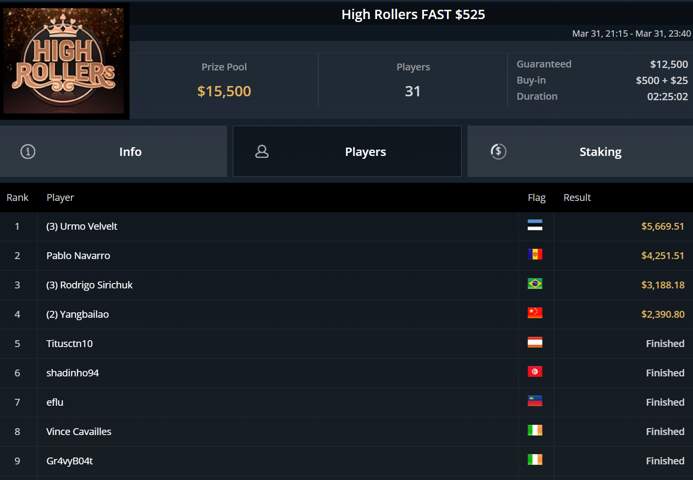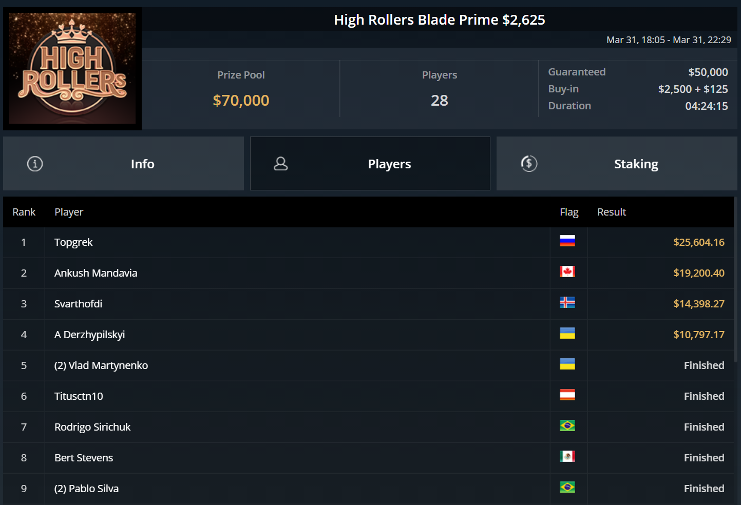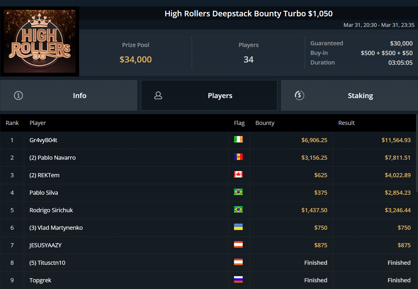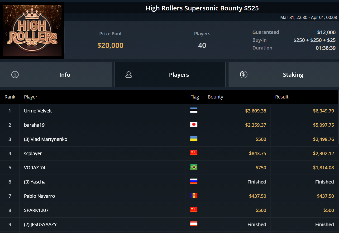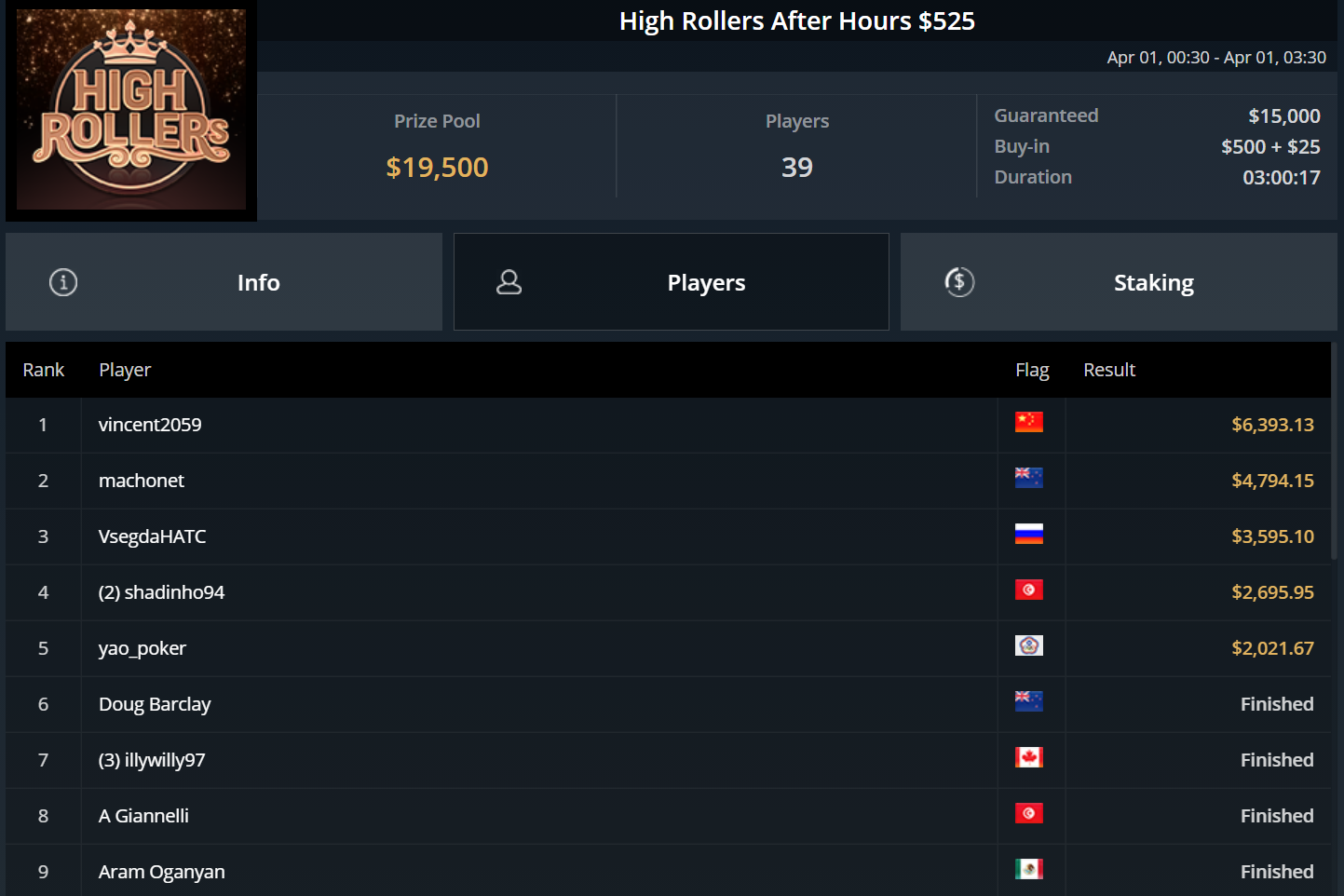 Unglücksrabe des Tages war „Titusctn10“, der mehrfach knapp die bezahlten Ränge verpasste und allein zweimal Bubble Boy wurde.