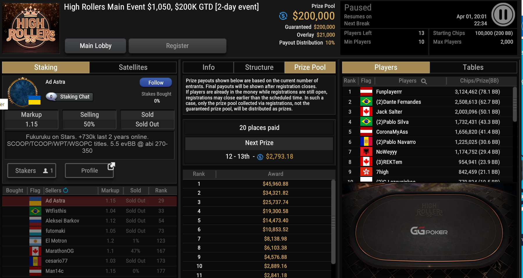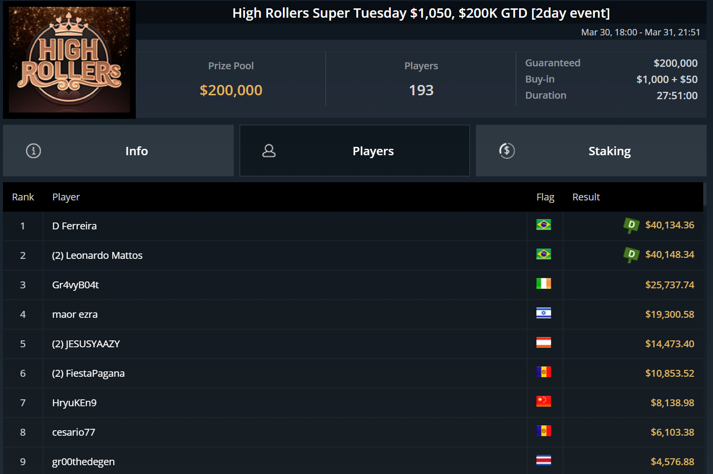 Größte Gewinner des gestrigen Tages waren zwei Brasilianer. Bei der Entscheidung des $1.050 Super Tuesday einigten sich D Ferreira und Leonardo Mattos auf einen Deal, der beiden gut $40.000 Preisgeld einbrachte.