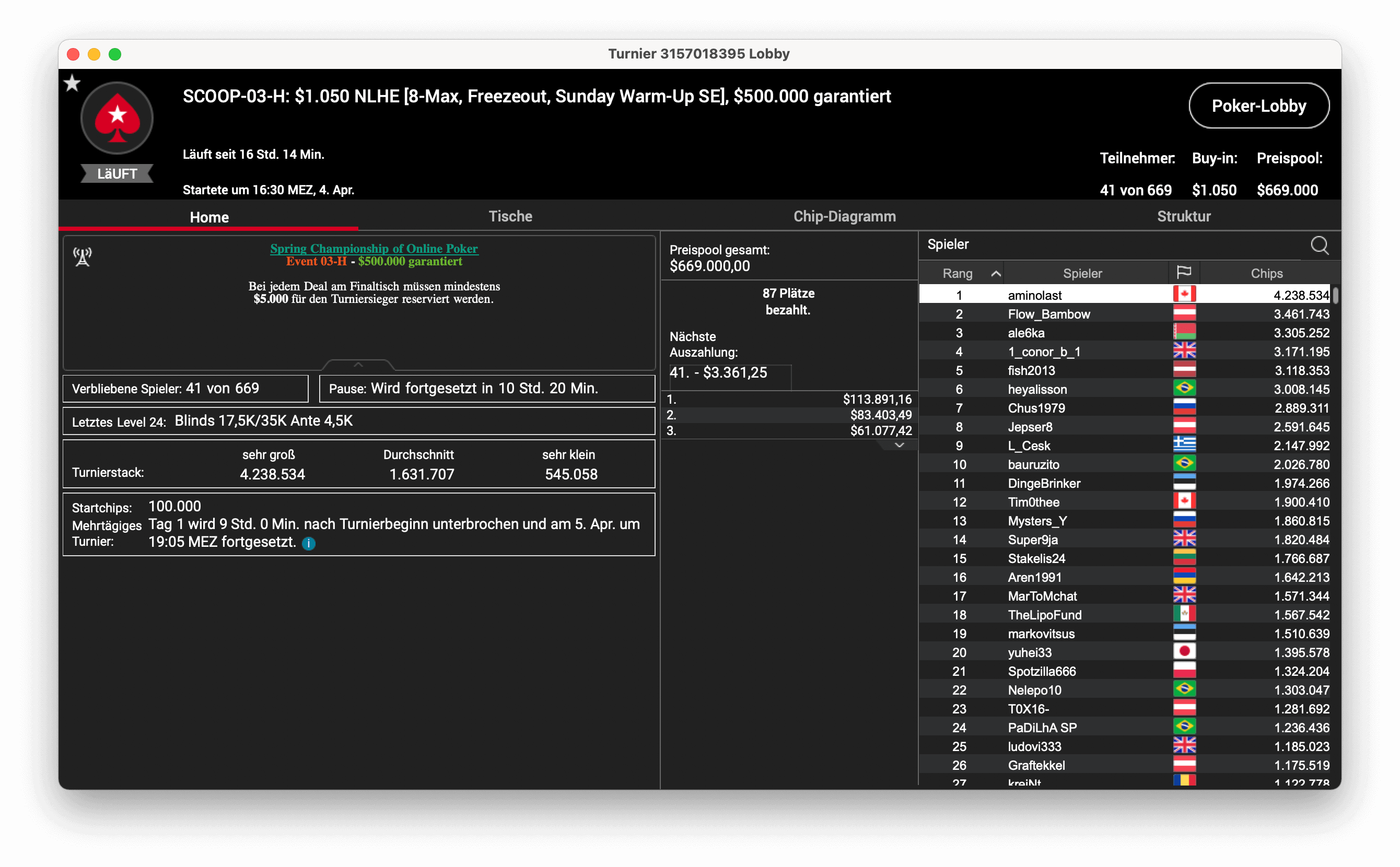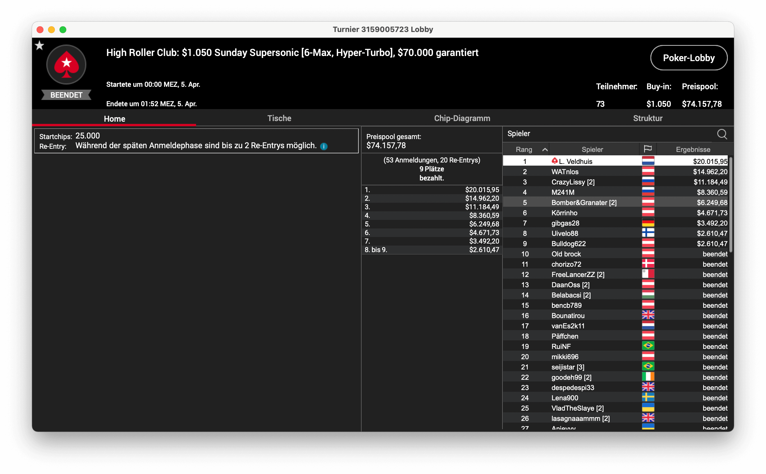 PokerStars-Pro Veldhuis, seit kurzem glücklicher Vater, wollte für seinen Sohn so viele Scoop-Titel wie möglich gewinnen – war jetzt aber erstmal im High Roller Club erfolgreich. Beim Sunday Supersonic traten 53 Spieler an, die für 73 Entries und damit $74.157 Preispool sorgten. Veldhuis spielte sich an die Spitze und wurde mit $20.015 belohnt, Christian „WATnlos“ Rudolph wurde Runner-Up für $14.962.