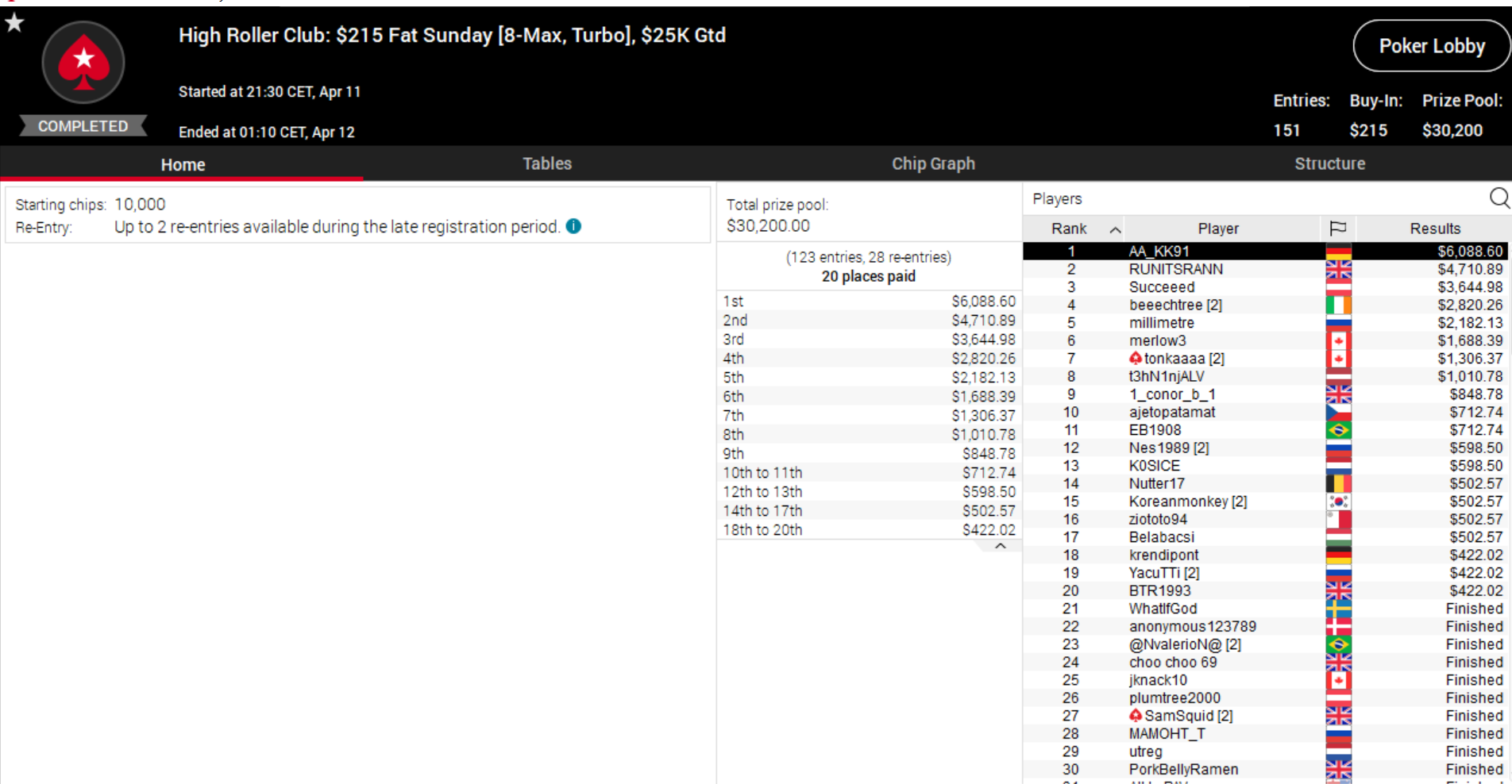 Beim $215 Fat Sunday ließ „AA_KK91“ aus Deutschland alle 150 Konkurrenten hinter sich und kassierte die Siegprämie von über $6.000.
