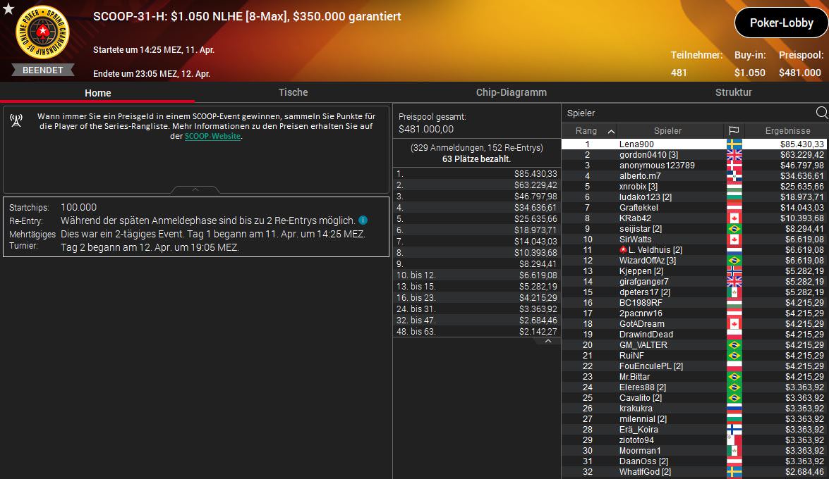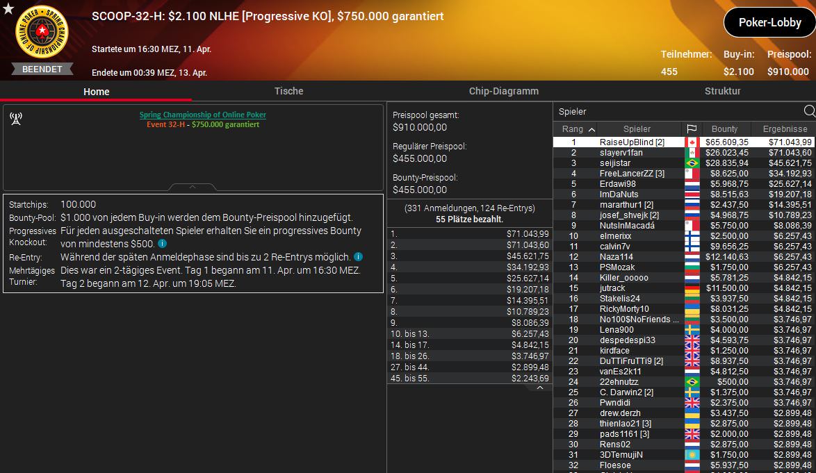Außerdem trugen sich bekannte Pros wie NiklasLena900 Astedt ($85.430,33) beim $1.050 NLHE und Jonah RaiseUpBlind Silverstein ($136.653,34) beim $2.100 NLHE PKO.