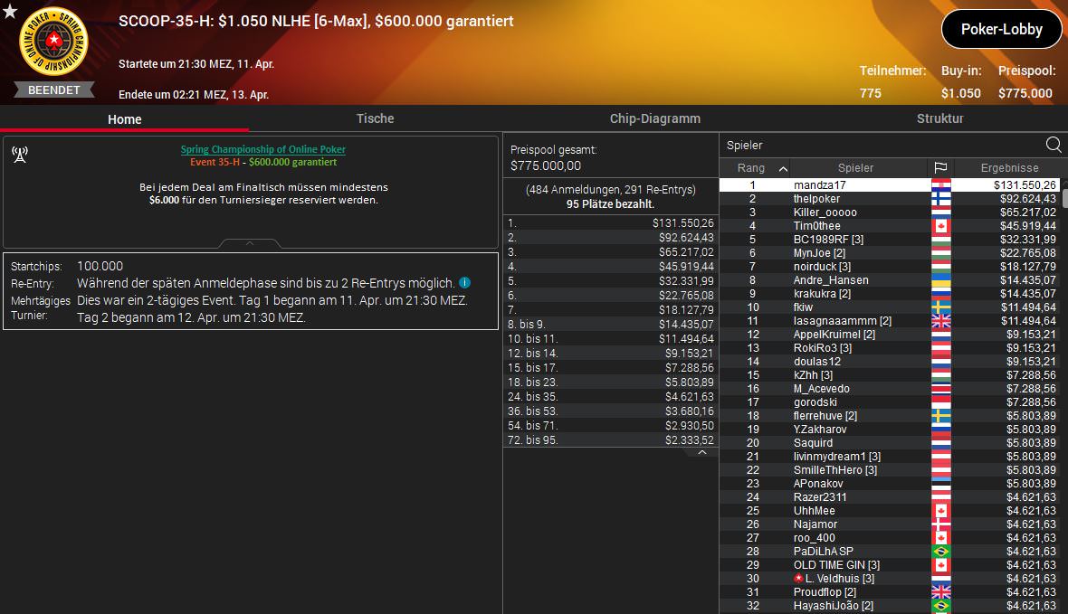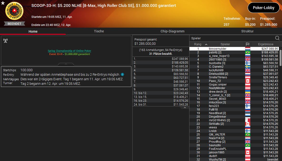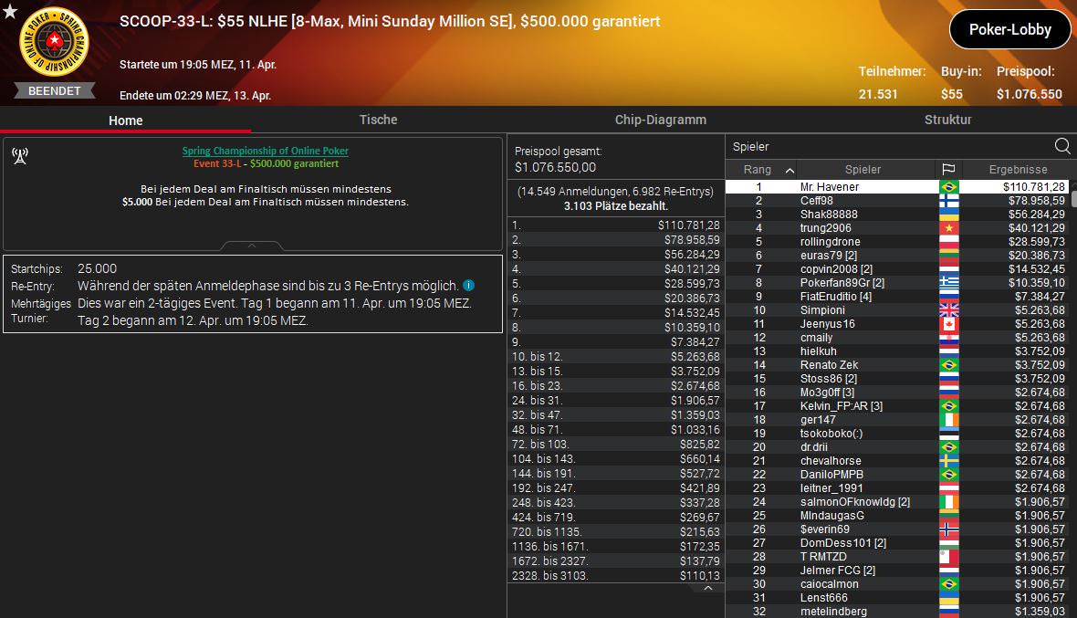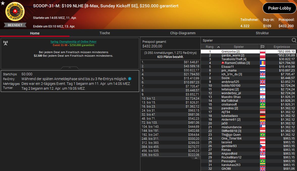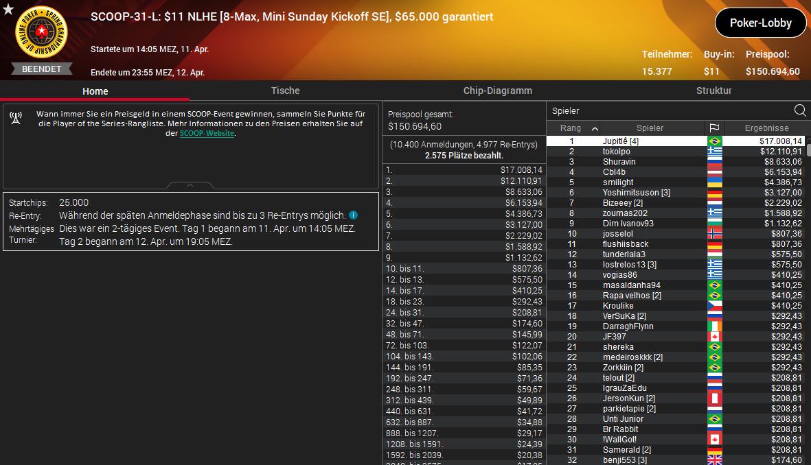 Die höchste Siegprämie wird aber erst heute Abend beim $530 Sunday Million SE ausgespielt. Auf den kommenden Champion warten $301.178,62 und unter den letzten neun Spieler sind brille-390 aus Deutschland und tzuzteutezu aus Österreich.