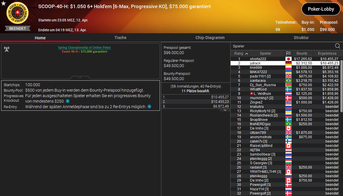 Platz 2: 40-H $1.050 6+ Hold’em 6-Max (PKO)- jutrack (GER), $12.767,73
