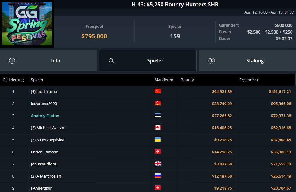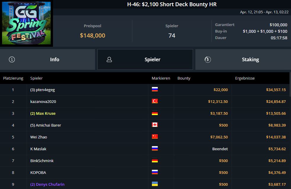 Bundesliga-Profi Max Kruse ging beim $2.100 Short Deck Bounty an den Start, schaffte bei insgesamt 74 Entries den Sprung an den Final Table und belegte am Ende einen starken dritten Platz für $13.505,66 Preisgeld.