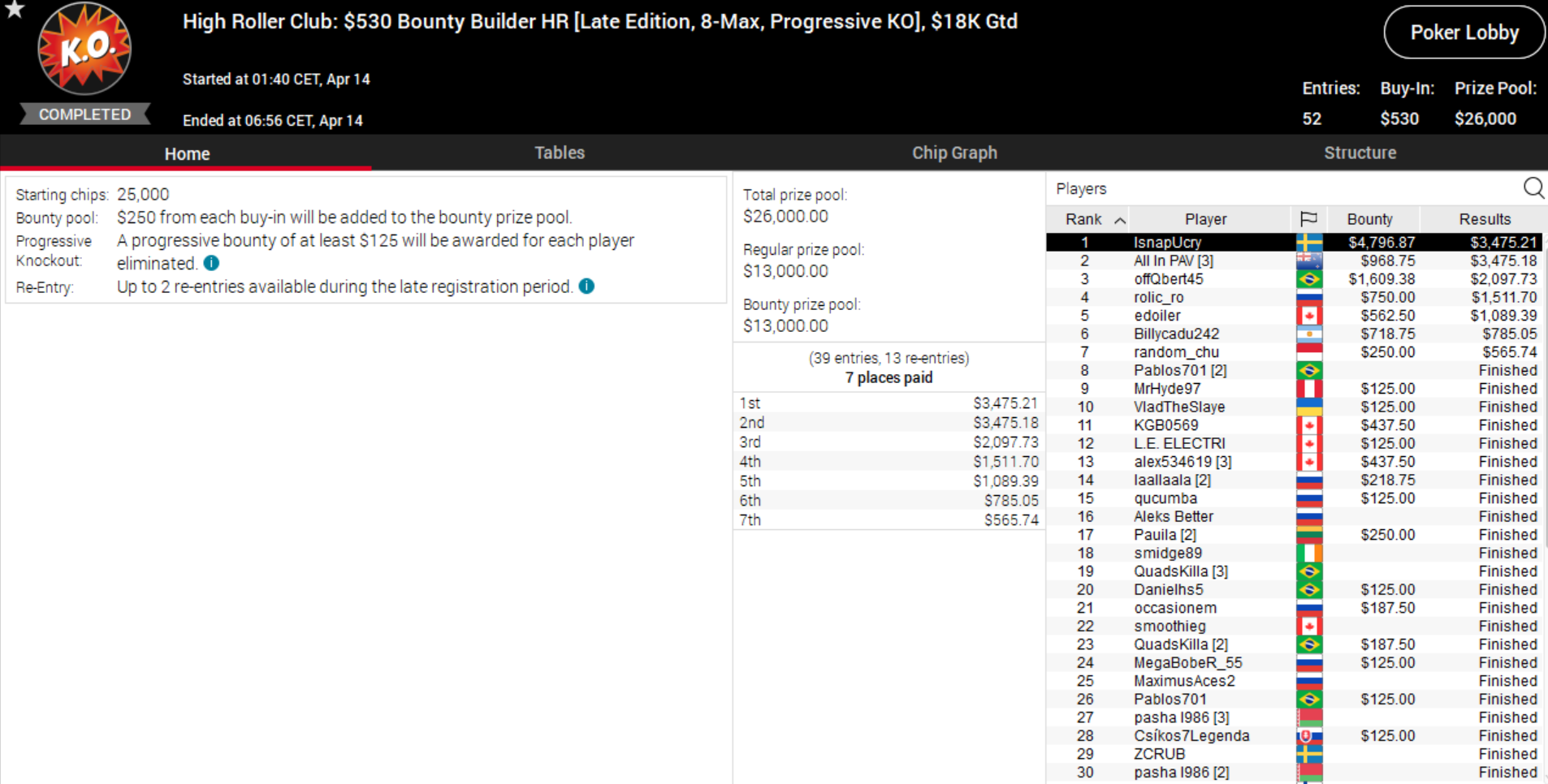 Sogar aufs Siegertreppchen schaffte es Jakob „Succeeed“ Miegel beim $530 Bounty Builder. Hinter Sieger „Spotzilla666“ und „despedespi33“ wurde er Dritter und bekam über $13.000 auf seinem Konto gutgeschrieben.