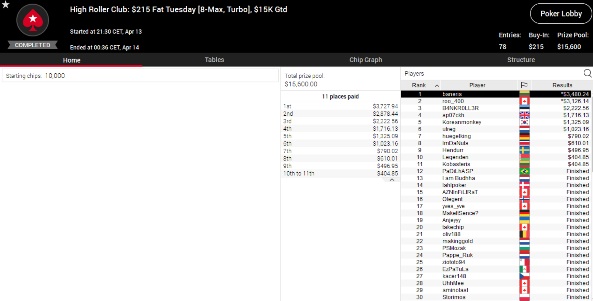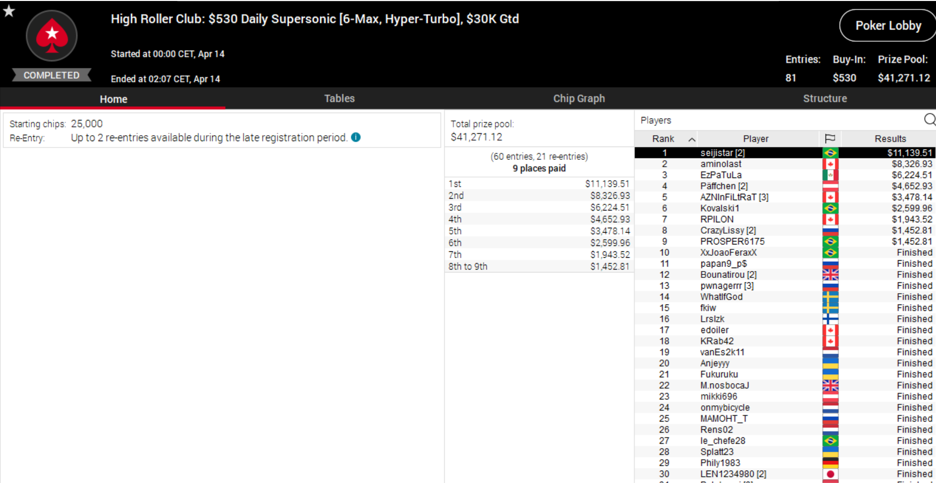 Hartmann kaufte sich zu später Stunde ins $530 Supersonic ein und musste erst auf Platz 4 seinen Platz räumen. Dafür gab es gut $4.600 Preisgeld, Sieger „seijistar“ aus Brasilien kassierte gut $11.000.