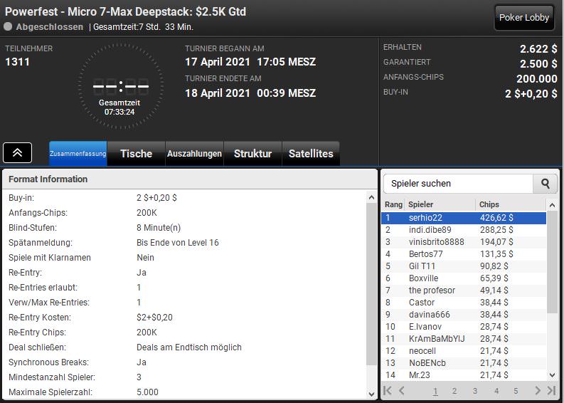 Auch beim $320 KO Weekender konnten sich die Zahlen an Day 1B sehen lassen. Nach nur 193 Entries an Day 1A waren es gestern 571 Entries und damit sind $229.200 der garantierten $300.000 bereits eingespielt. Insgesamt haben sich bisher 115 Spieler für Day 2 qualifiziert, in Führung liegt SrErnesto1 mit 2.423.239 Chips.