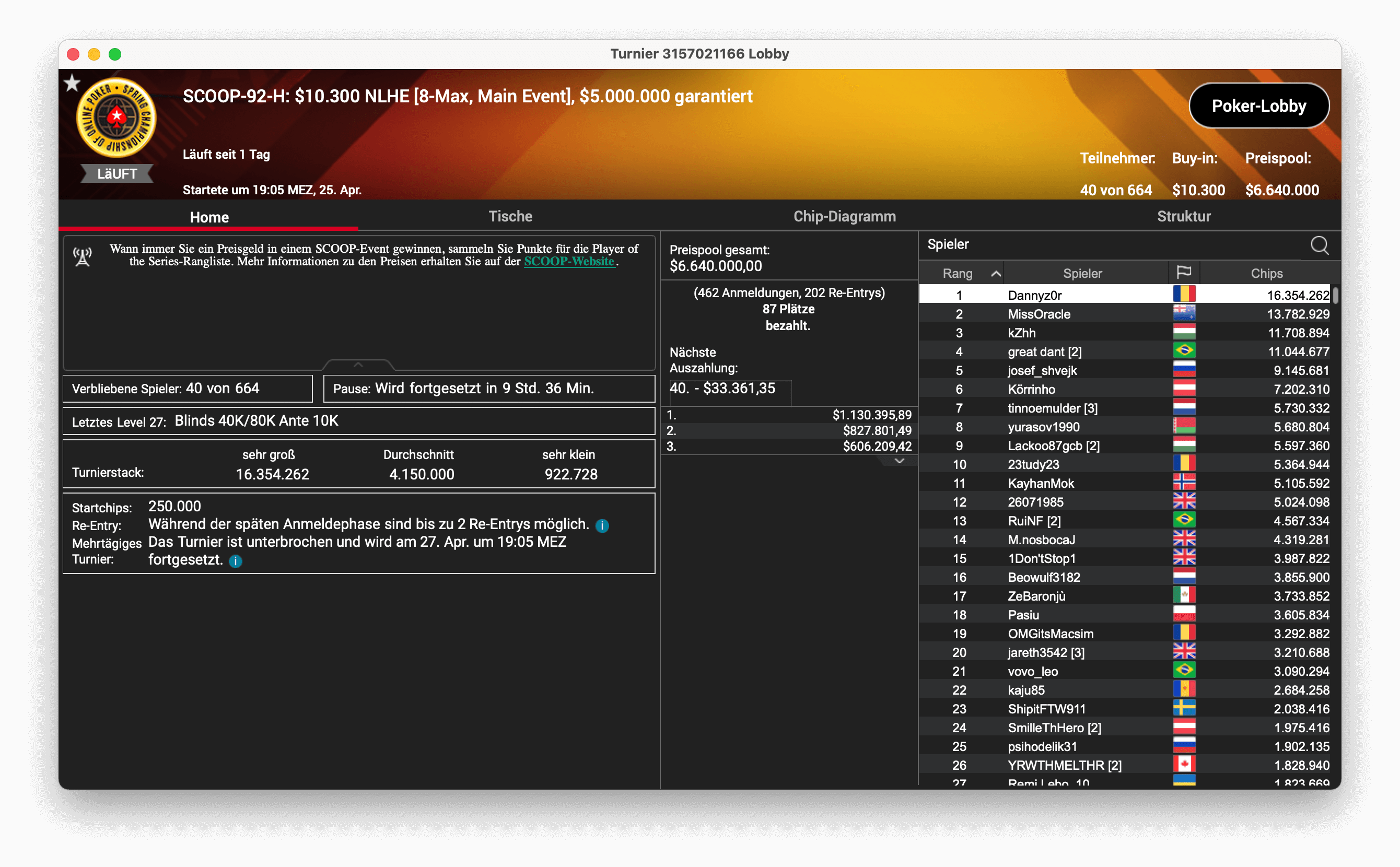 $1.130.000 Siegprämie gibt es beim $10.300 NLHE Main Event, 664 Entries sorgten für $6.640.000 Preispool. Dan „Dannyz0r“ Borlan führt das Feld mit 16,35 Mio Chips an. Koray „Körrinho“ Aldemir ist auf Platz 6 mit 7,2 Mio Chips. Christoph „26071985“ Vogelsang hat auf Platz 12 knapp 5 Mio Chips. Alle 40 verbleibenden Spieler haben $33.361 sicher.