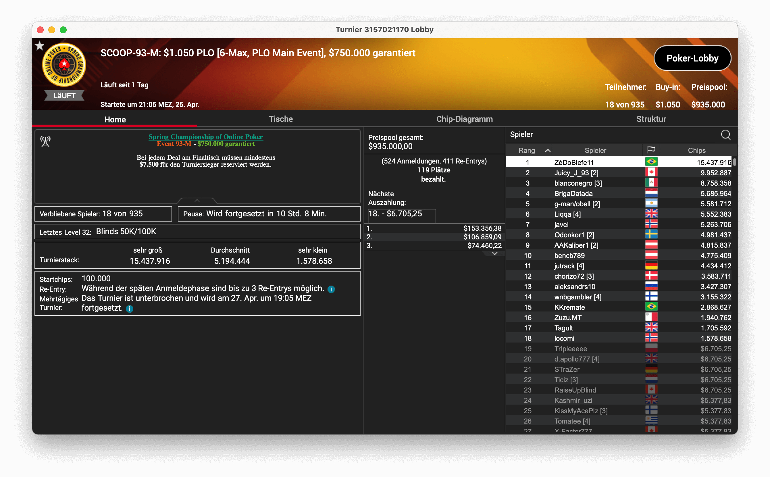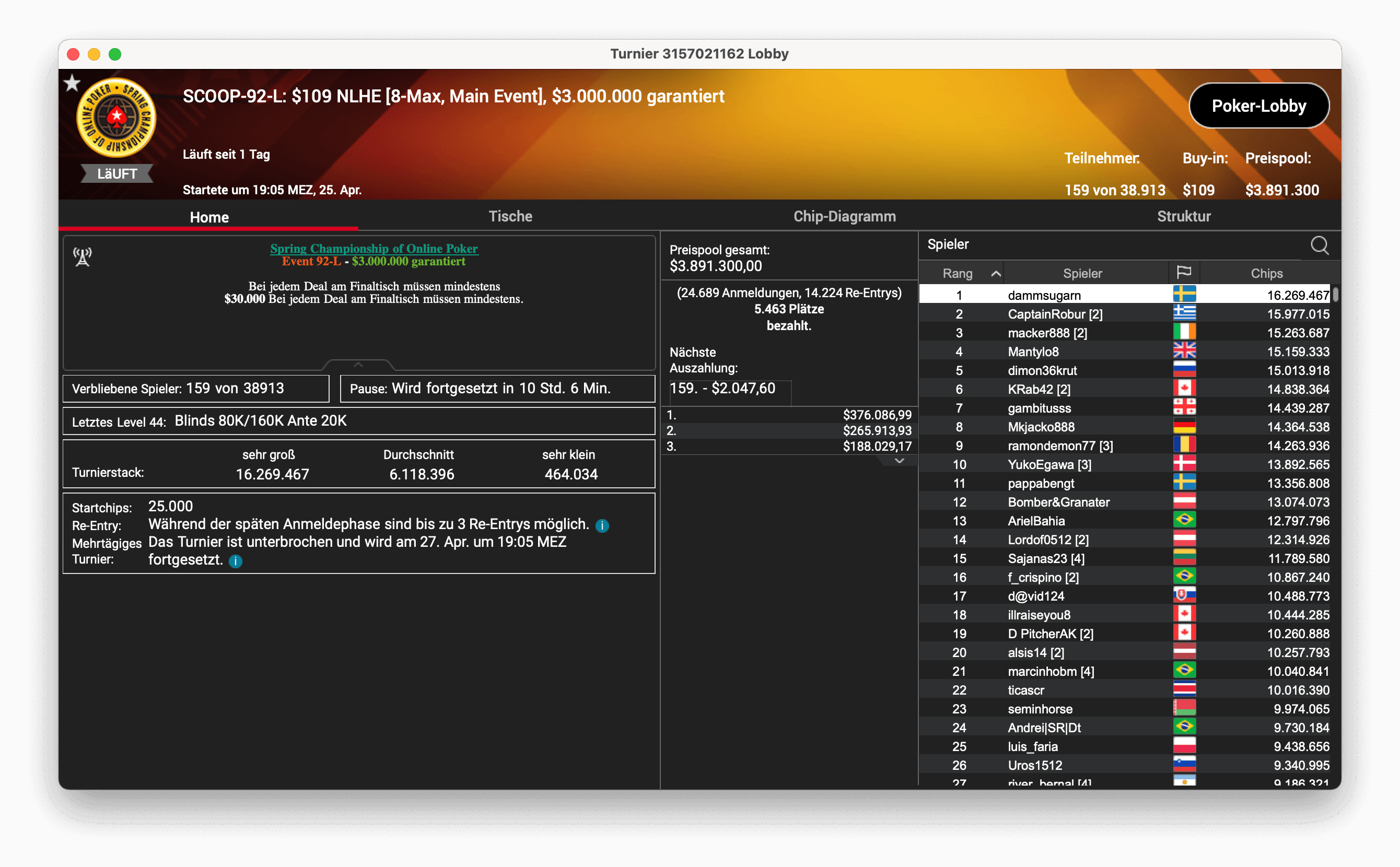 Im $1.050 Main Event mit $5.903.000 Preispool, führt „livinmydream1“. Er ist an der Spitze der verbleibenden 80 Spieler mit 18,7 Mio Chips. Alle Spieler haben $5.979 sicher, auf den Sieger warten krasse $838.908.