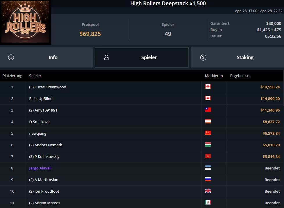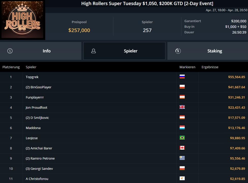 Am Mittwoch kam es zur Entscheidung beim $1.050 Super Tuesday (2-Days) Event. 257 Entries hatten einen Preispool von $257.000 zusammengetragen. Am Ende von Tag 1 durften noch 16 Spieler ihre Chips virtuell eintüten. Alle Finalisten hatten schon $2.503 sich und auf den Sieger warteten $55.564. Mit „Funplayerrr“ (AUT), „Diamond Hands“ (AUT) und Daniel Smiljkovic (GER/AUT) waren auch noch drei DACH-Spieler mit von der Partie. Für „DaimondHands“ (AUT) wurde es nur ein kurzes Gastspiel und er musste sich mit Platz 14 und $2.503 zufriedengeben. Daniel Smiljkovic hingegen schaffte es bis auf Platz 5 und cashte $17.571. Für „Funplayerrr“ (AUT) war sogar erst auf Platz 3 für $31.246 Endstation. Den Sieg und $55.564 schnappte sich der Russe „Tapgrek“.