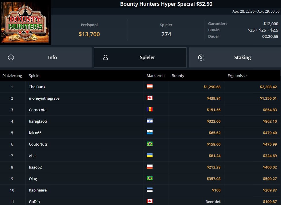 Platz 1 – $52,50 Bounty Hunters Hyper Special – „TheBunk“ (AUT) – $2.208 inkl. $1.290 Bounties