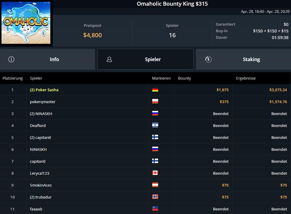 Platz 1 – $315 Omaholic Bounty KIng – Sasha „Poker Sasha“ Liu (GER) – $3.075 inkl. $1.875 Bounties
