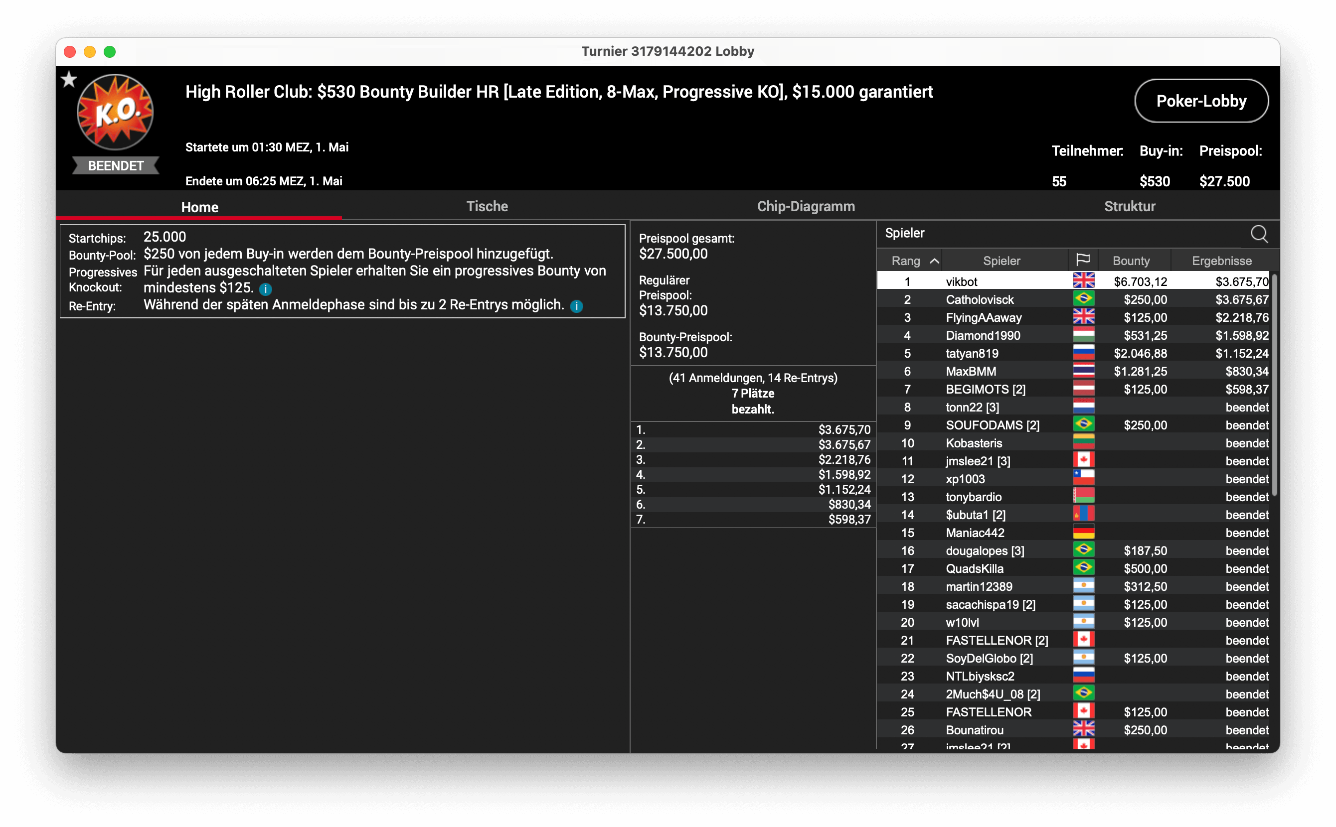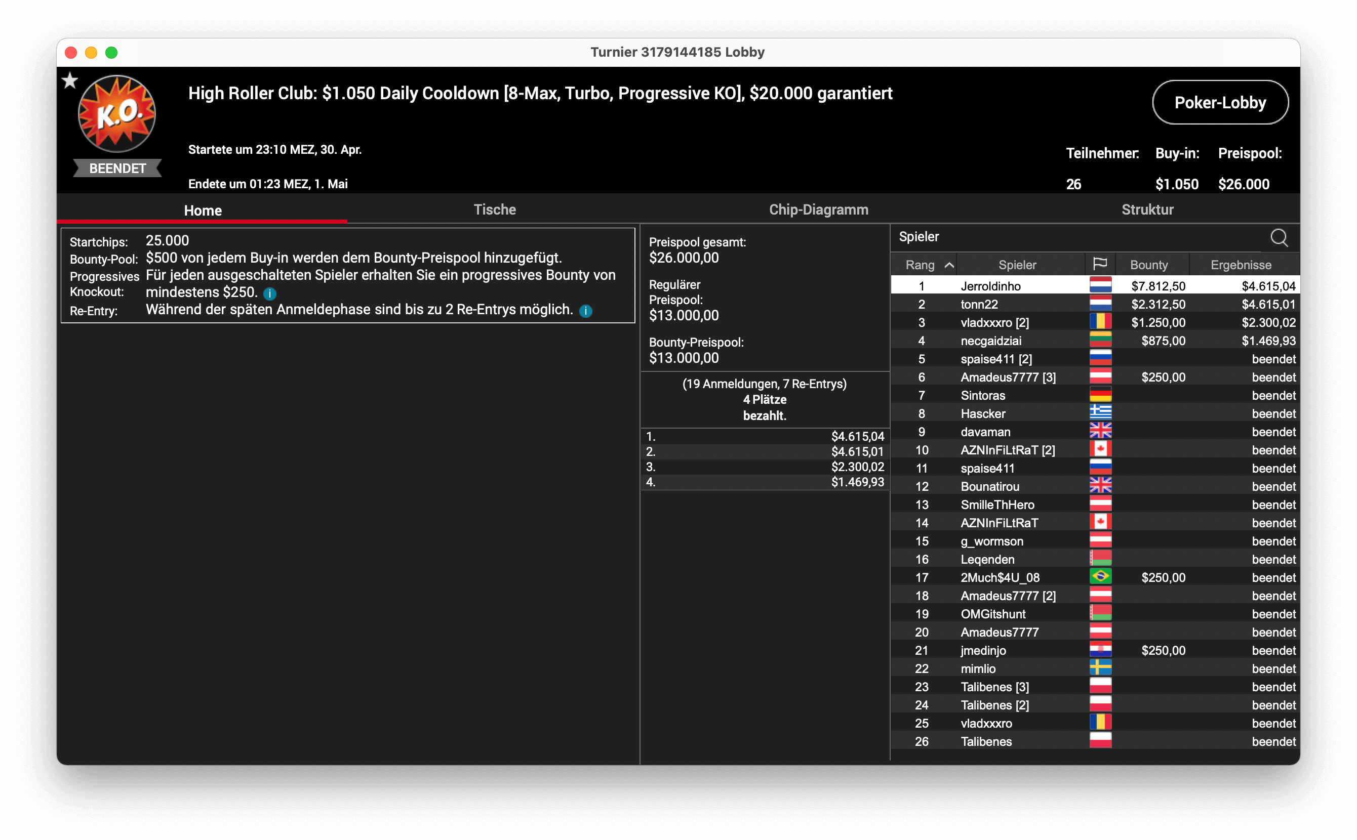 Weitere Ergebnisse im High Roller Club am 30.04.2021: