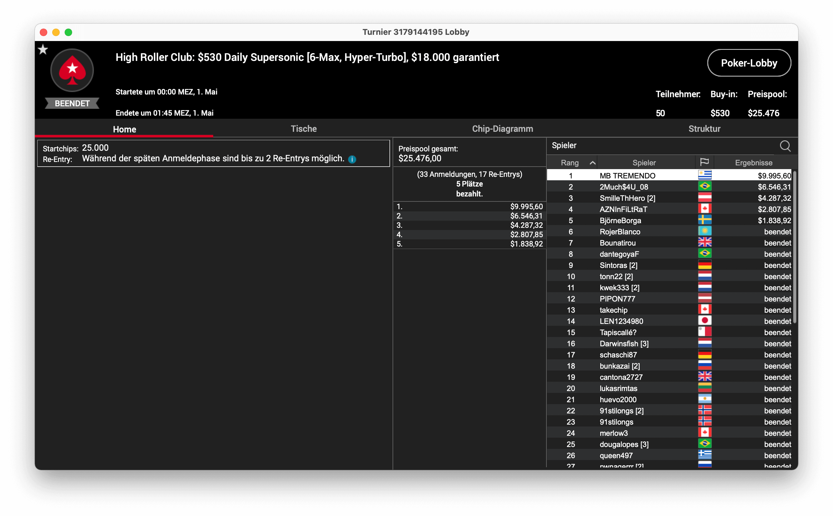 Im $530 Daily Supersonic gab es $25.476 Preispool bei 50 Entries. Der Sieg ging an Mario „MB TREMENDO“ Bonanata für $9.995, Daniel „SmileTheHero“ Smiljkovic wurde Dritter für $4.287.