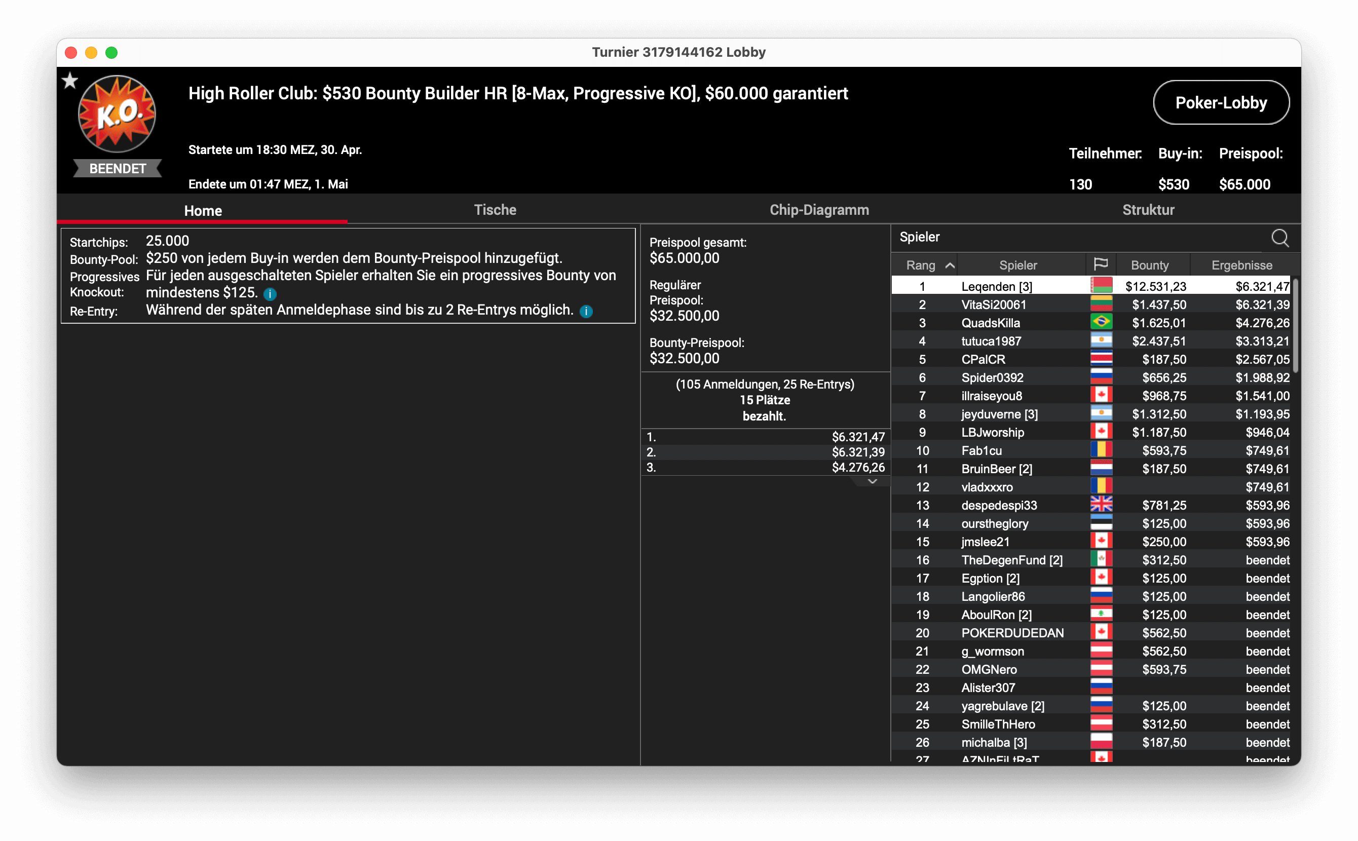 $65.000 lagen beim $530 Bounty Buildr HR im Preispool, der kam durch 130 Entries zustande. Der Sieg ging an Ilya „Leqenden“ Anatsky, der $12.531 mit Bounties verdiente und $6.321 mit der Platzierung gewann.