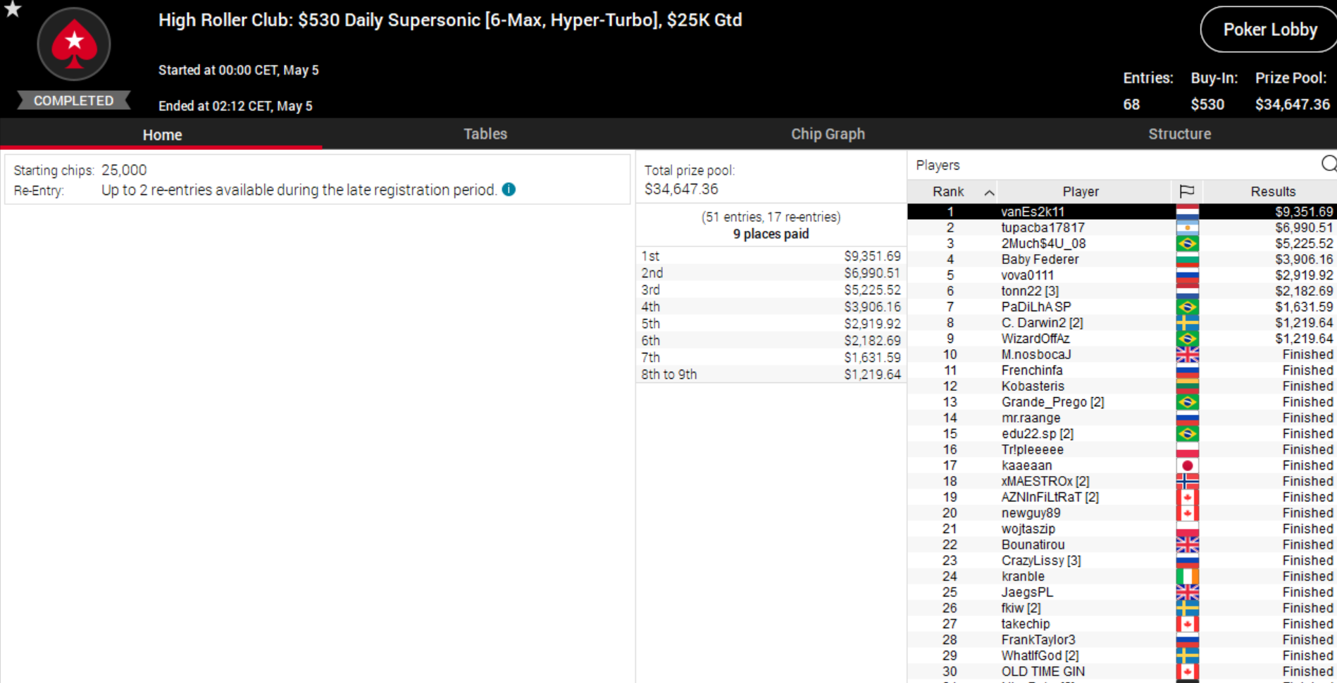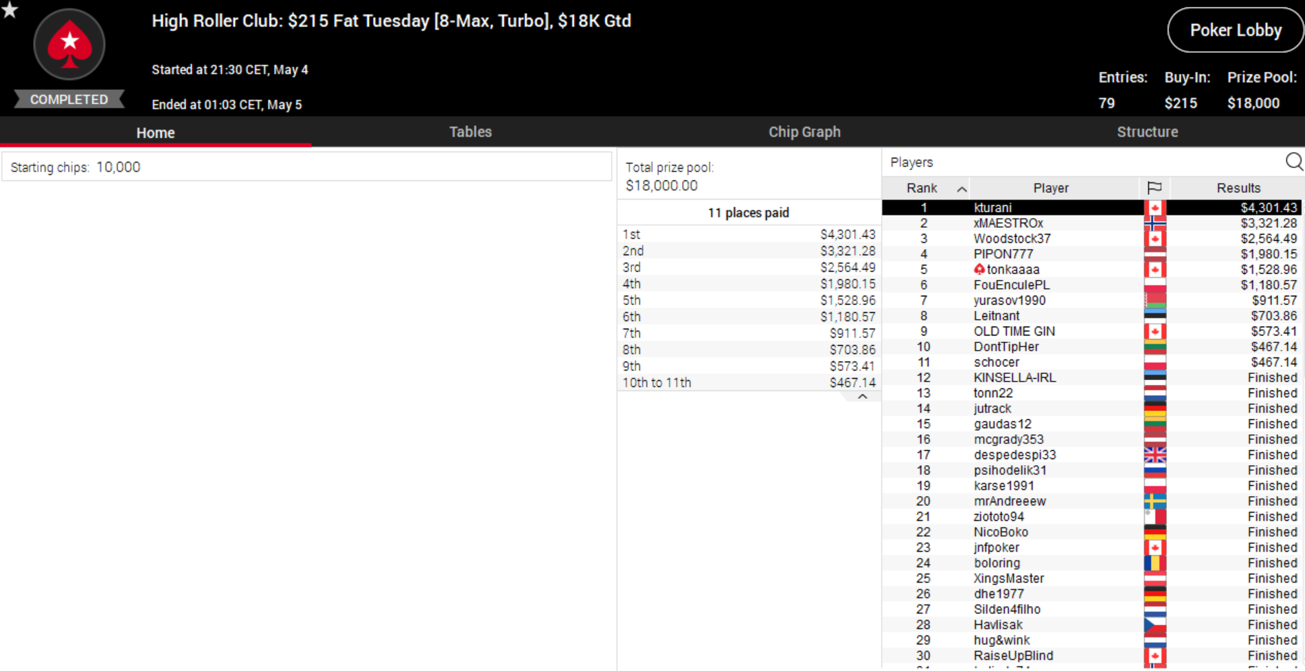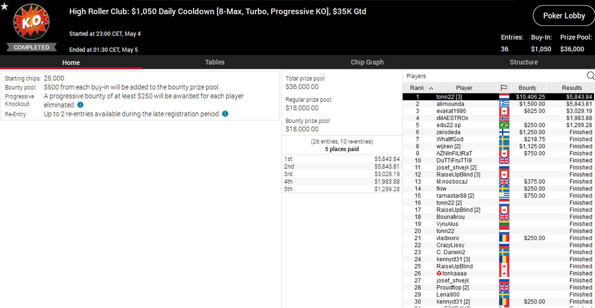 Bei den vier weiteren Turnieren gingen die deutschsprachigen Spieler komplett leer aus. Den lukrativsten Sieg landete „tonn22“ aus den Niederlanden, der für seinen Sieg beim $1.050 Cooldown über $16.000 einstrich.