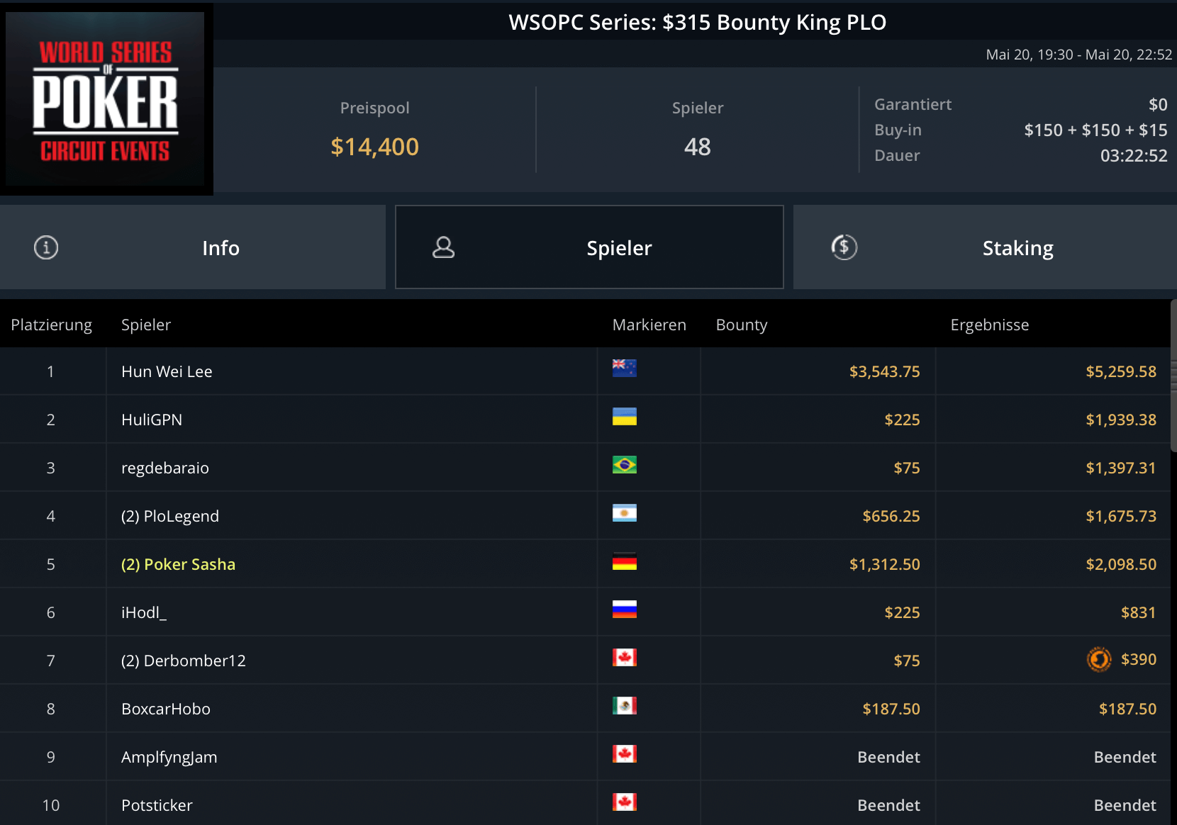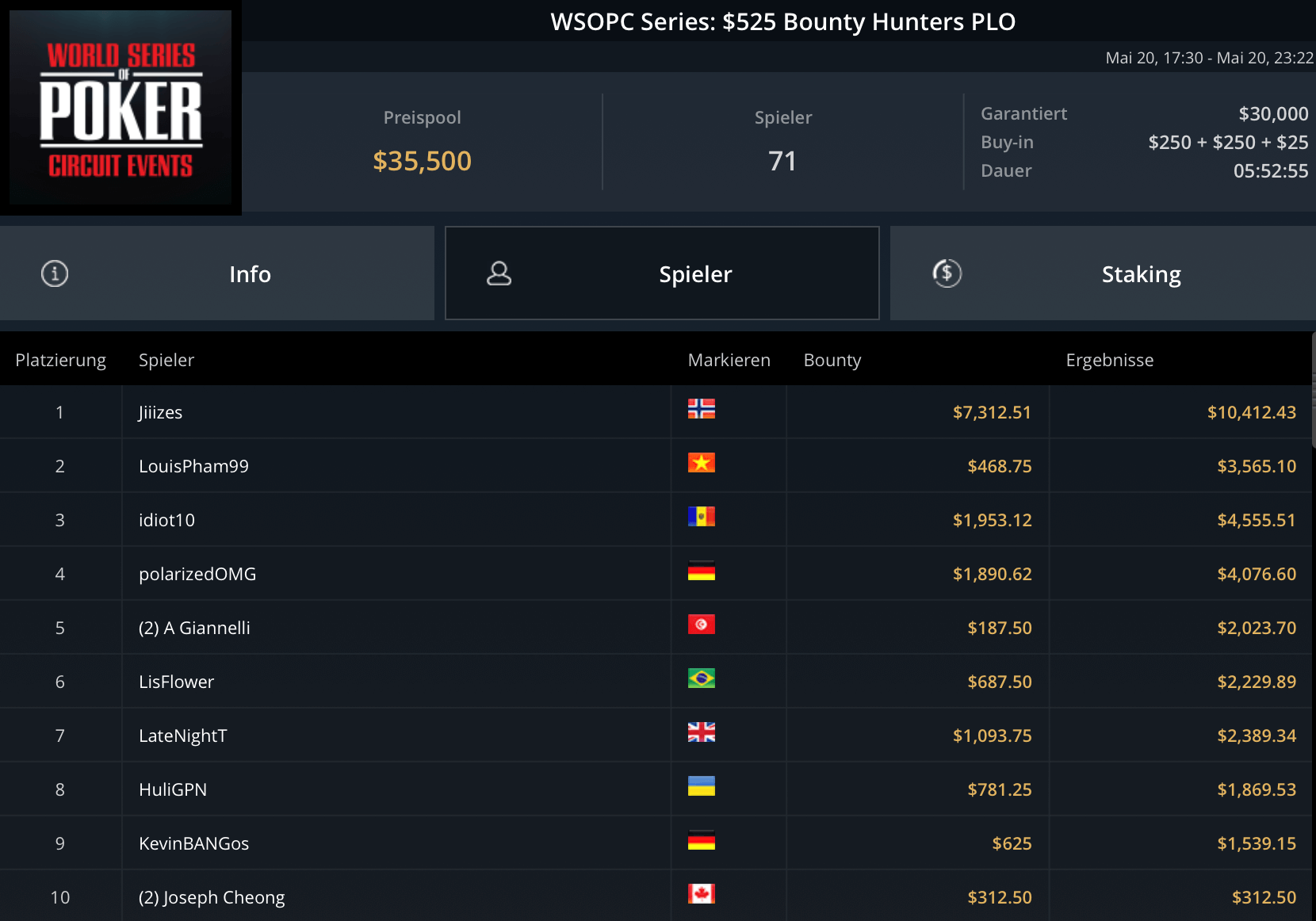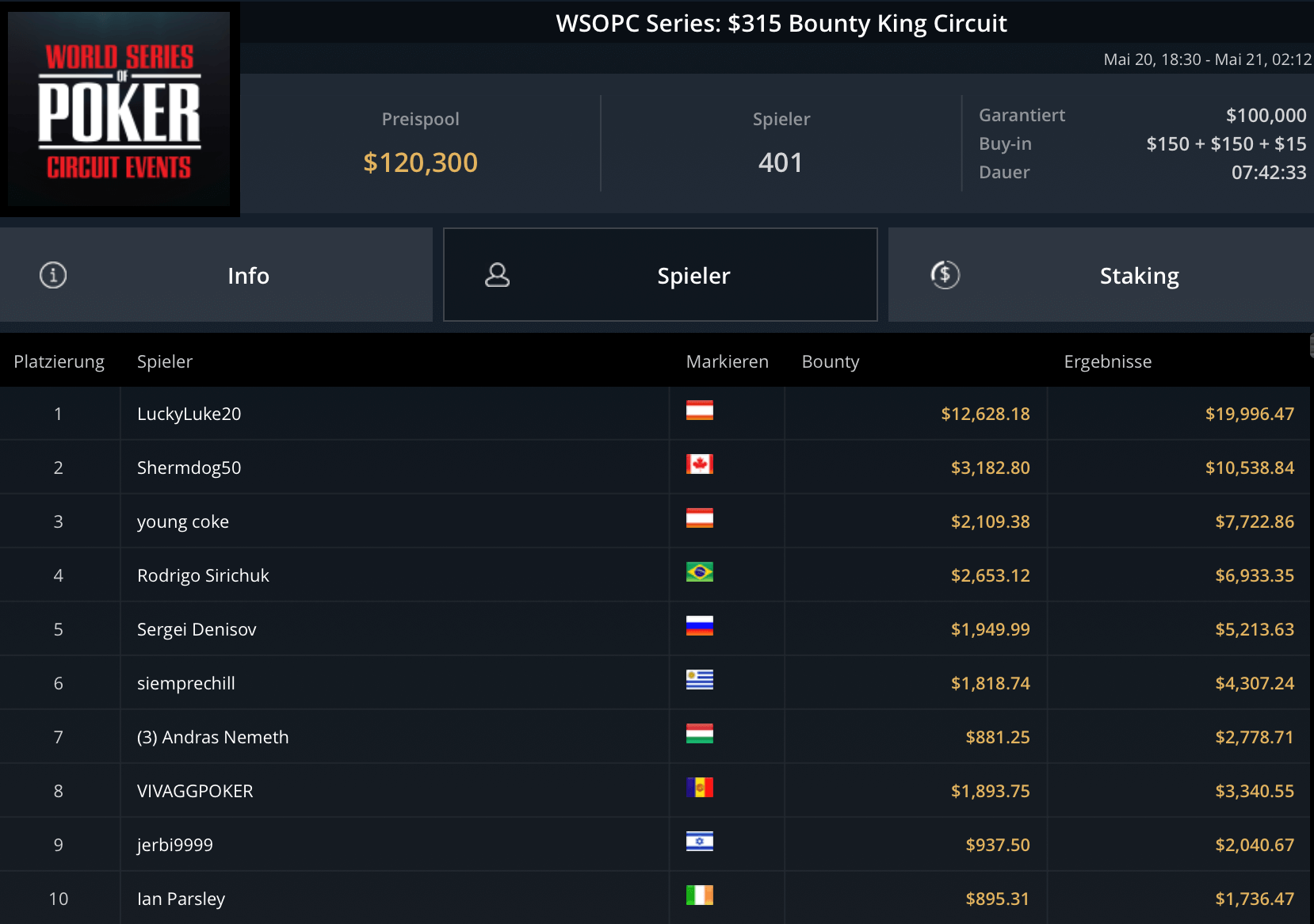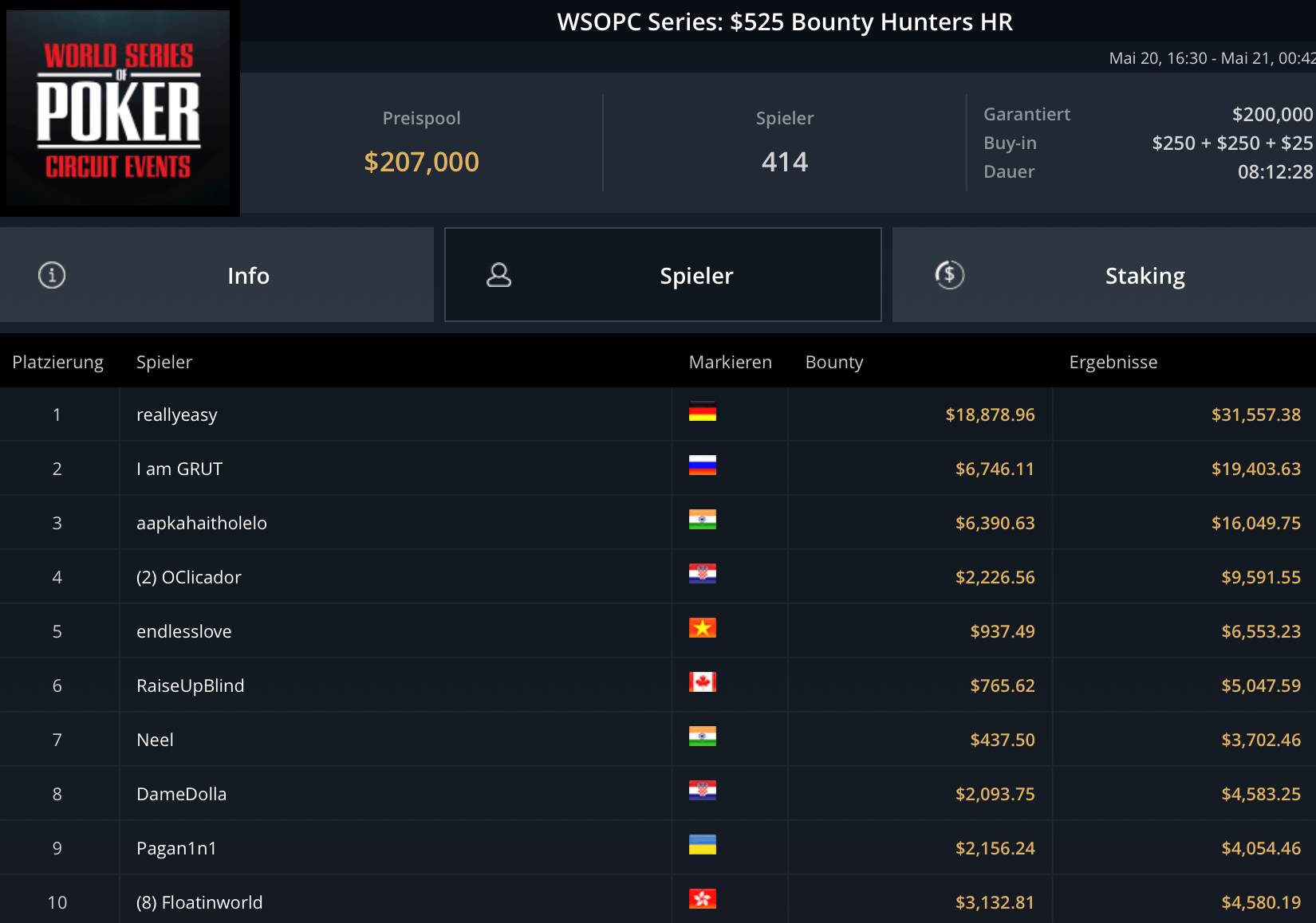 Mit „LuckyLuke20“, „reallyeasy“ und „buttonko“ wurden drei unbekannte DACH-Spieler große Sieger am WSOPC-Donnerstag. „reallyeasy“ aus Deutschland schnappte sich den Sieg beim mit $207.000 Preispool dotierten $525 Bounty Hunters HR für $31.557 inklusive Bounties. „LuckyLuke20“ gewann das $315 Bounty King Circuit gegen 400 gegnerische Entries für $19.996. „buttonko“ raste an der Spielerschaft beim $250 Daily Main vorbei – $20.217 war die Belohnung für den Sieg im 469-Entry starken Turnier.