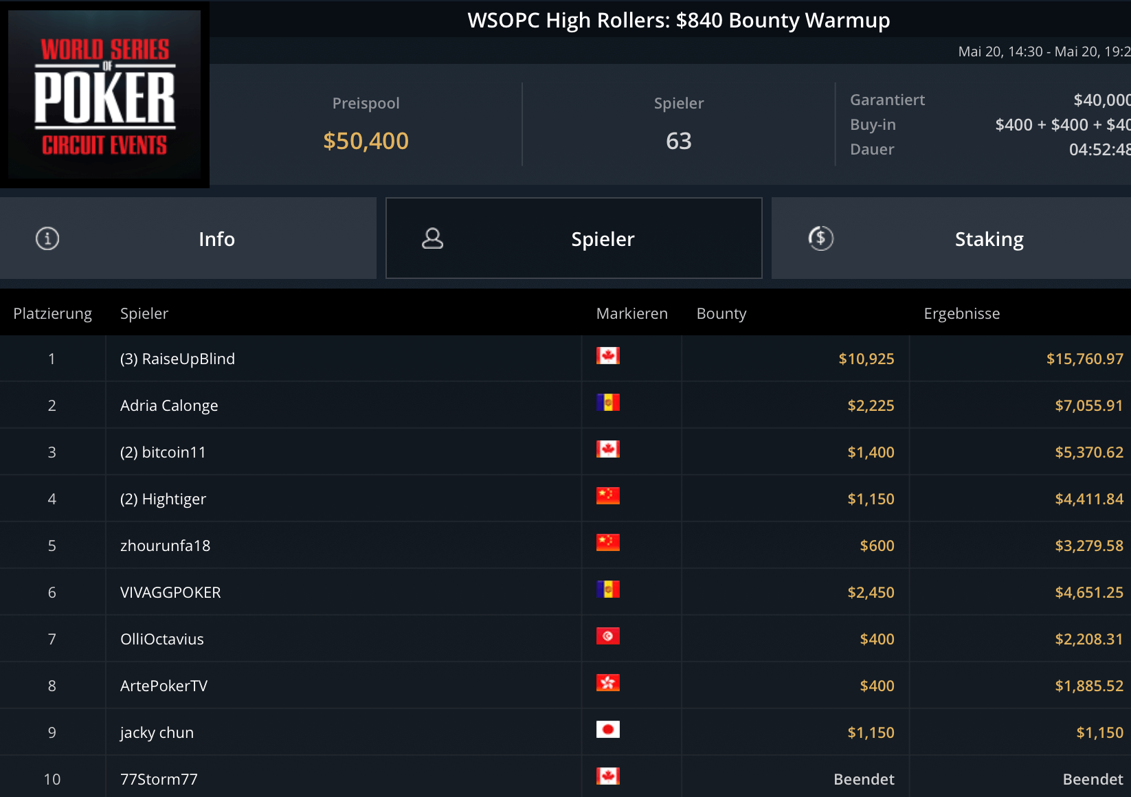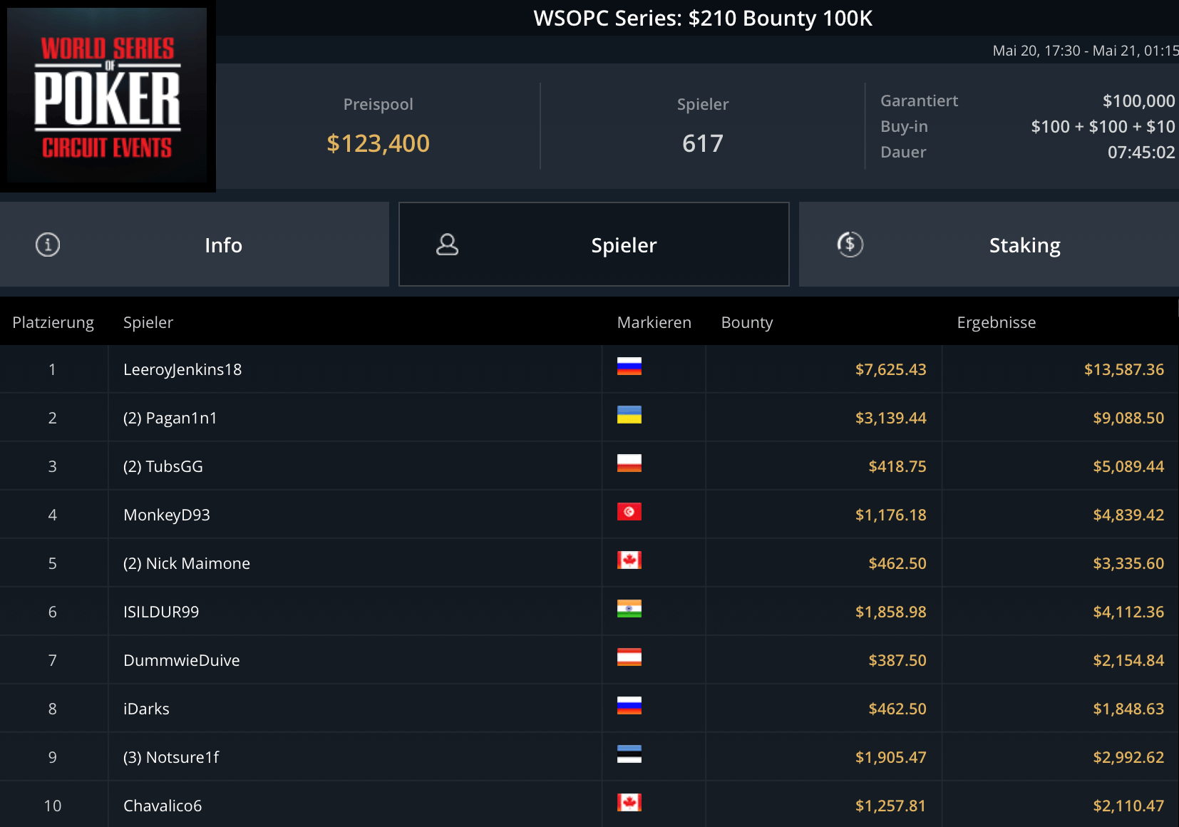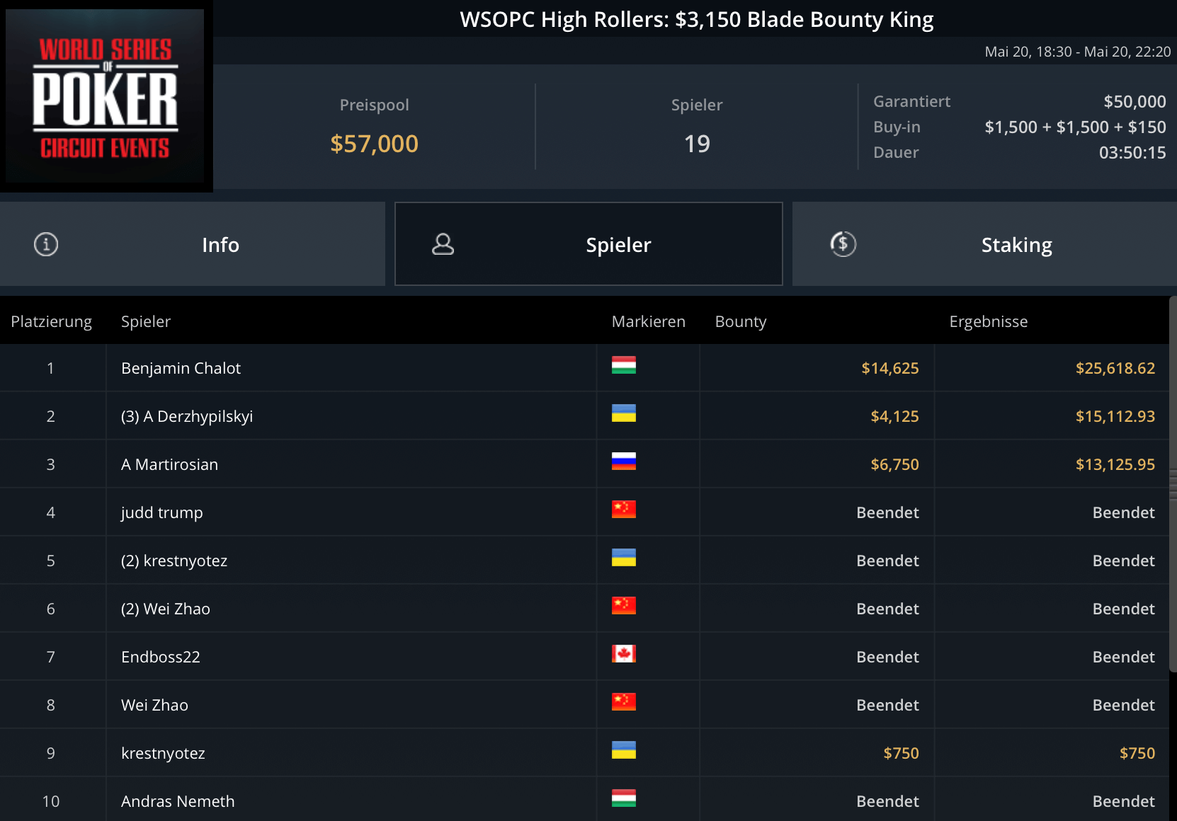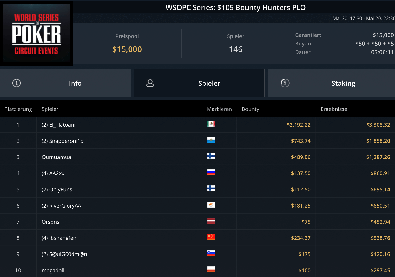 Mit „LuckyLuke20“, „reallyeasy“ und „buttonko“ wurden drei unbekannte DACH-Spieler große Sieger am WSOPC-Donnerstag. „reallyeasy“ aus Deutschland schnappte sich den Sieg beim mit $207.000 Preispool dotierten $525 Bounty Hunters HR für $31.557 inklusive Bounties. „LuckyLuke20“ gewann das $315 Bounty King Circuit gegen 400 gegnerische Entries für $19.996. „buttonko“ raste an der Spielerschaft beim $250 Daily Main vorbei – $20.217 war die Belohnung für den Sieg im 469-Entry starken Turnier.