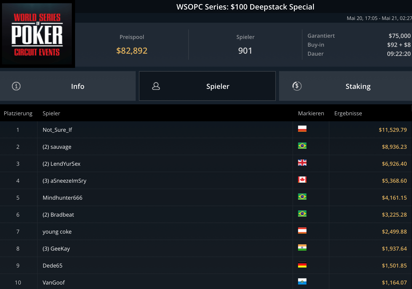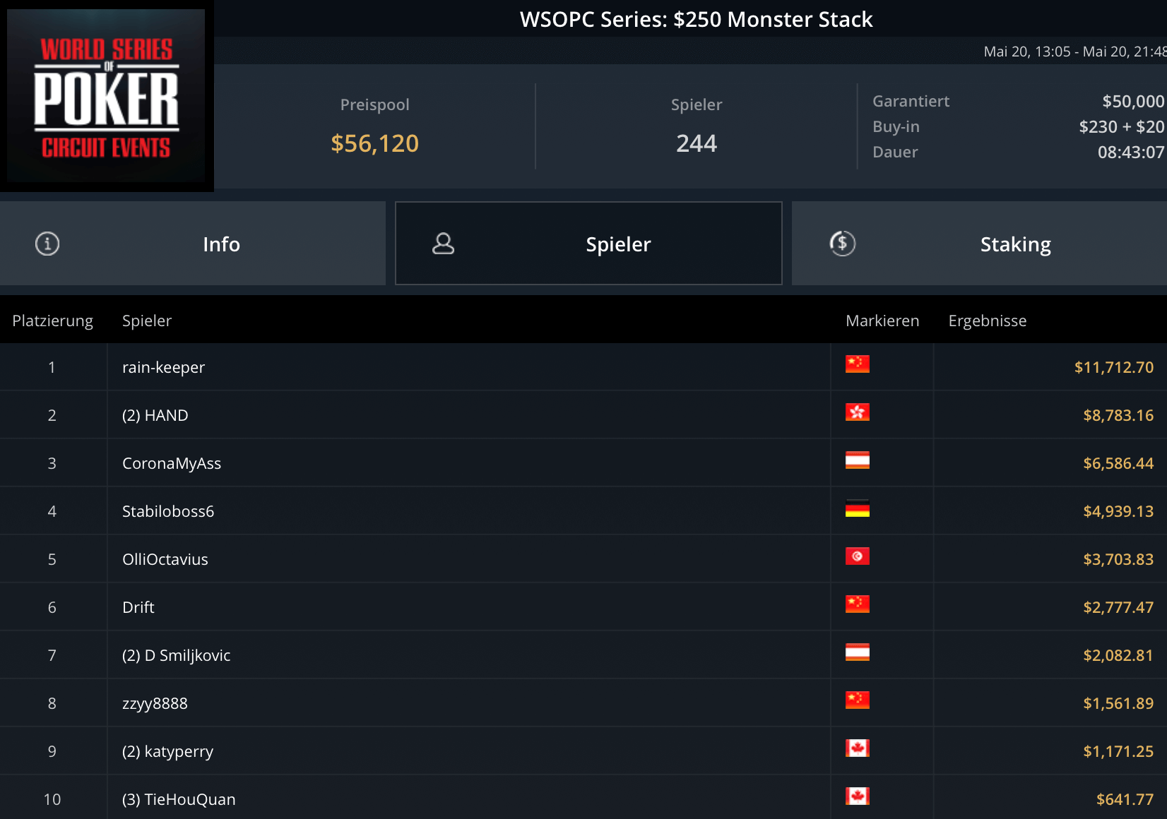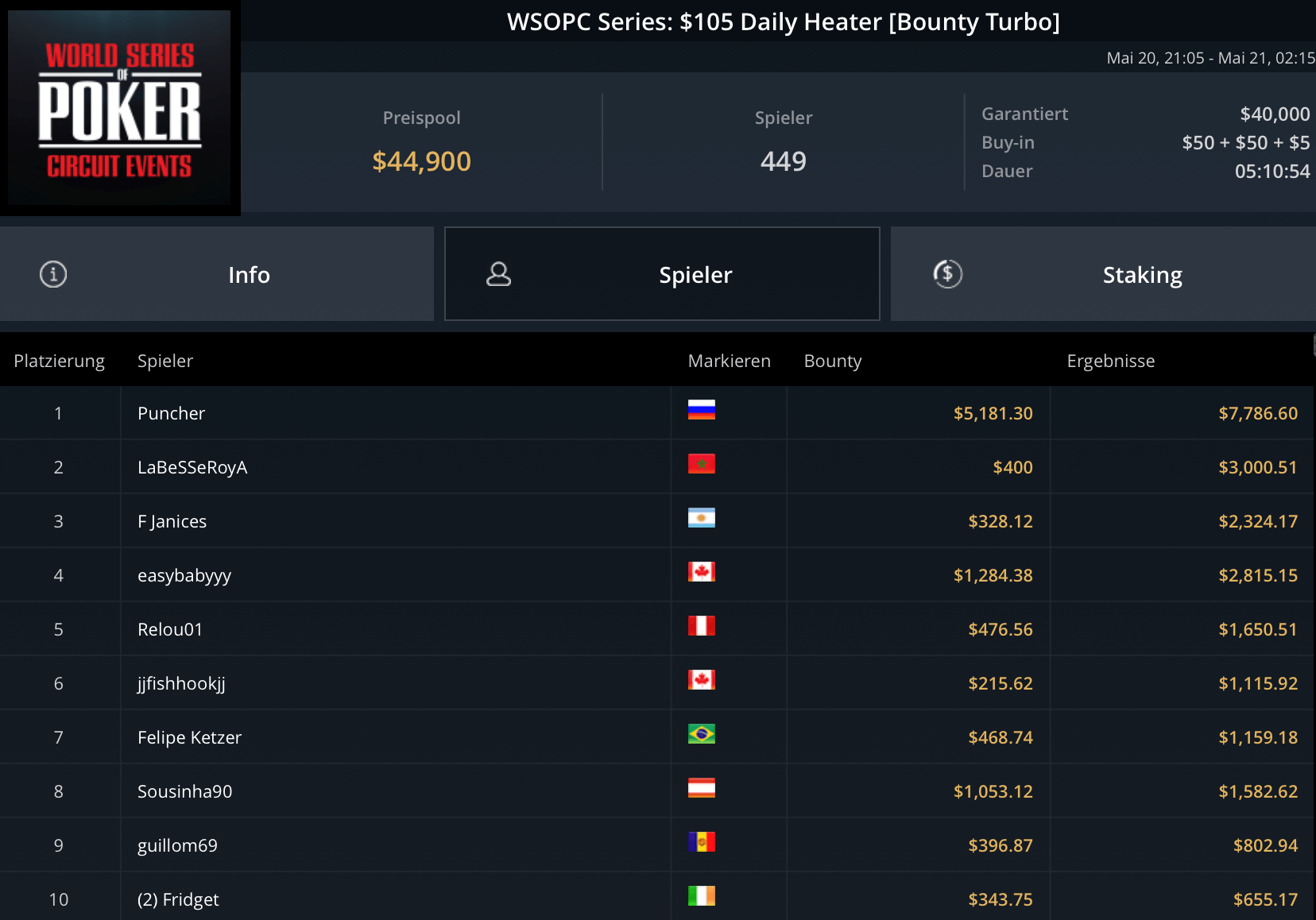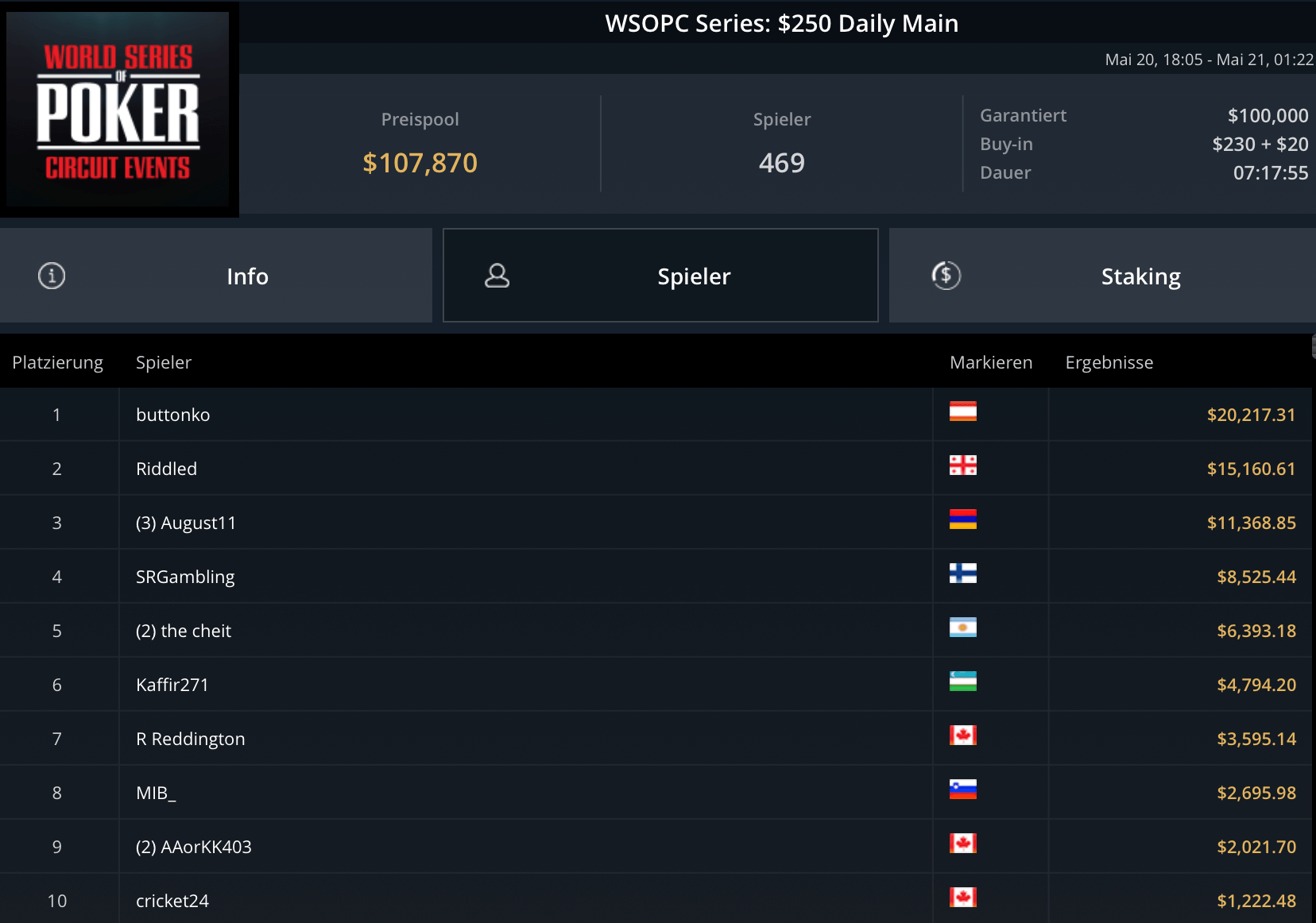 Mit „LuckyLuke20“, „reallyeasy“ und „buttonko“ wurden drei unbekannte DACH-Spieler große Sieger am WSOPC-Donnerstag. „reallyeasy“ aus Deutschland schnappte sich den Sieg beim mit $207.000 Preispool dotierten $525 Bounty Hunters HR für $31.557 inklusive Bounties. „LuckyLuke20“ gewann das $315 Bounty King Circuit gegen 400 gegnerische Entries für $19.996. „buttonko“ raste an der Spielerschaft beim $250 Daily Main vorbei – $20.217 war die Belohnung für den Sieg im 469-Entry starken Turnier.