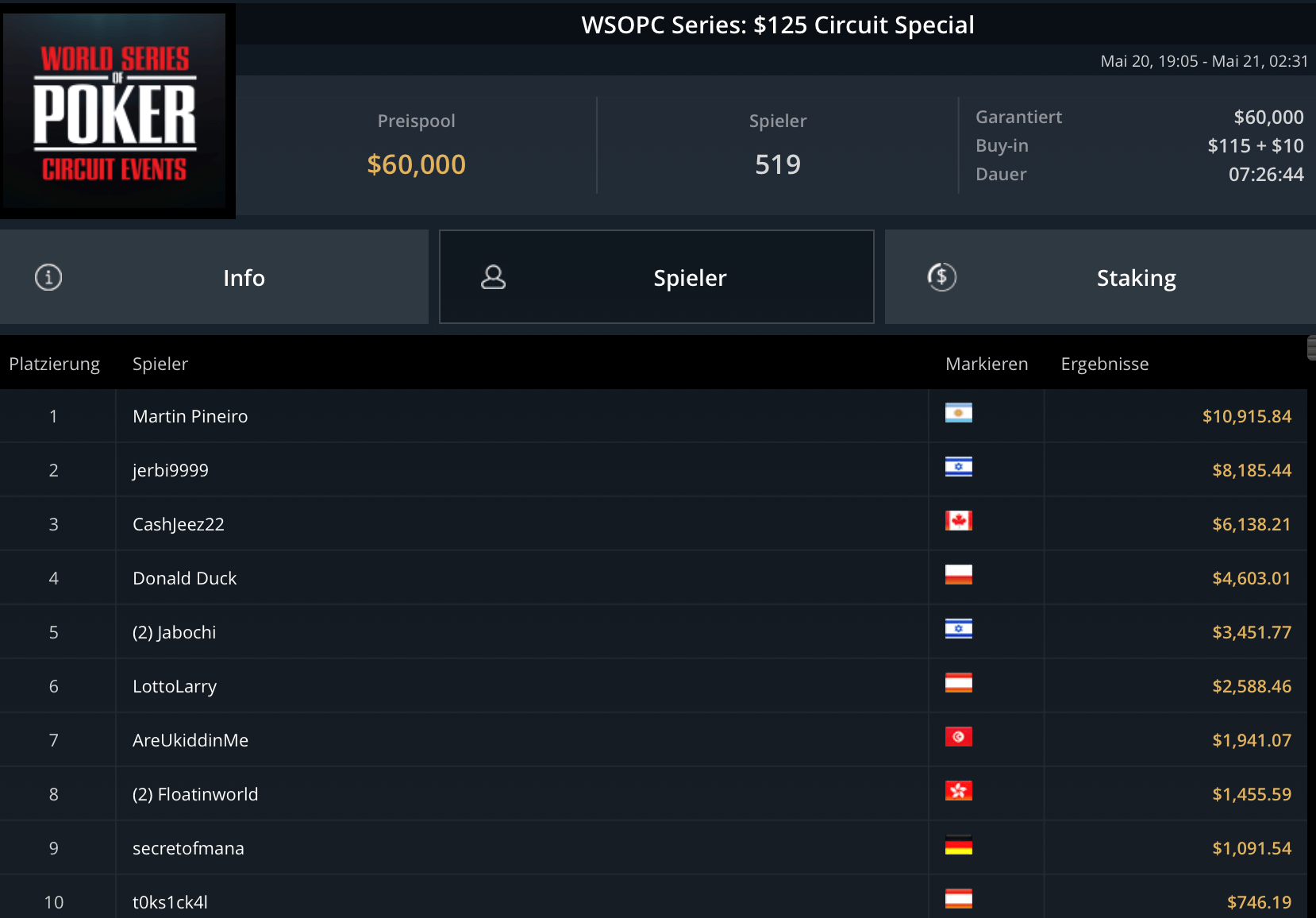 Auch Martin Pineiro konnte ein Turnier für sich entscheiden: Das $125 Circuit Special ging an den argentinischen Profi für $10.915. Hier ging es bei 519 Entries um die garantierten $60.000. Leonard „LottoLarry“ Maue wurde in diesem Turnier Sechster für $2.588.