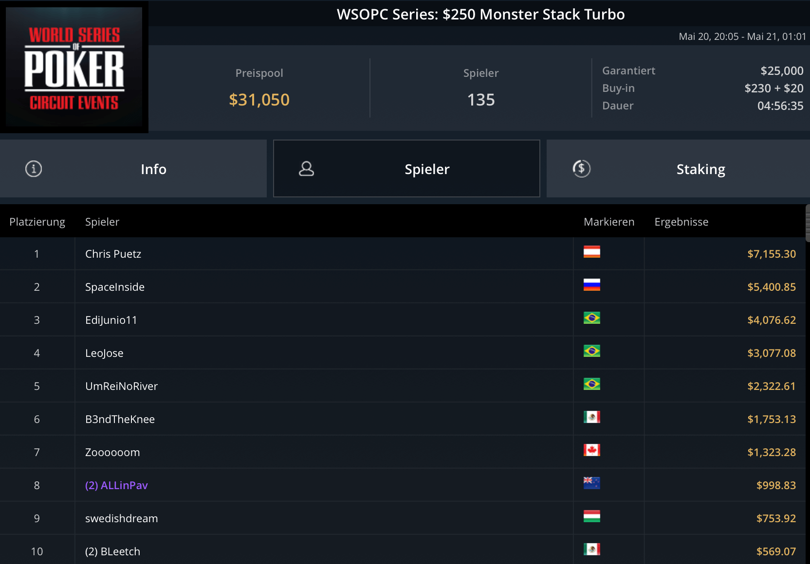 WPT-Champion Chris Pütz konnte sich beim $250 Monster Stack Turbo durchsetzen. 135 Spieler waren hier angetreten und sorgten für $31.050 Preispool. Nach knapp 5h war Pütz um die Siegprämie von $7.155 reicher.