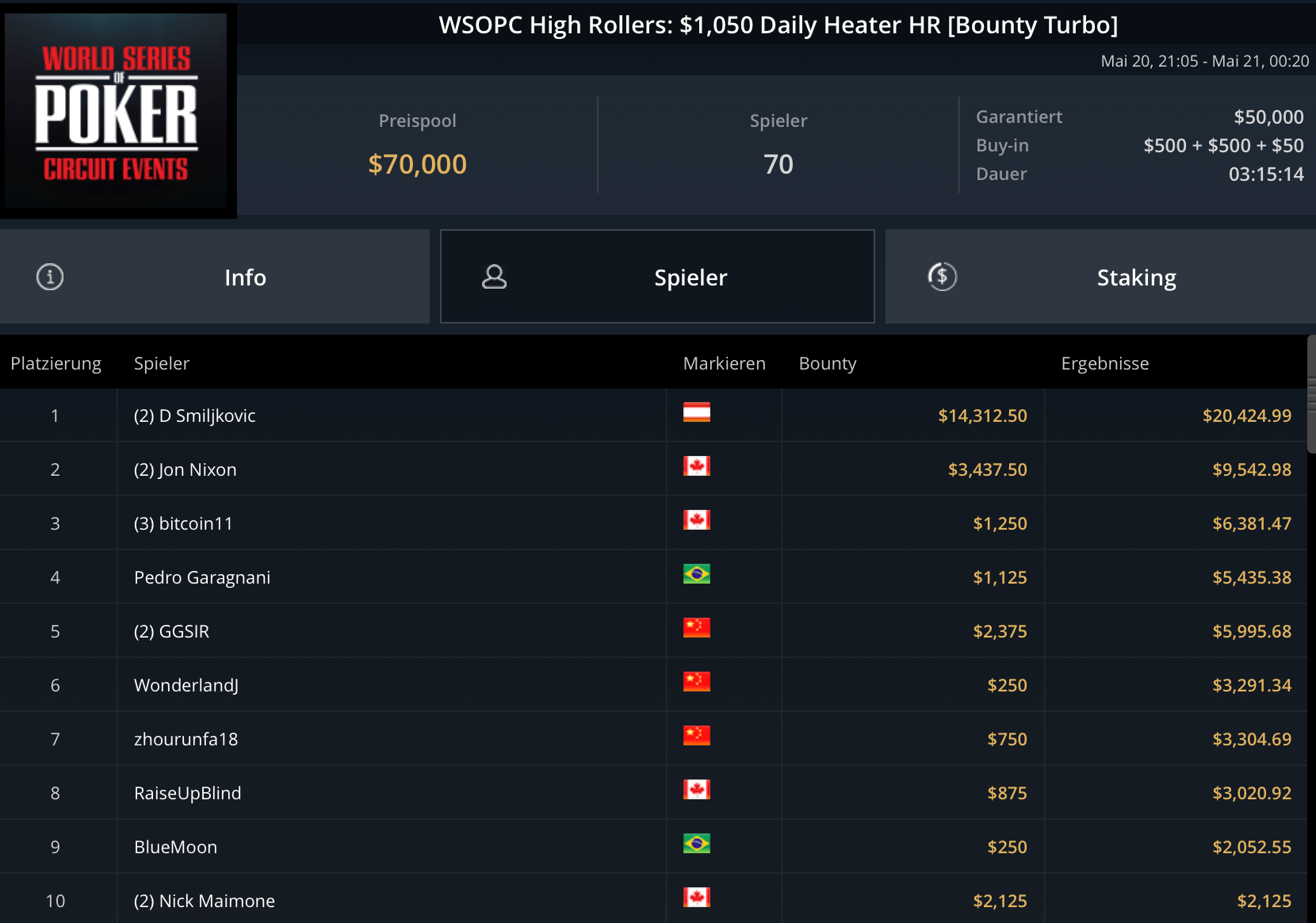 Daniel Smiljkovic schnappte sich den Sieg des WSOPC $1.050 Daily Heater HR, einem Bounty Turbo. Er setzte sich gegen 68 gegnerische Entries mit seiner zweiten Bullet durch und wurde mit $20.424 belohnt. Jon Nixon wurde Zweiter für weniger als die Hälfte – $9.542 gab es für den Runner-Up.