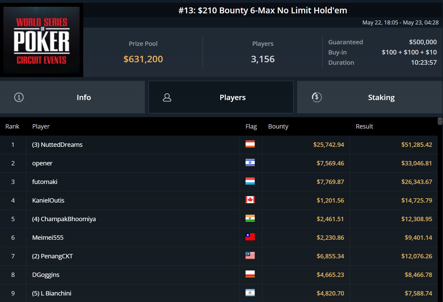 Beim einzigen Ring-Event des Tages, dem $210 Bounty 6-Max, setzte sich „NuttedDreams“ aus Österreich gegen 3.155 Konkurrenten durch und gewann mehr als $51.000 Preisgeld.