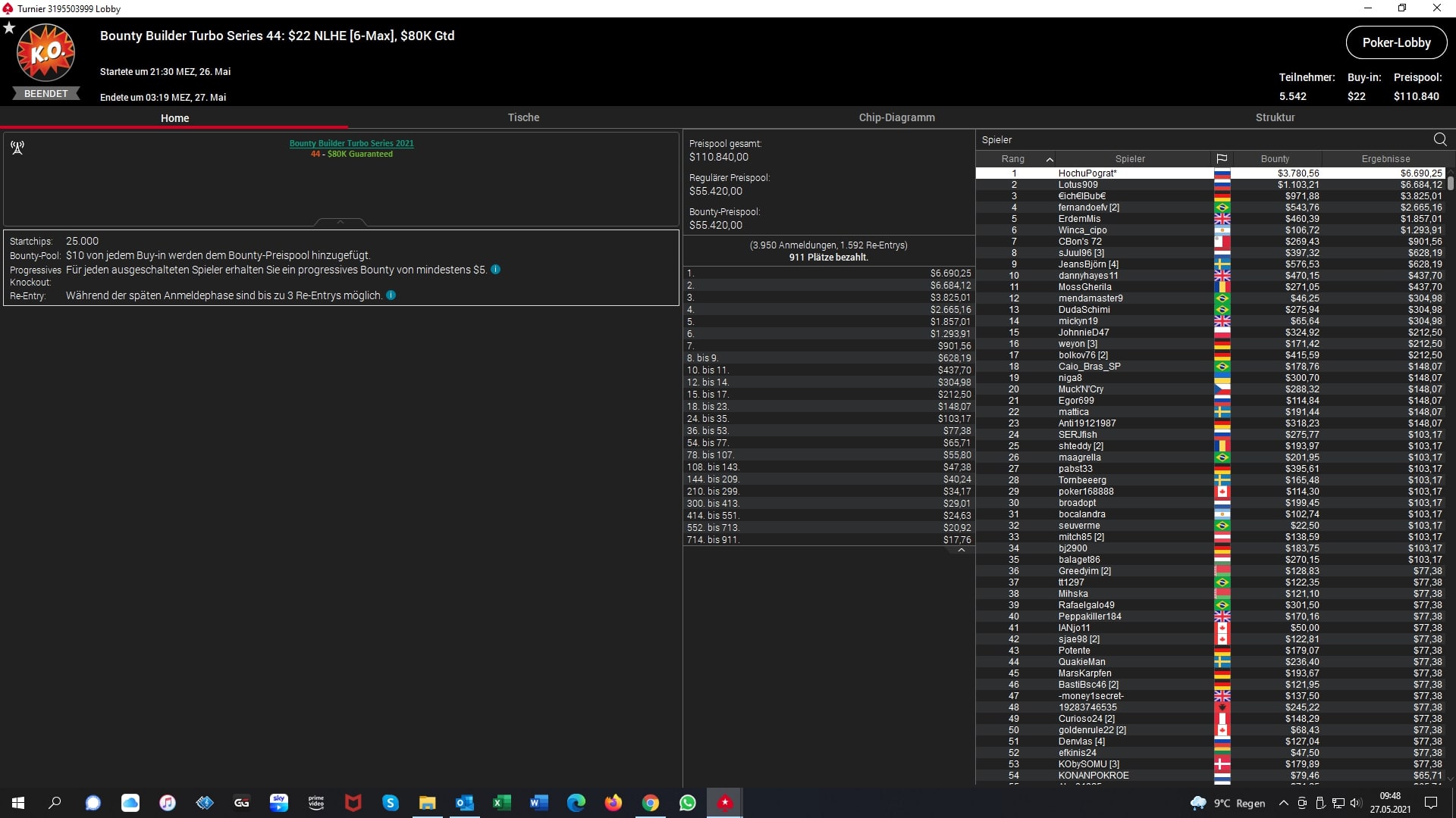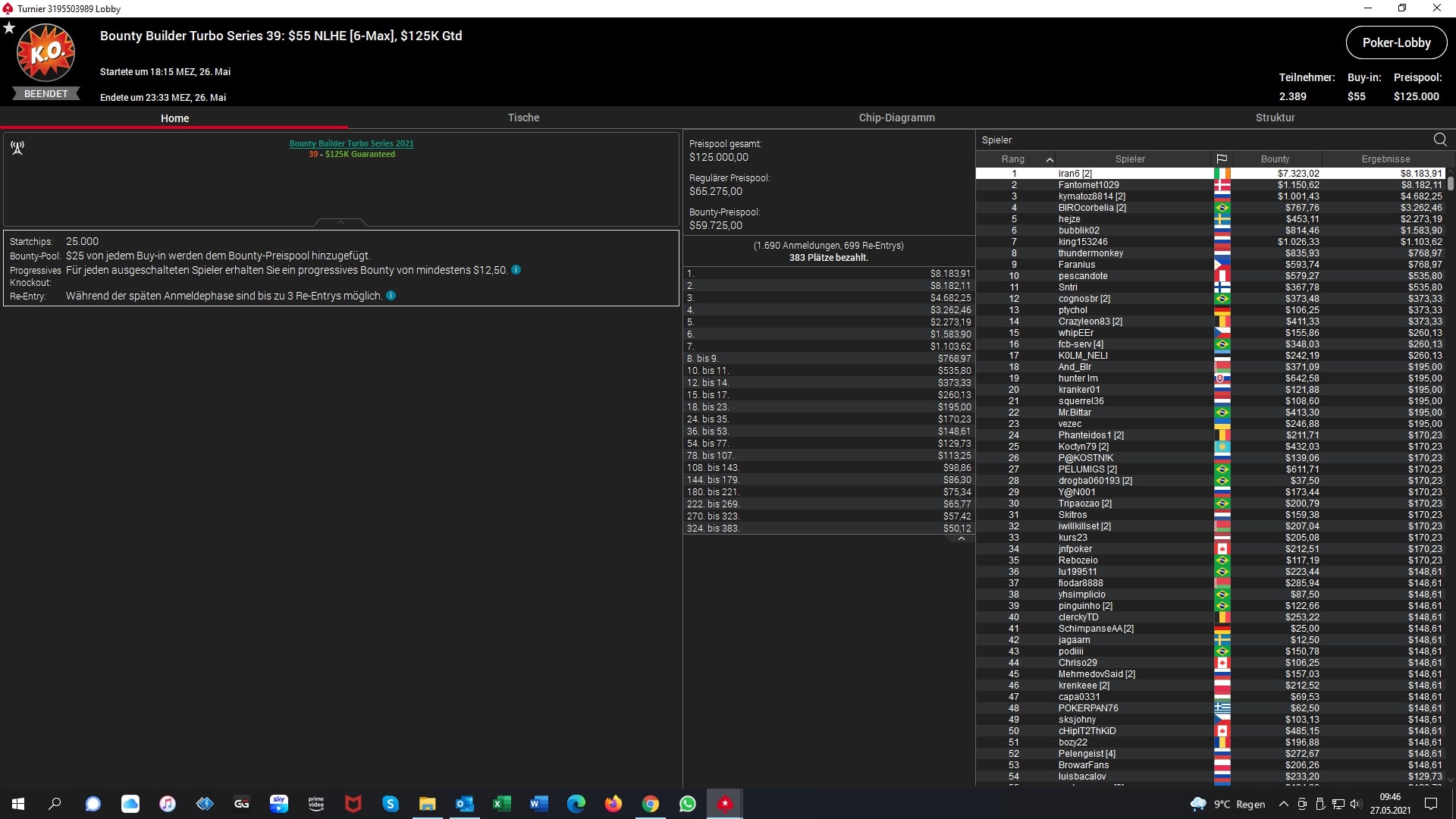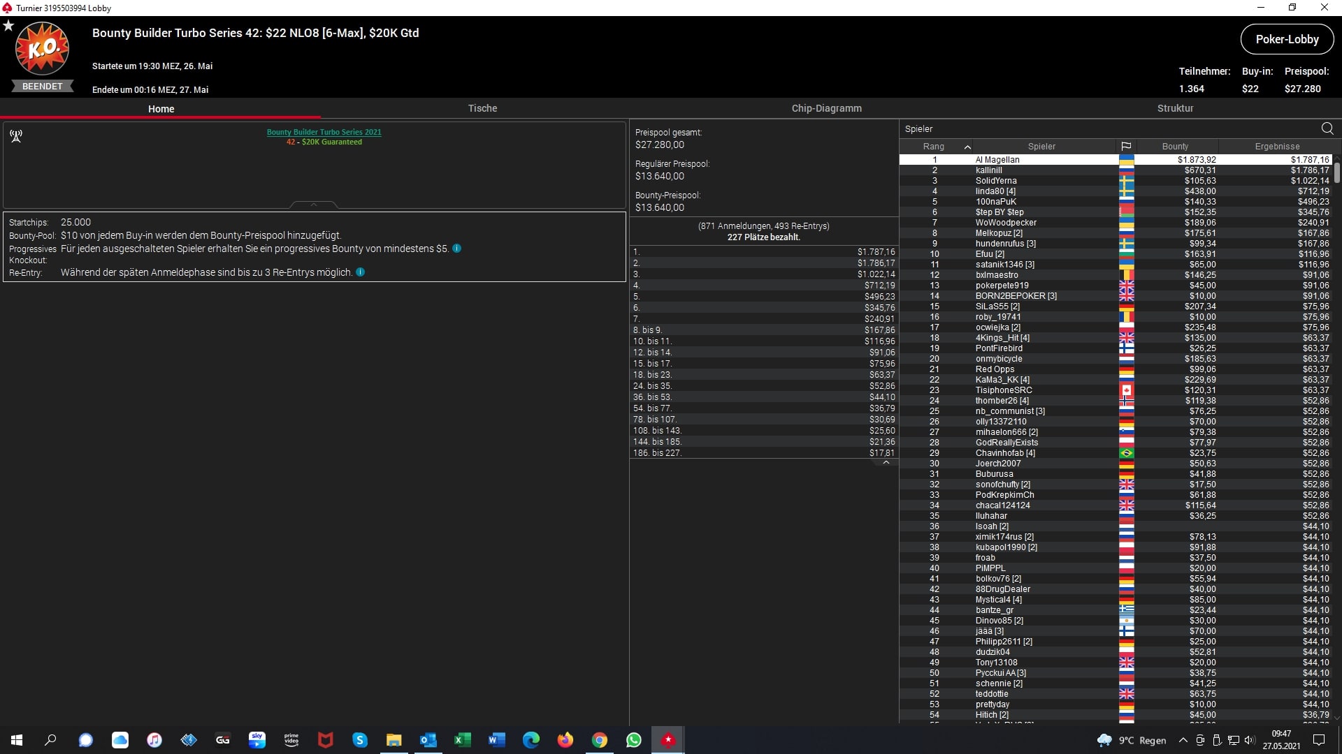 Bronze gab es dann noch für „€ich€IBub€“ (GER) beim $22 NLHE 6-Max für $3.825 + $971 Bounties.